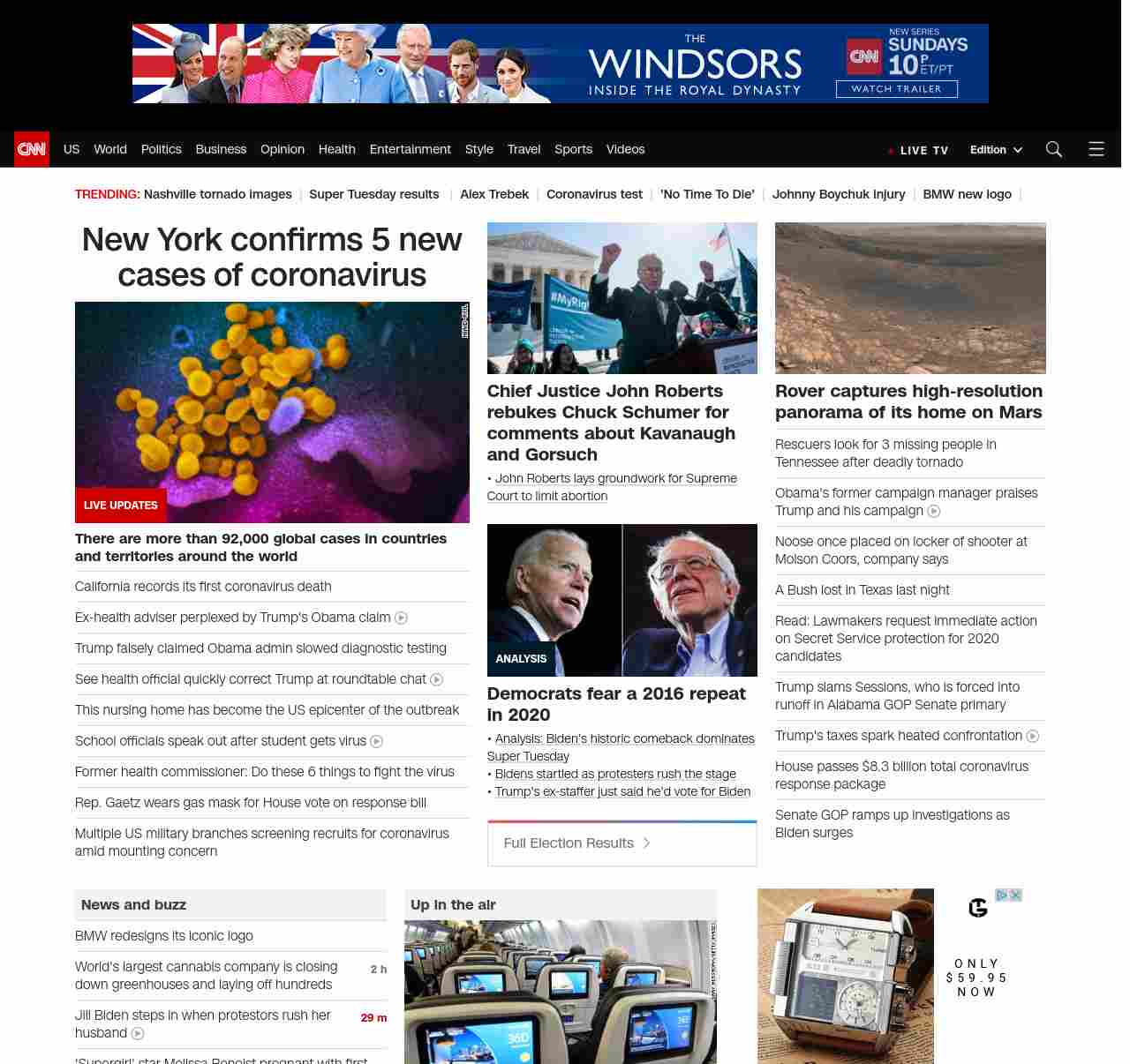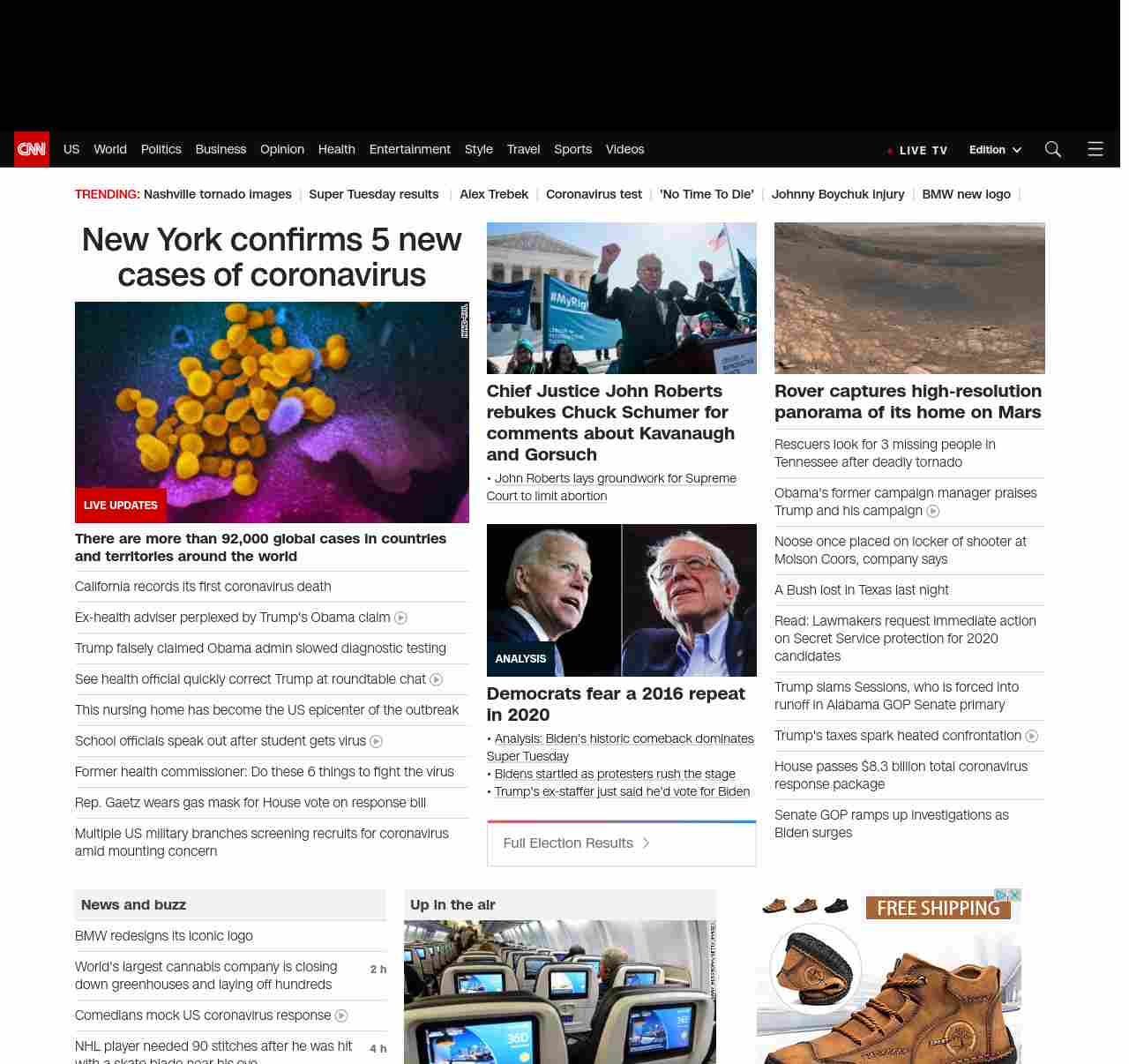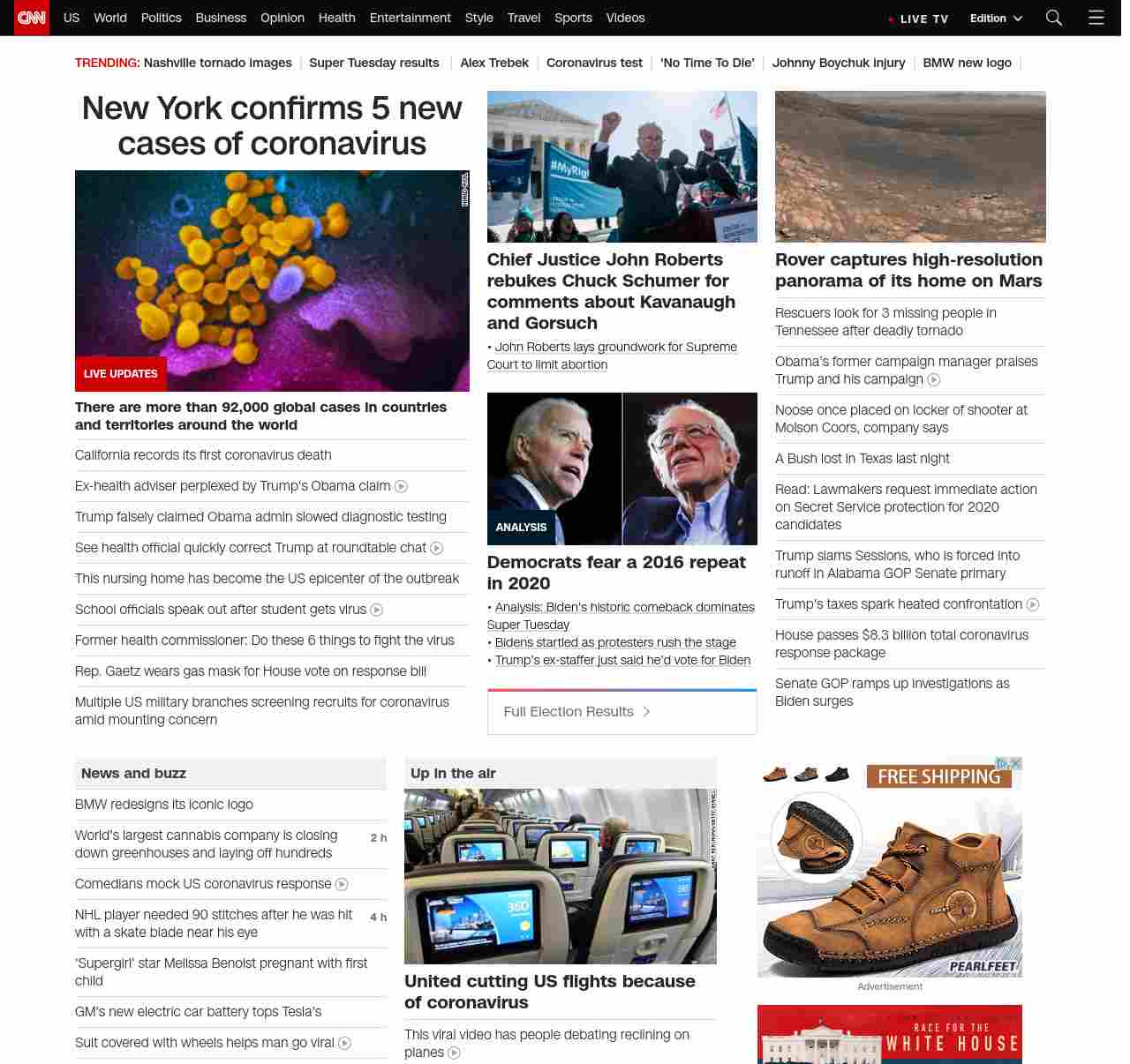|| screaming-banner-text banner-text-size–char-47″ data-analytics=”_list-hierarchical-xs_hyperlink_”> New York confirms 5 new cases of coronavirus ||” , title: “CNN – Breaking News, Latest News and Videos” , siblings: {“articleList”:[{“uri”:”/2020/03/04/health/us-coronavirus-update-wednesday/index.html”,”headline”:”California records its first coronavirus death”,”thumbnail”:”//cdn.cnn.com/cnnnext/dam/assets/200304041310-05-coronavirus-0303-seattle-small-11.jpg”,”duration”:””,”description”:”The US death toll from the coronavirusu003ca href=”https://www.cnn.com/2020/03/04/asia/novel-coronavirus-covid-19-intl-hnk/index.html” target=”_blank”> climbed to 11 Wednesdayu003c/a> as officials around the country urged local communities to think about ways to stop the virus from spreading.”,”layout”:””