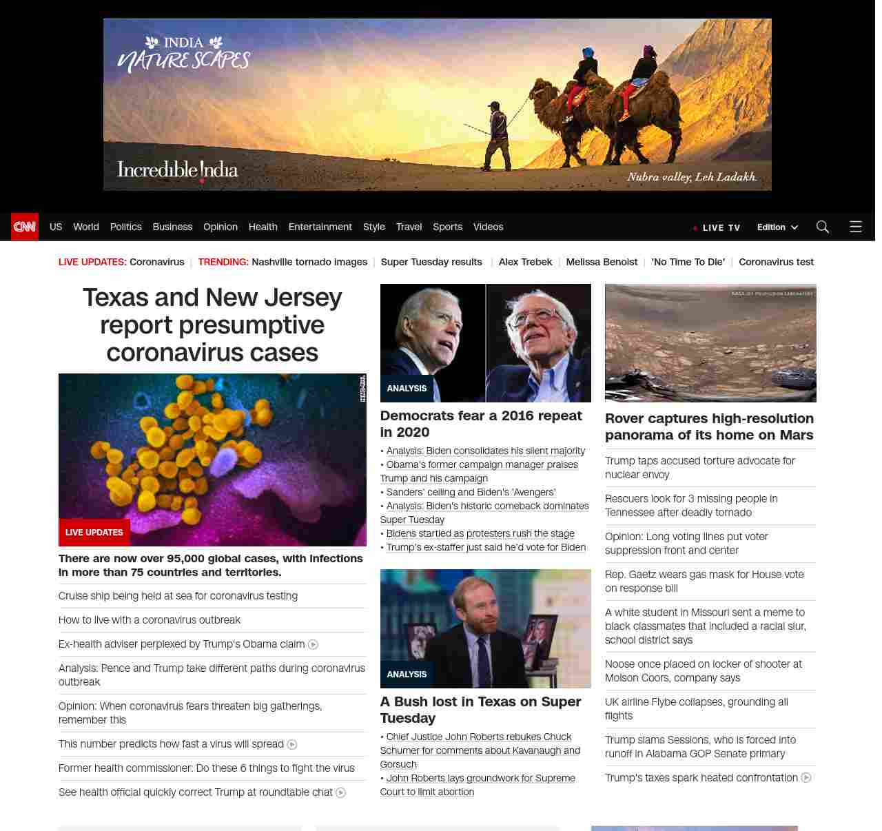 || screaming-banner-text banner-text-size–char-47″ data-analytics=”_list-hierarchical-xs_hyperlink_”> Texas and New Jersey report presumptive coronavirus cases ||” , title: “CNN – Breaking News, Latest News and Videos” , siblings: {“articleList”:[{“uri”:”/2020/03/04/health/us-coronavirus-update-wednesday/index.html”,”headline”:”Cruise ship being held at sea for coronavirus testing”,”thumbnail”:”//cdn.cnn.com/cnnnext/dam/assets/200304041310-05-coronavirus-0303-seattle-small-11.jpg”,”duration”:””,”description”:”The US death toll from the coronavirusu003ca href=”https://www.cnn.com/2020/03/04/asia/novel-coronavirus-covid-19-intl-hnk/index.html” target=”_blank”> climbed to 11 Wednesdayu003c/a> as officials around the country urged local communities to think about ways to stop the virus from spreading.”,”layout”:””
