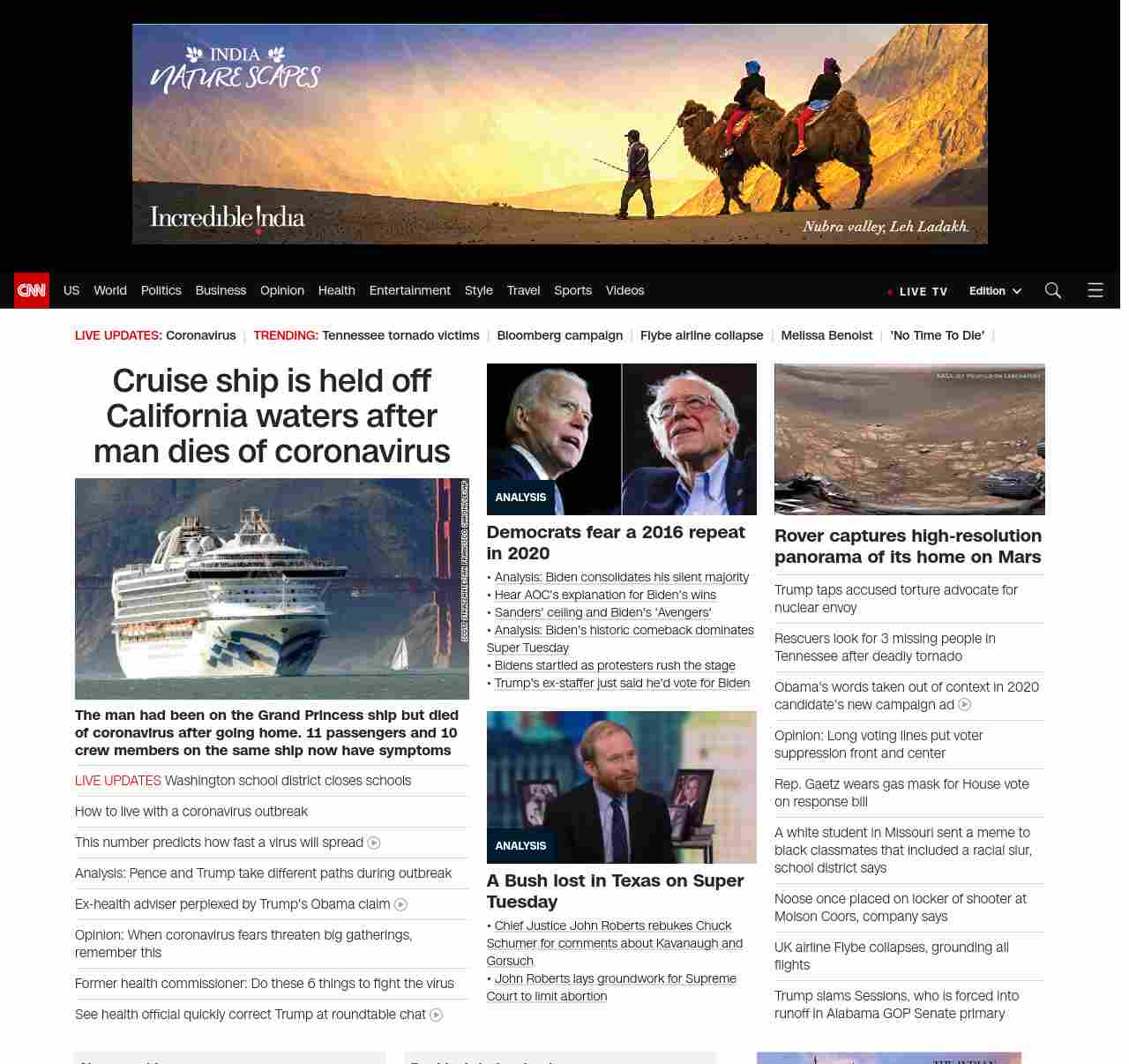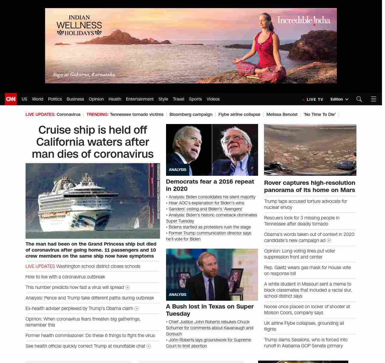 || screaming-banner-text banner-text-size–char-47″ data-analytics=”_list-hierarchical-xs_article_”> Cruise ship is held off California waters after man dies of coronavirus ||” , title: “CNN – Breaking News, Latest News and Videos” , siblings: {“articleList”:[{“uri”:”/2020/03/05/health/california-coronavirus-cruise-ship-thursday/index.html”,”headline”:”u003cstrong>The man had been on the Grand Princess ship but died of coronavirus after going home. 11 passengers and 10 crew members on the same ship now have symptomsu003c/strong>”,”thumbnail”:”//cdn.cnn.com/cnnnext/dam/assets/200304200128-grand-princess-cruise-ship-file-small-11.jpg”,”duration”:””,”description”:””,”layout”:””