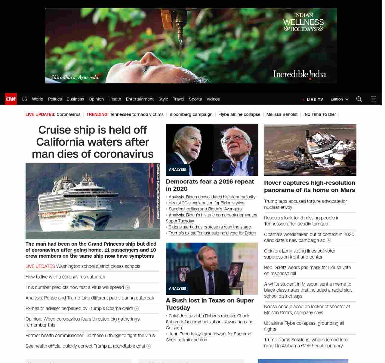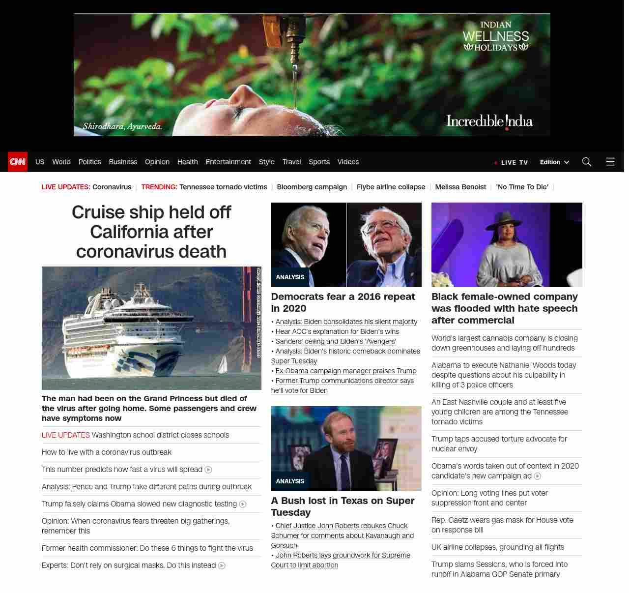 || screaming-banner-text banner-text-size–char-47″ data-analytics=”_list-hierarchical-xs_article_”> Cruise ship is held off California waters after man dies of coronavirus ||” , title: “CNN – Breaking News, Latest News and Videos” , siblings: {“articleList”:[{“uri”:”/2020/03/05/health/california-coronavirus-cruise-ship-thursday/index.html”,”headline”:”u003cstrong>The man had been on the Grand Princess but died of the virus after going home. Some passengers and crew have symptoms nowu003c/strong>”,”thumbnail”:”//cdn.cnn.com/cnnnext/dam/assets/200304200128-grand-princess-cruise-ship-file-small-11.jpg”,”duration”:””,”description”:””,”layout”:””
