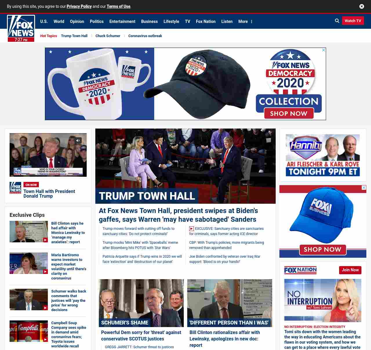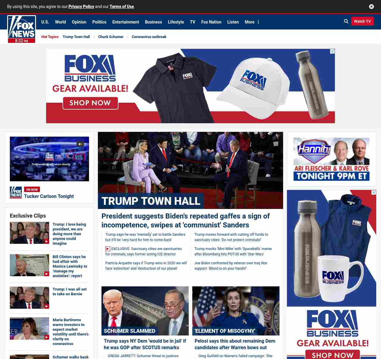 FN: [[TRUMP TOWN HALL]] At Fox News Town Hall, president swipes at Biden' s gaffes, says Warren ' may have sabotaged' Sanders ((lubuntu at wor2))