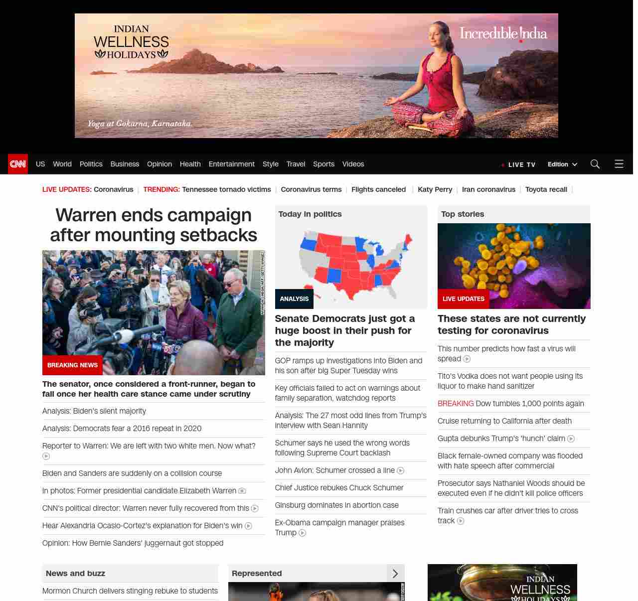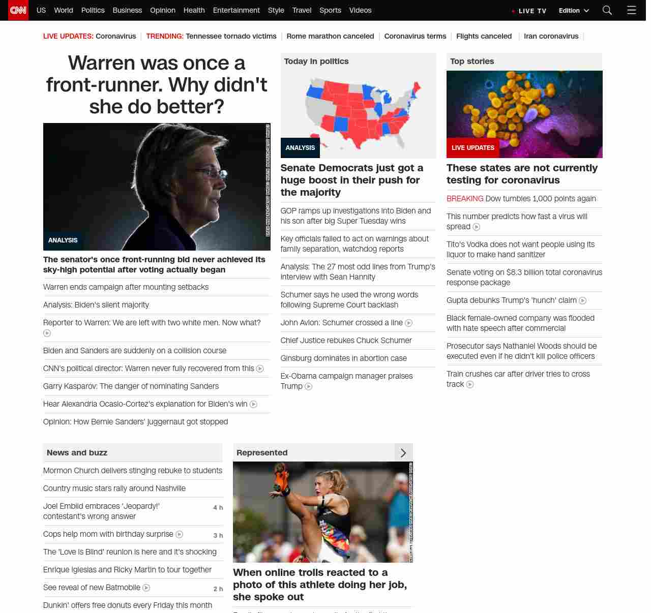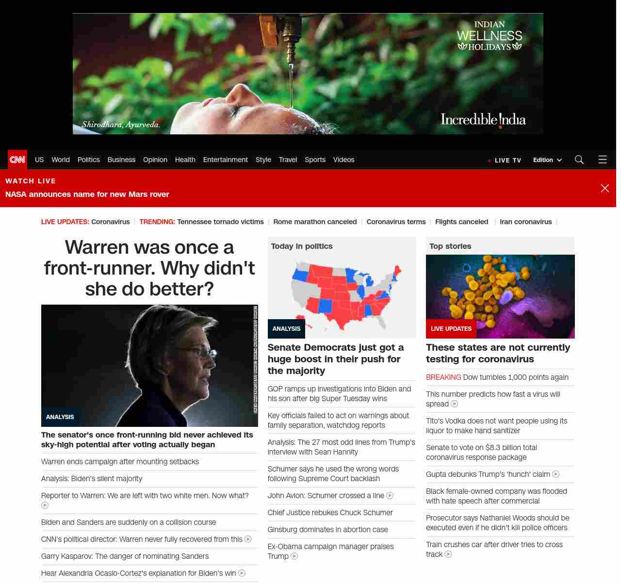 || screaming-banner-text banner-text-size–char-47″ data-analytics=”_list-hierarchical-xs_hyperlink_”> Warren ends campaign after mounting setbacks ||” , title: “CNN – Breaking News, Latest News and Videos” , siblings: {“articleList”:[{“uri”:”/2020/03/05/politics/what-matters-march-4/index.html”,”headline”:”Analysis: Biden’s silent majority”,”thumbnail”:”//cdn.cnn.com/cnnnext/dam/assets/200304152423-biden-campaign-op-ed-gergen-small-11.jpg”,”duration”:””,”description”:”The tables can turn so quickly in politics. A party that last week was literally freaking out about Sen. Bernie Sanders potentially locking up the nomination on Super Tuesday has this week coalesced around former Vice President Joe Biden, with voters across the country picking him as the centrist option and rivals rushing to out of the way.”,”layout”:””