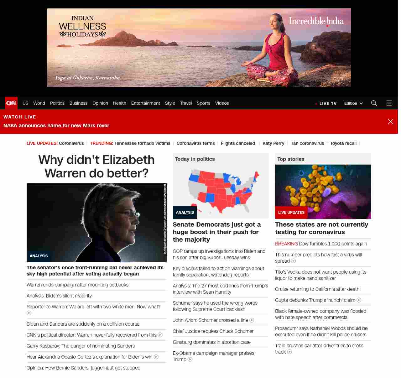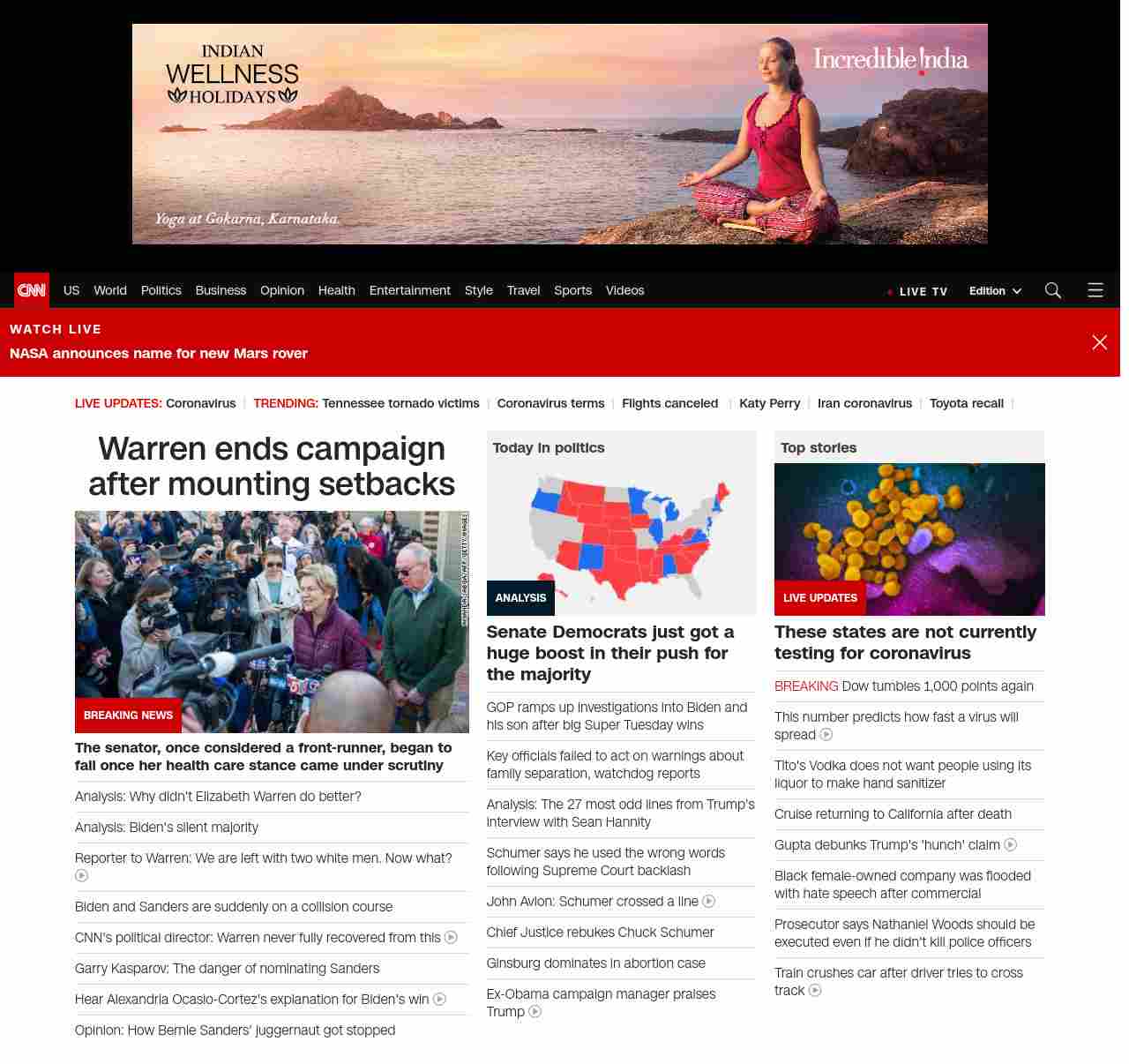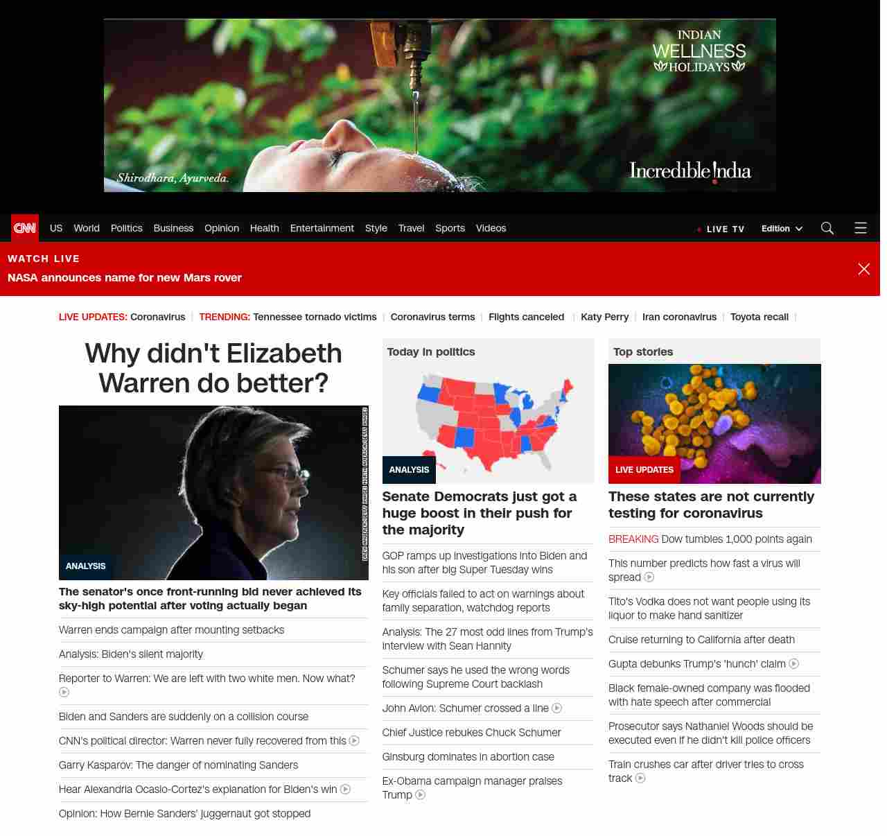 || screaming-banner-text banner-text-size–char-47″ data-analytics=”_list-hierarchical-xs_hyperlink_”> Warren ends campaign after mounting setbacks ||” , title: “CNN – Breaking News, Latest News and Videos” , siblings: {“articleList”:[{“uri”:”/2020/03/05/politics/what-matters-march-4/index.html”,”headline”:”Analysis: Biden’s silent majority”,”thumbnail”:”//cdn.cnn.com/cnnnext/dam/assets/200304152423-biden-campaign-op-ed-gergen-small-11.jpg”,”duration”:””,”description”:”The tables can turn so quickly in politics. A party that last week was literally freaking out about Sen. Bernie Sanders potentially locking up the nomination on Super Tuesday has this week coalesced around former Vice President Joe Biden, with voters across the country picking him as the centrist option and rivals rushing to out of the way.”,”layout”:””