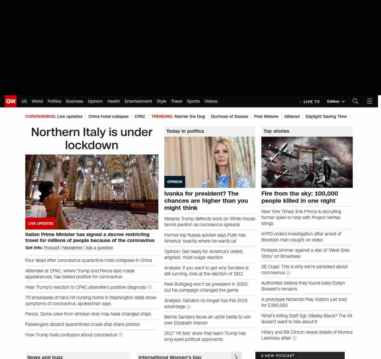 || screaming-banner-text banner-text-size–char-35″ data-analytics=”_list-hierarchical-xs_hyperlink_”> Northern Italy is under lockdown ||” , title: “CNN – Breaking News, Latest News and Videos” , siblings: {“articleList”:[{“uri”:”/2020/03/07/china/china-coronavirus-hotel-collapse/index.html”,”headline”:”Four dead after coronavirus quarantine hotel collapses in China “,”thumbnail”:”//cdn.cnn.com/cnnnext/dam/assets/200307105058-01-hotel-collapse-china-0307-small-11.jpg”,”duration”:””,”description”:”Four people died after a hotel that was being used as a coronavirus quarantine center collapsed Saturday night in southeastern China, according to China’s Ministry of Emergency Management. “,”layout”:””