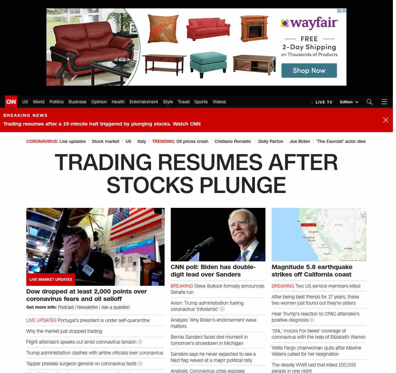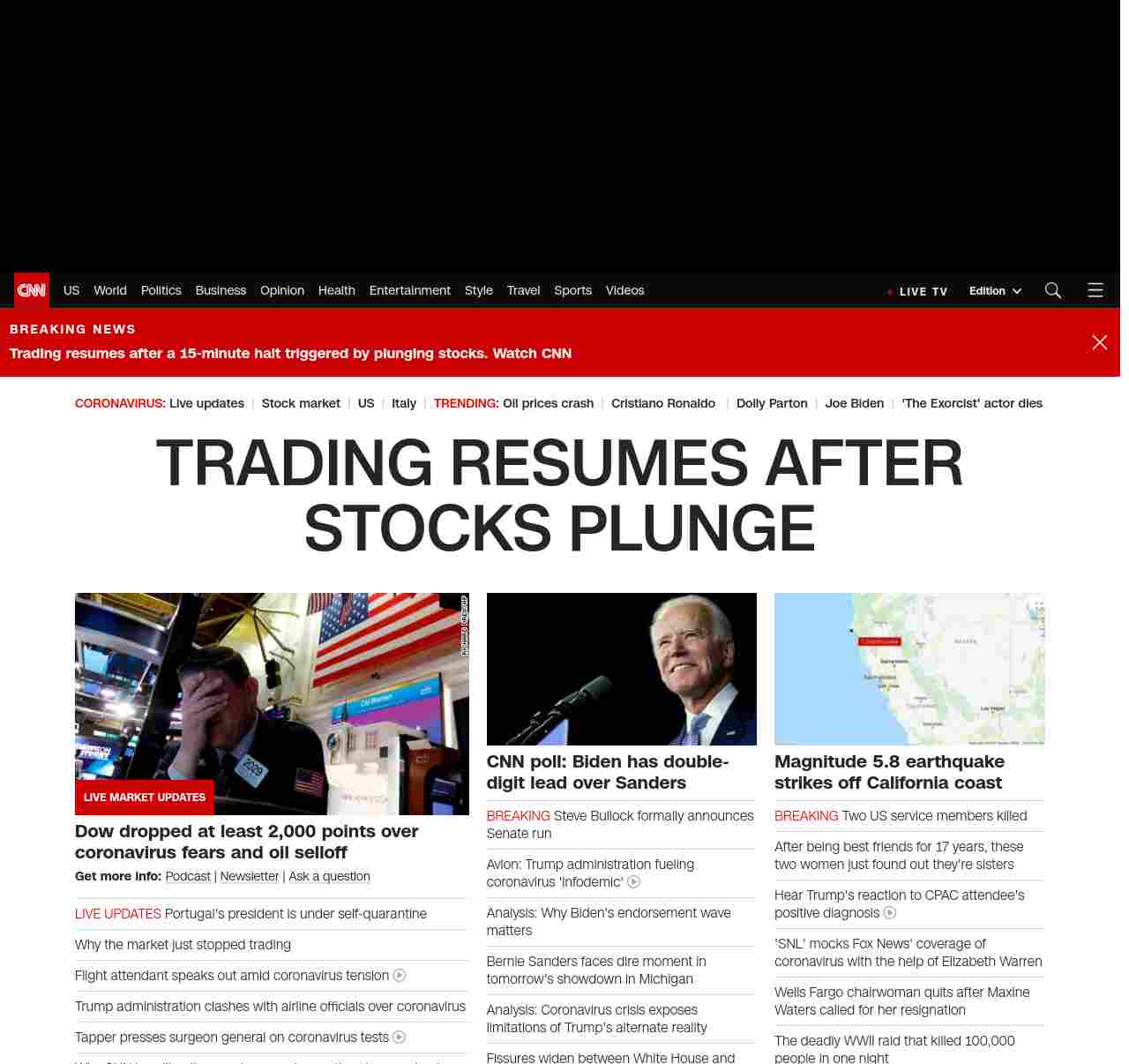 || screaming-banner-text banner-text-size–char-38-uc” data-analytics=”_list-hierarchical-xs_article_”> TRADING RESUMES AFTER STOCKS PLUNGE ||” , title: “CNN – Breaking News, Latest News and Videos” , siblings: {“articleList”:[{“uri”:”/business/live-news/stock-market-news-today-030920/index.html”,”headline”:”u003cstrong>Dow dropped at least 2,000 points over coronavirus fears and oil selloffu003c/strong>”,”thumbnail”:”//cdn.cnn.com/cnnnext/dam/assets/200309130928-09-stock-market-0309-new-york-small-11.jpg”,”duration”:””,”description”:”u003cstrong>Get more info: u003c/strong>u003ca href=”https://www.cnn.com/audio/podcasts/corona-virus” target=”_blank”>Podcastu003c/a> | u003ca href=”https://www.cnn.com/specials/coronavirus-newsletter?utm_source=hp&source=hp” target=”_blank”>Newsletteru003c/a> | u003ca href=”https://www.cnn.com/2020/03/04/us/coronavirus-town-hall-questions/index.html” target=”_blank”>Ask a question u003c/a>”,”layout”:””