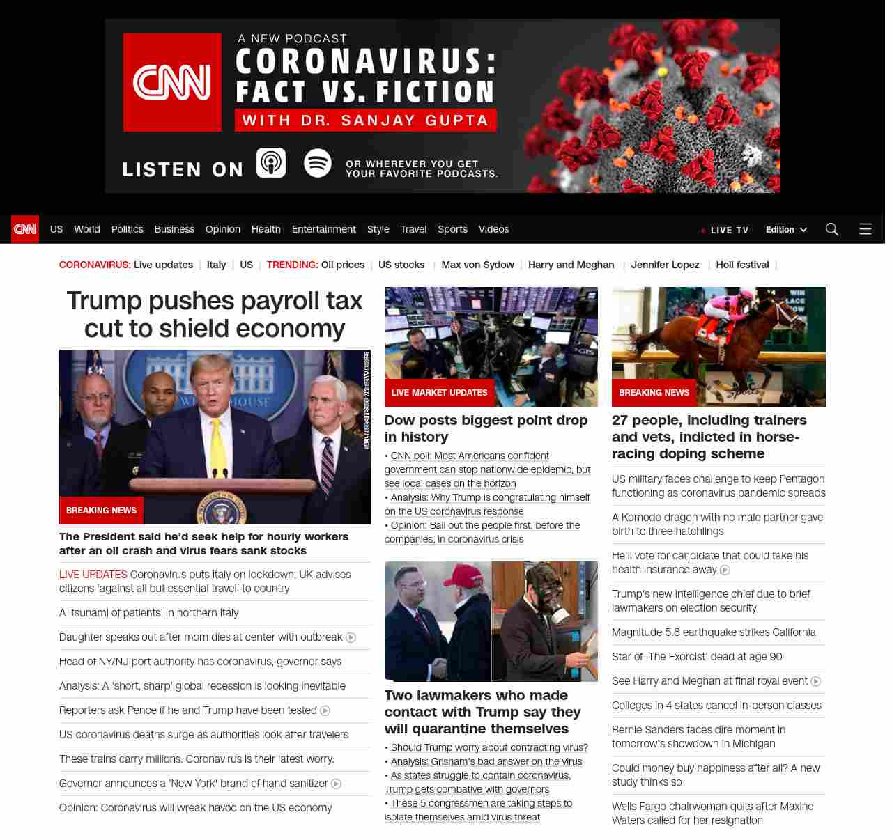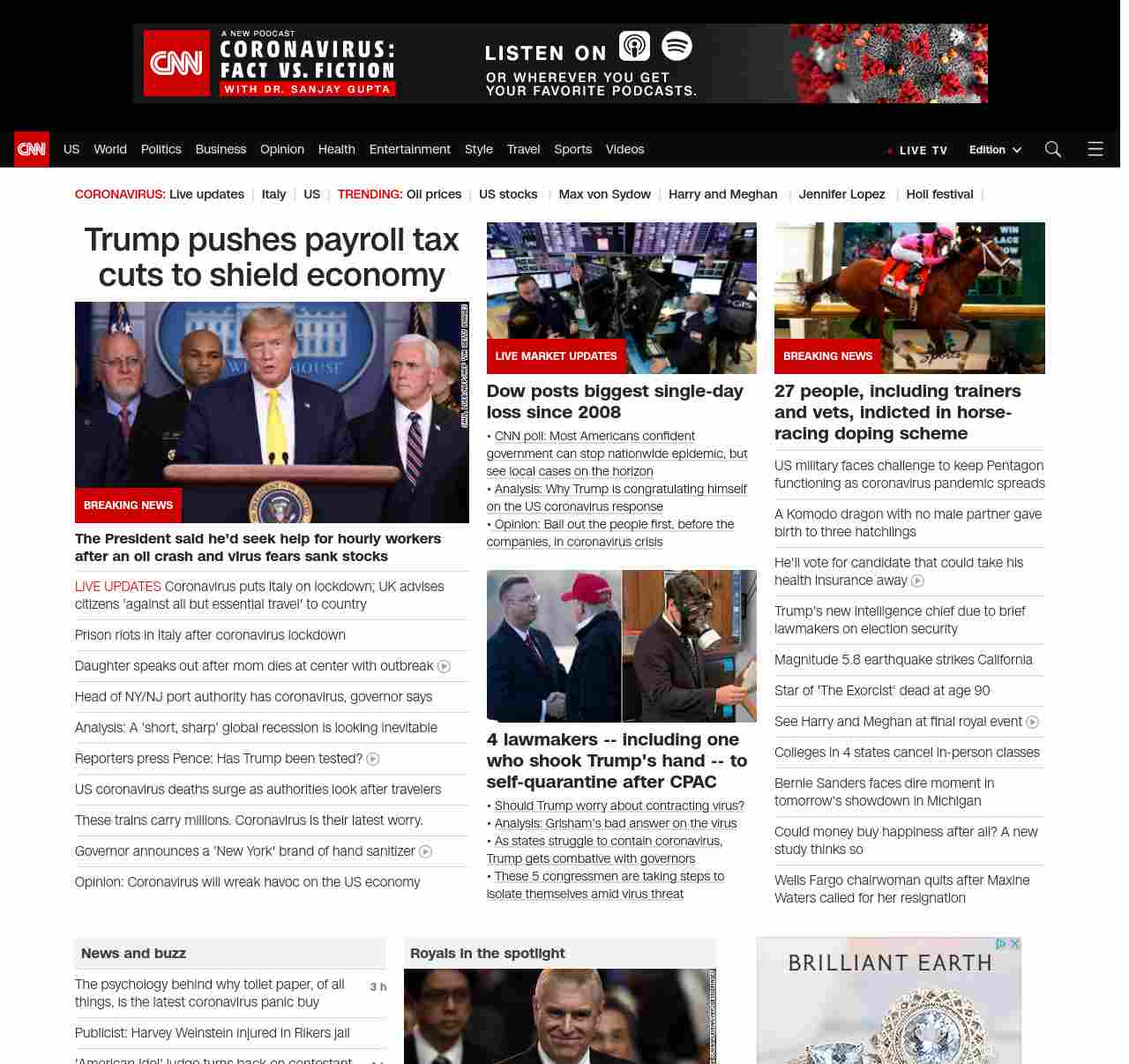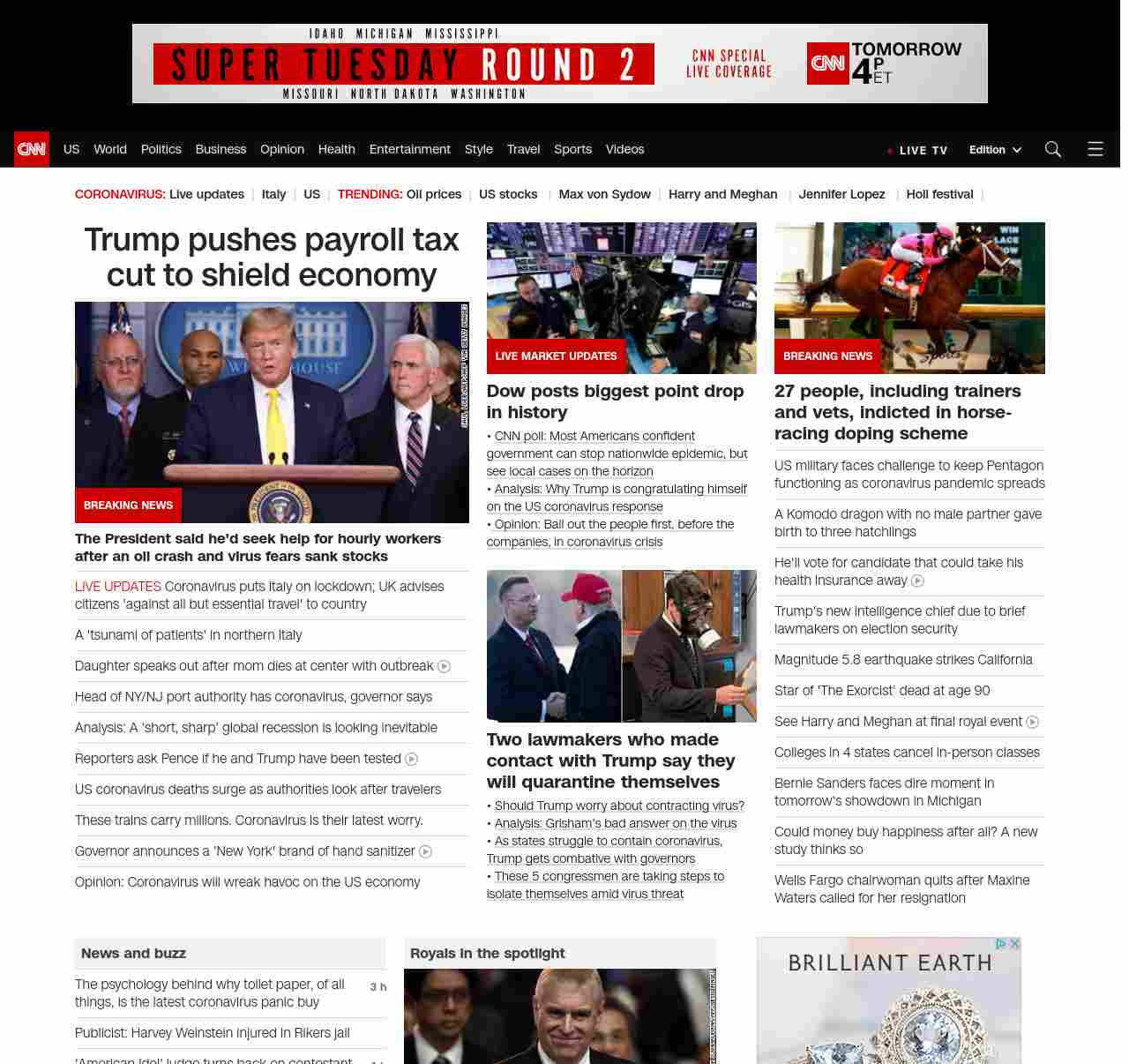 || screaming-banner-text banner-text-size–char-47″ data-analytics=”_list-hierarchical-xs_article_”> Trump pushes payroll tax cuts to shield economy ||” , title: “CNN – Breaking News, Latest News and Videos” , siblings: {“articleList”:[{“uri”:”/2020/03/09/politics/donald-trump-economic-response-markets-coronavirus/index.html”,”headline”:”u003cstrong>The President said he’d seek help for hourly workers after an oil crash and virus fears sank stocksu003c/strong>”,”thumbnail”:”//cdn.cnn.com/cnnnext/dam/assets/200309185347-02-trump-coronavirus-task-force-0309-small-11.jpg”,”duration”:””,”description”:””,”layout”:””