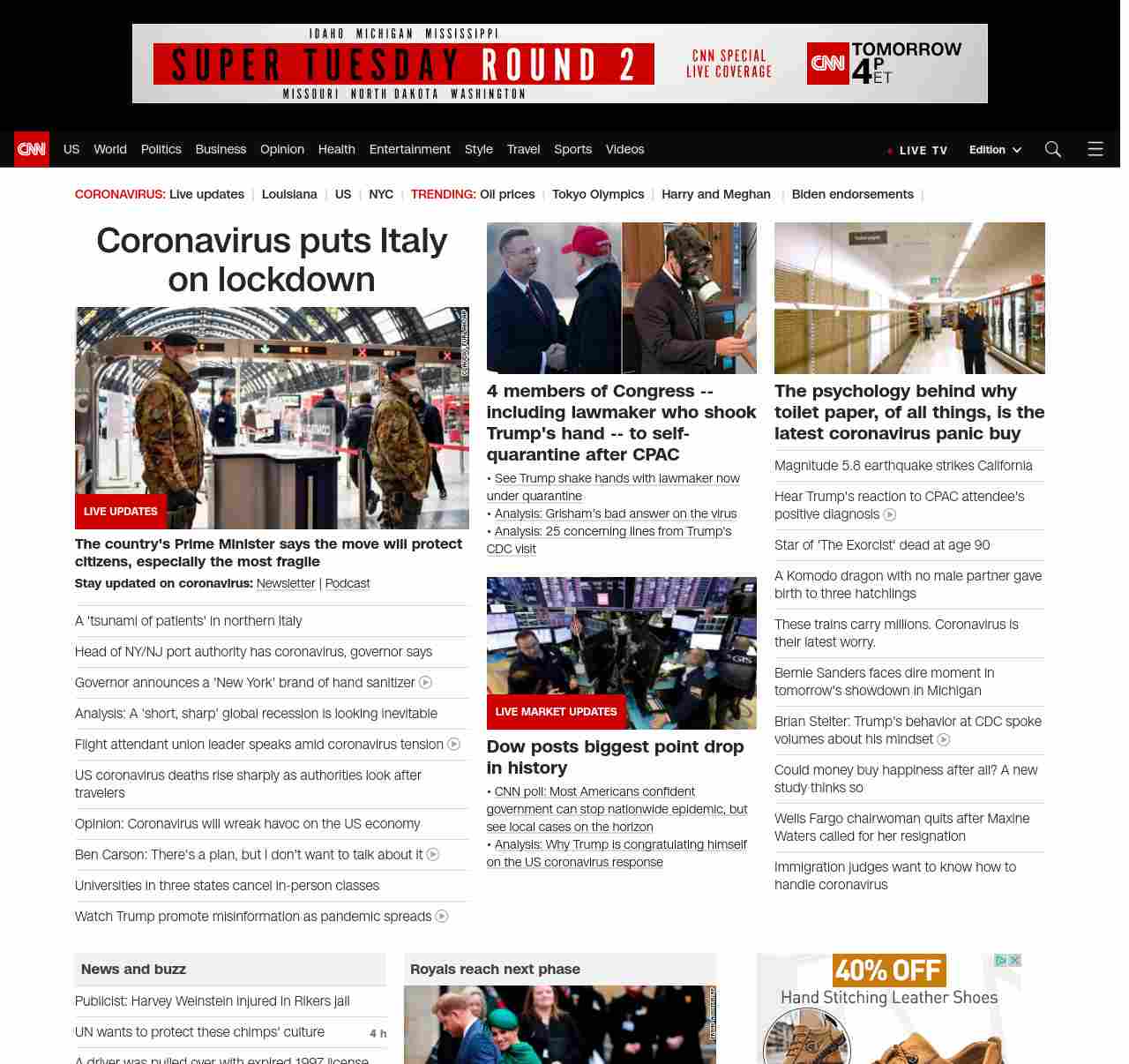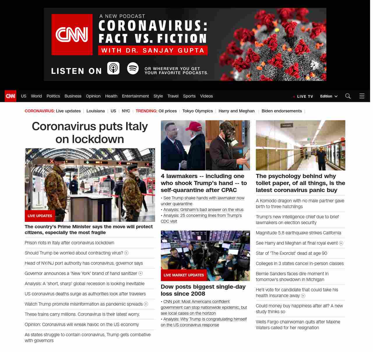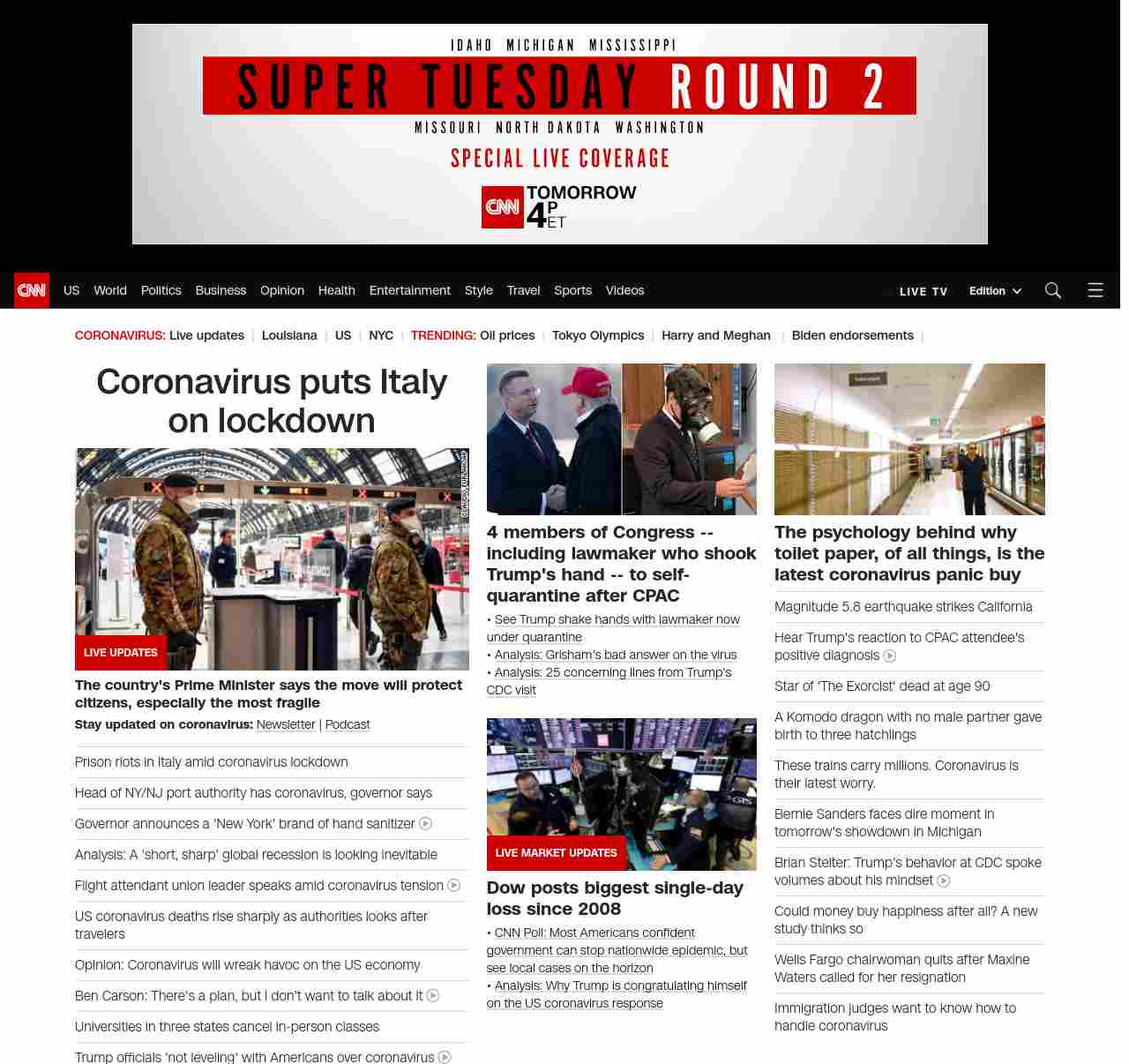|| screaming-banner-text banner-text-size–char-35″ data-analytics=”_list-hierarchical-xs_hyperlink_”> Coronavirus puts Italy on lockdown ||” , title: “CNN – Breaking News, Latest News and Videos” , siblings: {“articleList”:[{“uri”:”/2020/03/09/europe/coronavirus-italy-lockdown-intl/index.html”,”headline”:”Prison riots in Italy after coronavirus lockdown”,”thumbnail”:”//cdn.cnn.com/cnnnext/dam/assets/200309104035-04-italy-quarantine-0309-milan-small-11.jpg”,”duration”:””,”description”:”u003cstrong>Stay updated on coronavirus:u003c/strong> u003ca href=”https://www.cnn.com/specials/coronavirus-newsletter?utm_source=hp&source=hp” target=”_blank”>Newsletteru003c/a> | u003ca href=”https://www.cnn.com/audio/podcasts/corona-virus” target=”_blank”>Podcastu003c/a>”,”layout”:””
