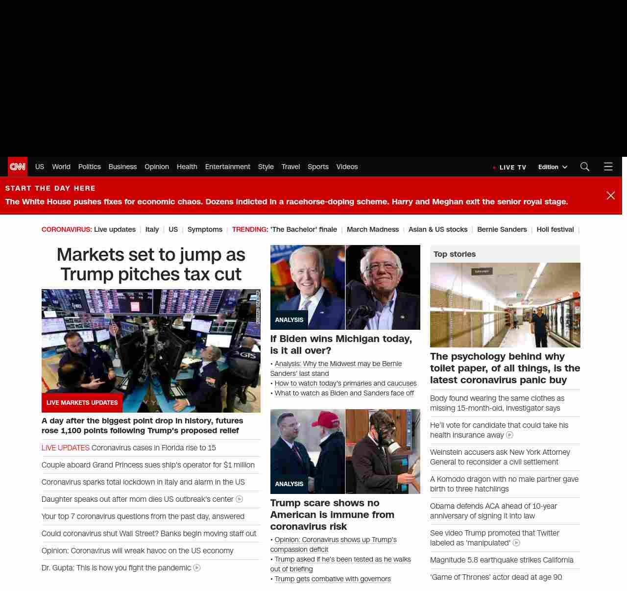 || screaming-banner-text banner-text-size–char-47″ data-analytics=”_list-hierarchical-xs_article_”> Markets set to jump as Trump pitches tax cut ||” , title: “CNN – Breaking News, Latest News and Videos” , siblings: {“articleList”:[{“uri”:”/business/live-news/stock-market-news-today-031020/index.html”,”headline”:”u003cstrong>A day after the biggest point drop in history, futures rose 1,100 points following Trump’s proposed reliefu003c/strong>”,”thumbnail”:”//cdn.cnn.com/cnnnext/dam/assets/200309153633-25-stock-market-0309-new-york-small-11.jpg”,”duration”:””,”description”:””,”layout”:””