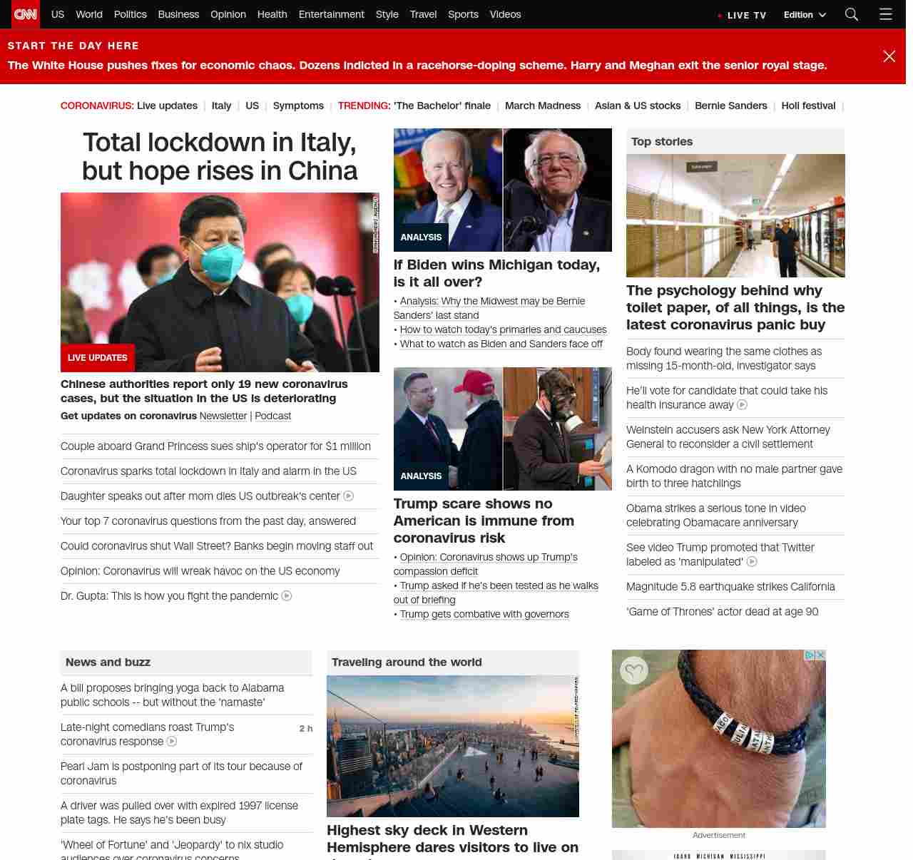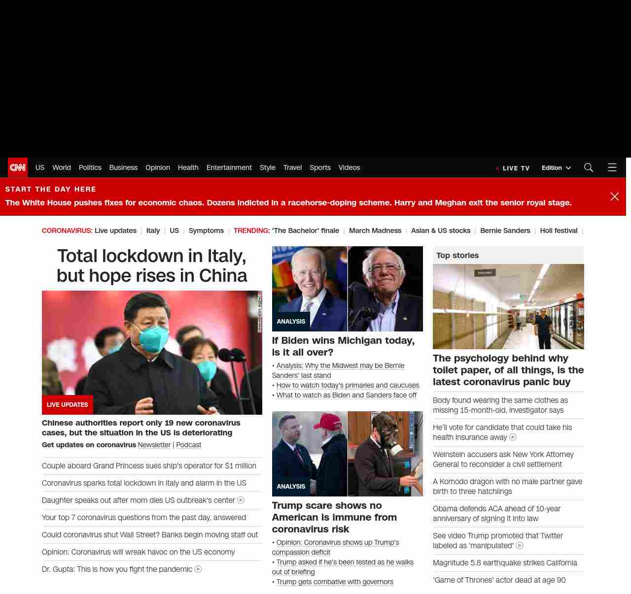 || screaming-banner-text banner-text-size–char-47″ data-analytics=”_list-hierarchical-xs_article_”> Total lockdown in Italy, but hope rises in China ||” , title: “CNN – Breaking News, Latest News and Videos” , siblings: {“articleList”:[{“uri”:”/world/live-news/coronavirus-outbreak-03-10-20-intl-hnk/index.html”,”headline”:”u003cstrong>Chinese authorities report only 19 new coronavirus cases, but the situation in the US is deterioratingu003c/strong>”,”thumbnail”:”//cdn.cnn.com/cnnnext/dam/assets/200310023417-01-xi-jinping-wuhan-0310-small-11.jpg”,”duration”:””,”description”:”u003cstrong>Get updates on coronavirusu003c/strong> u003ca href=”https://www.cnn.com/specials/coronavirus-newsletter?utm_source=hp&source=hp” target=”_blank”>Newsletteru003c/a> | u003ca href=”https://www.cnn.com/audio/podcasts/corona-virus” target=”_blank”>Podcastu003c/a> “,”layout”:””