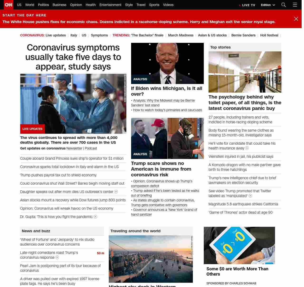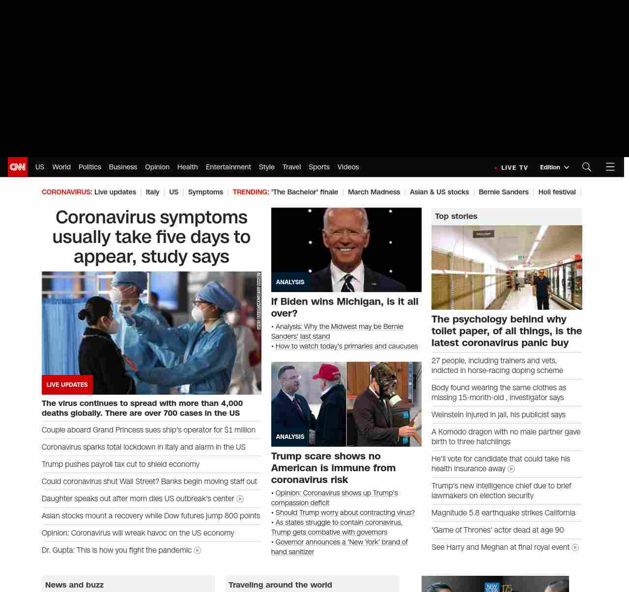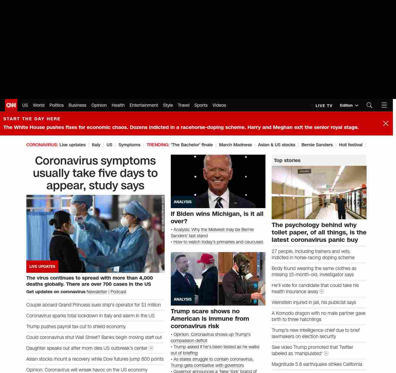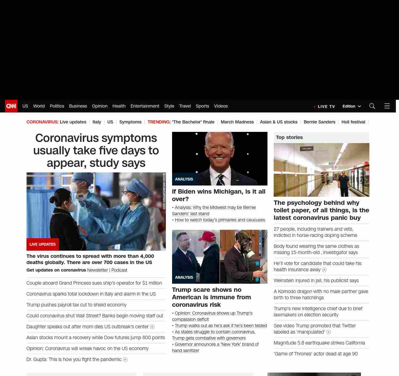 || screaming-banner-text banner-text-size–char-47″ data-analytics=”_list-hierarchical-xs_article_”> Coronavirus symptoms usually take five days to appear, study says ||” , title: “CNN – Breaking News, Latest News and Videos” , siblings: {“articleList”:[{“uri”:”/world/live-news/coronavirus-outbreak-03-10-20-intl-hnk/index.html”,”headline”:”u003cstrong>The virus continues to spread with more than 4,000 deaths globally. There are over 700 cases in the US u003c/strong>”,”thumbnail”:”//cdn.cnn.com/cnnnext/dam/assets/200310021636-coronavirus-beijing-0305-small-11.jpg”,”duration”:””,”description”:”u003cstrong>Get updates on coronavirusu003c/strong> u003ca href=”https://www.cnn.com/specials/coronavirus-newsletter?utm_source=hp&source=hp” target=”_blank”>Newsletteru003c/a> | u003ca href=”https://www.cnn.com/audio/podcasts/corona-virus” target=”_blank”>Podcastu003c/a> “,”layout”:””