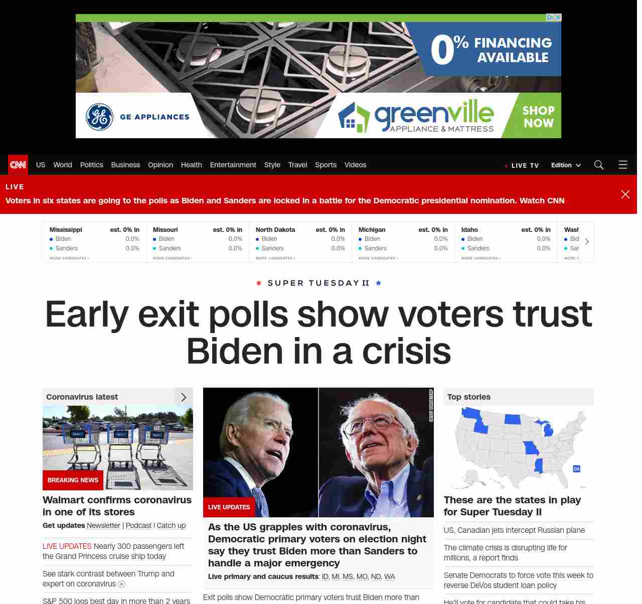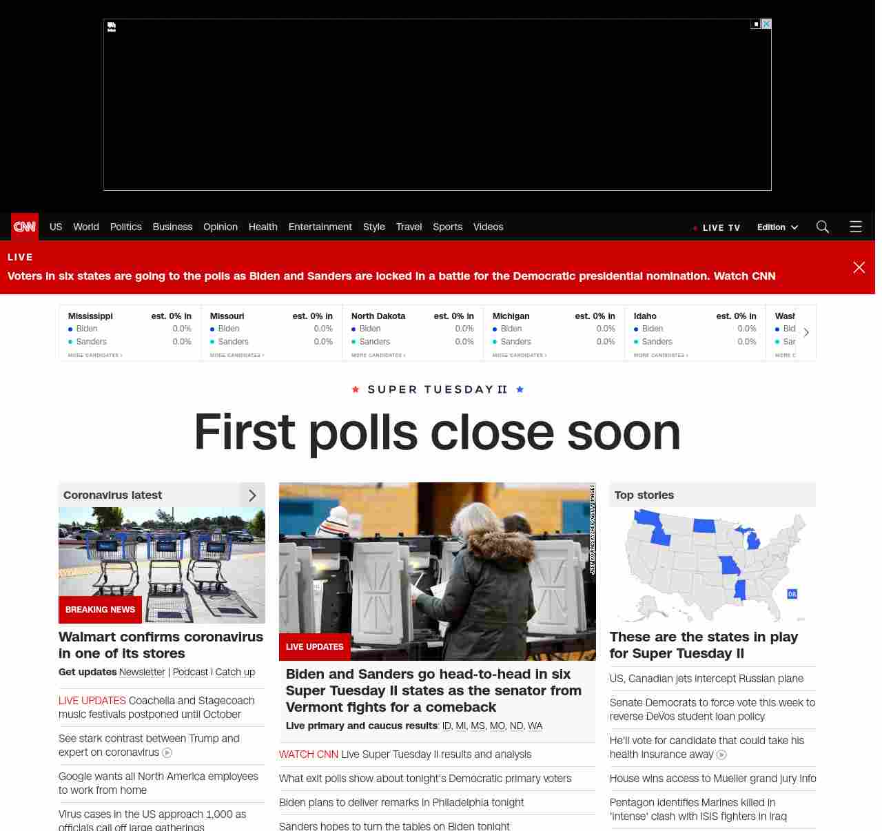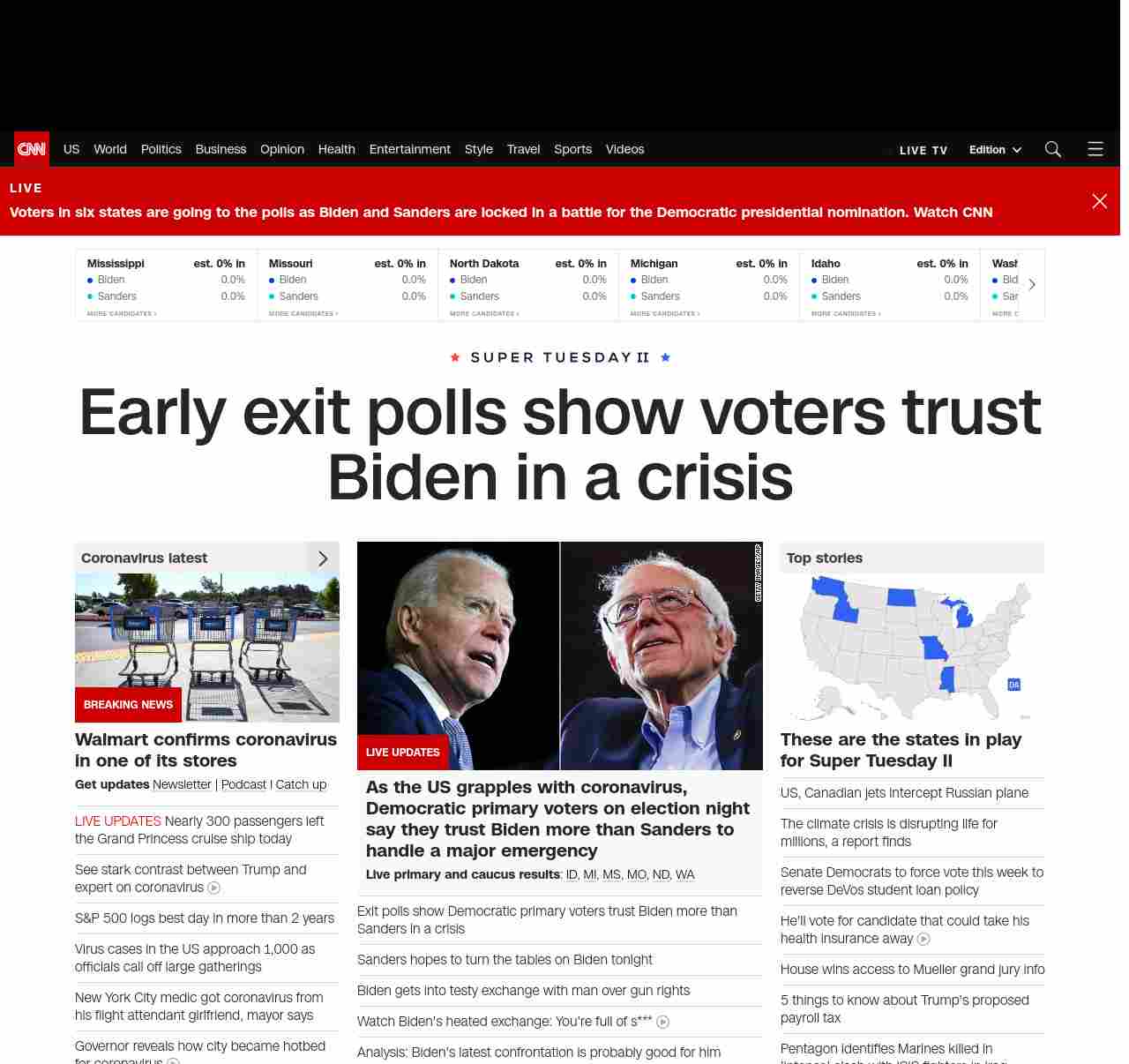 || banner-text–natural”> Biden and Sanders cancel rallies over coronavirus ||” , title: “CNN – Breaking News, Latest News and Videos” , siblings: {“articleList”:[{“uri”:”/videos/health/2020/03/10/anthony-fauci-americans-sot-wh-coronavirus-briefing-vpx.cnn”,”headline”:”See stark contrast between Trump and expert on coronavirus”,”thumbnail”:”//cdn.cnn.com/cnnnext/dam/assets/200310183251-fauci-wh-presser-coronavirus-small-11.jpg”,”duration”:”01:36″,”description”:”Dr. Anthony Fauci, director of NIH’s National Institute of Allergy and Infectious Diseases, provided an update — and a warning — during a White House briefing on the novel coronavirus. Fauci says there are a number of things that can be done to “interfere with the natural flow” of an outbreak such that it infects less people, leading to less deaths. “,”layout”:””,”iconType”:”video”