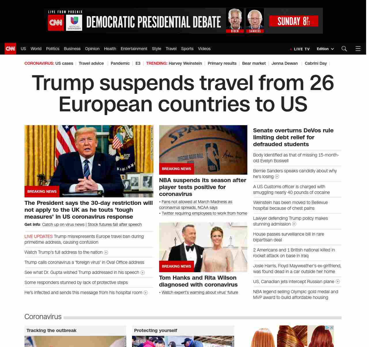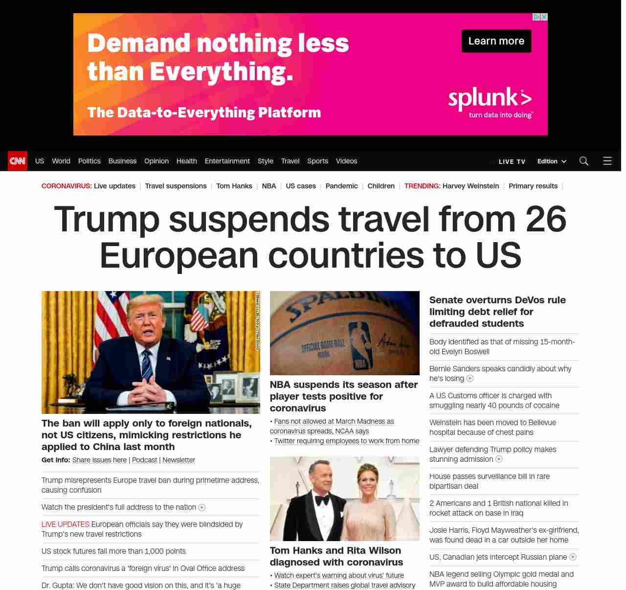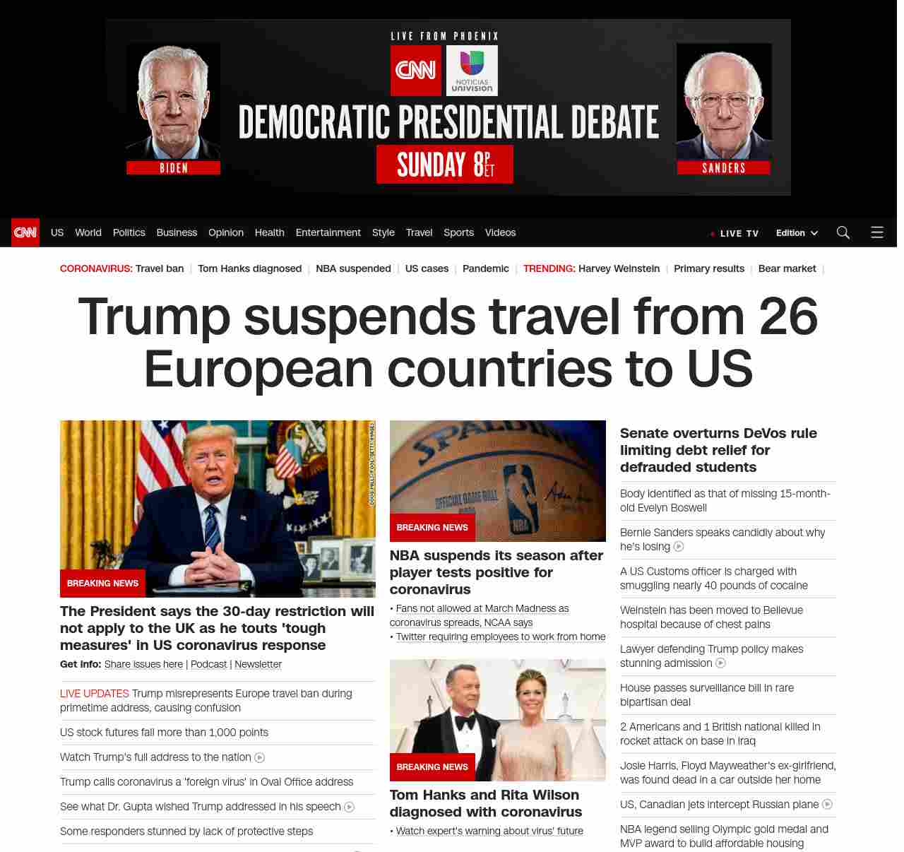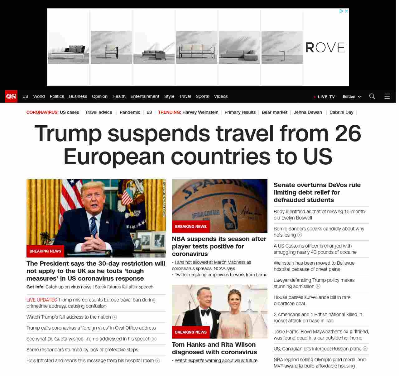 || banner-text–natural”> Trump suspends travel from 26 European countries to US ||” , title: “CNN – Breaking News, Latest News and Videos” , siblings: {“articleList”:[{“uri”:”/videos/politics/2020/03/12/donald-trump-coronavirus-address-march-11-2020-sot-vpx.cnn”,”headline”:”Watch the president’s full address to the nation”,”thumbnail”:”//cdn.cnn.com/cnnnext/dam/assets/200311211631-donald-trump-oval-office-march-11-2020-04-small-11.jpg”,”duration”:”09:30″,”description”:”President Donald Trump addressed the nation about the growing coronavirus pandemic, where he announced a u003ca href=”http://www.cnn.com/2020/03/11/politics/donald-trump-coronavirus-statement/index.html” target=”_blank”>temporary travel ban on travel from Europeu003c/a> and provide low-interest loans to small businesses.”,”layout”:””,”iconType”:”video”