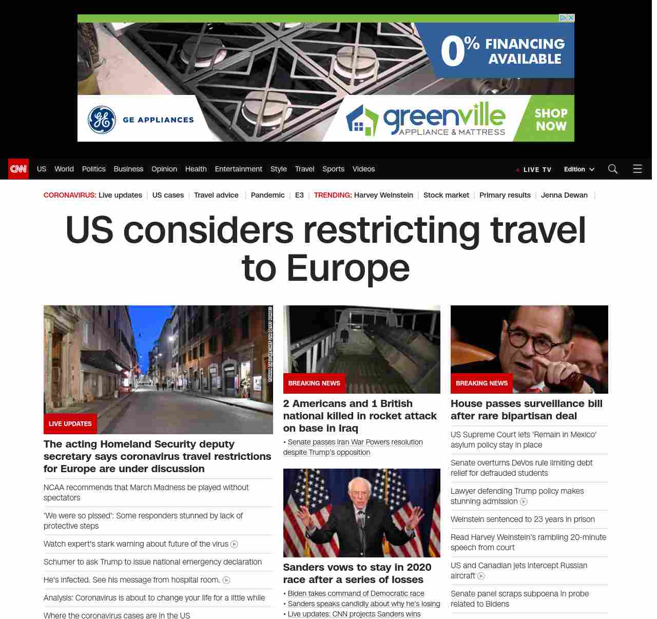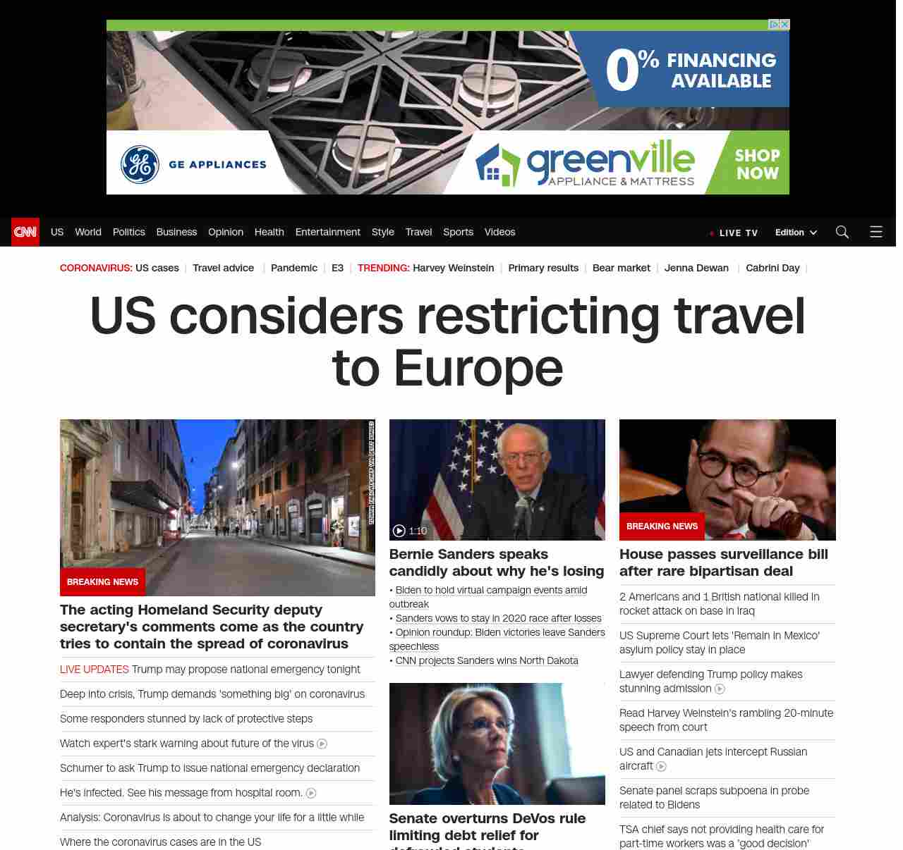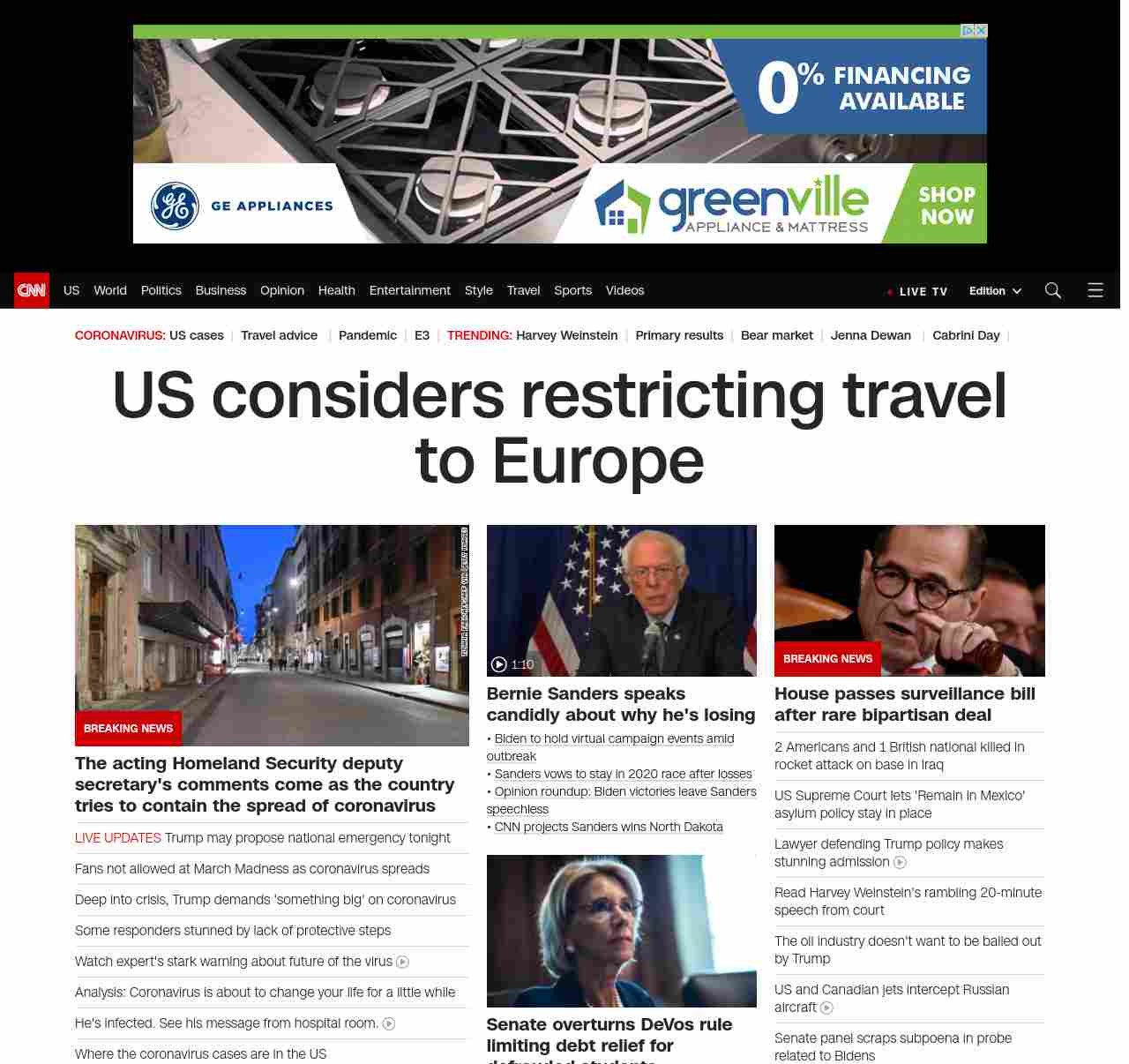|| banner-text–natural”> US considers restricting travel to Europe ||” , title: “CNN – Breaking News, Latest News and Videos” , siblings: {“articleList”:[{“uri”:”/2020/03/11/us/march-madness-no-fans-spt-trnd/index.html”,”headline”:”Fans not allowed at March Madness as coronavirus spreads”,”thumbnail”:”//cdn.cnn.com/cnnnext/dam/assets/200301102805-01-ncaa-march-madness-fans-small-11.jpg”,”duration”:””,”description”:”The NCAA announced Wednesday that March Madness will go on as planned, but fans won’t be allowed to attend because of concerns over the coronavirus outbreak. “,”layout”:””