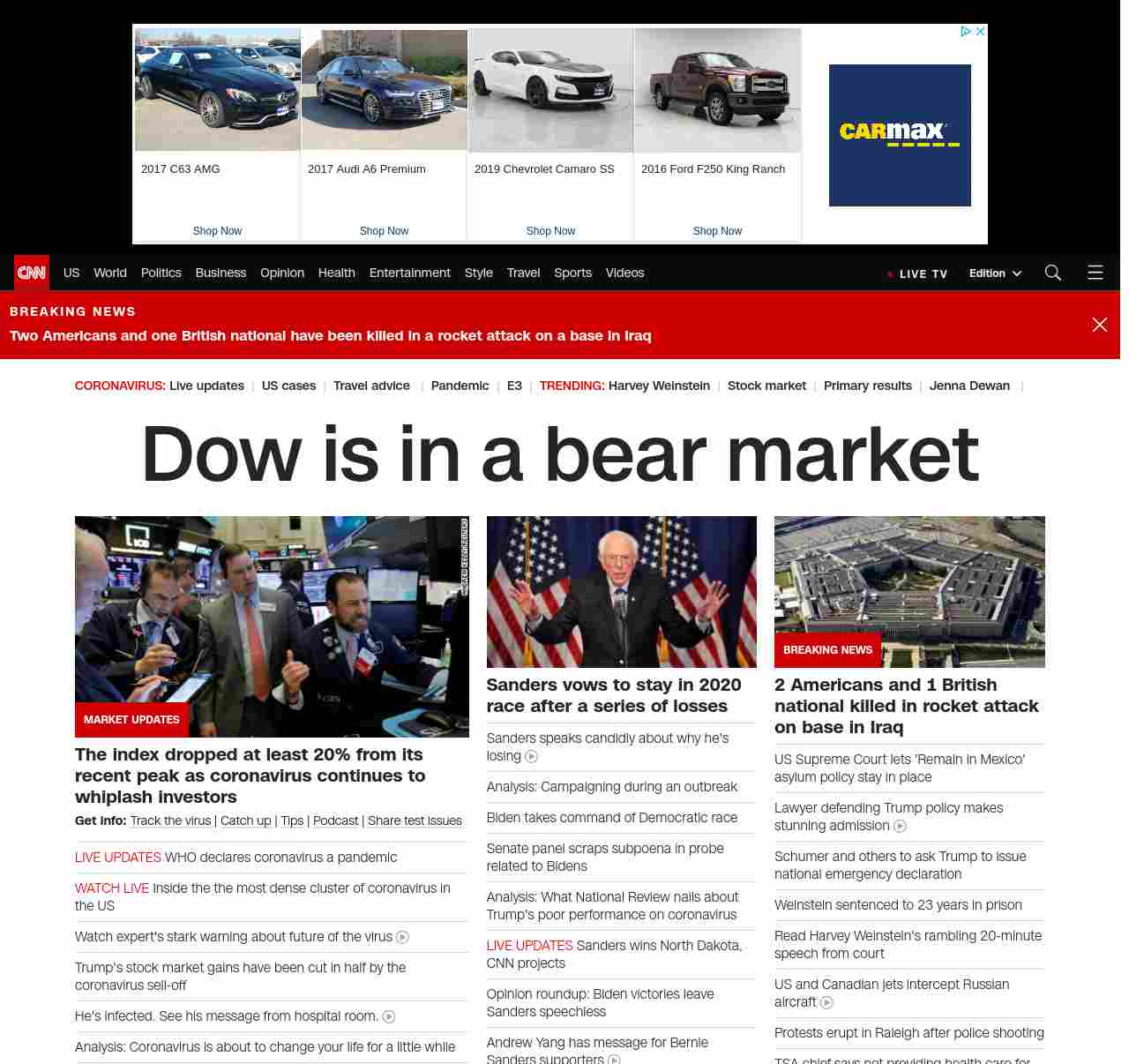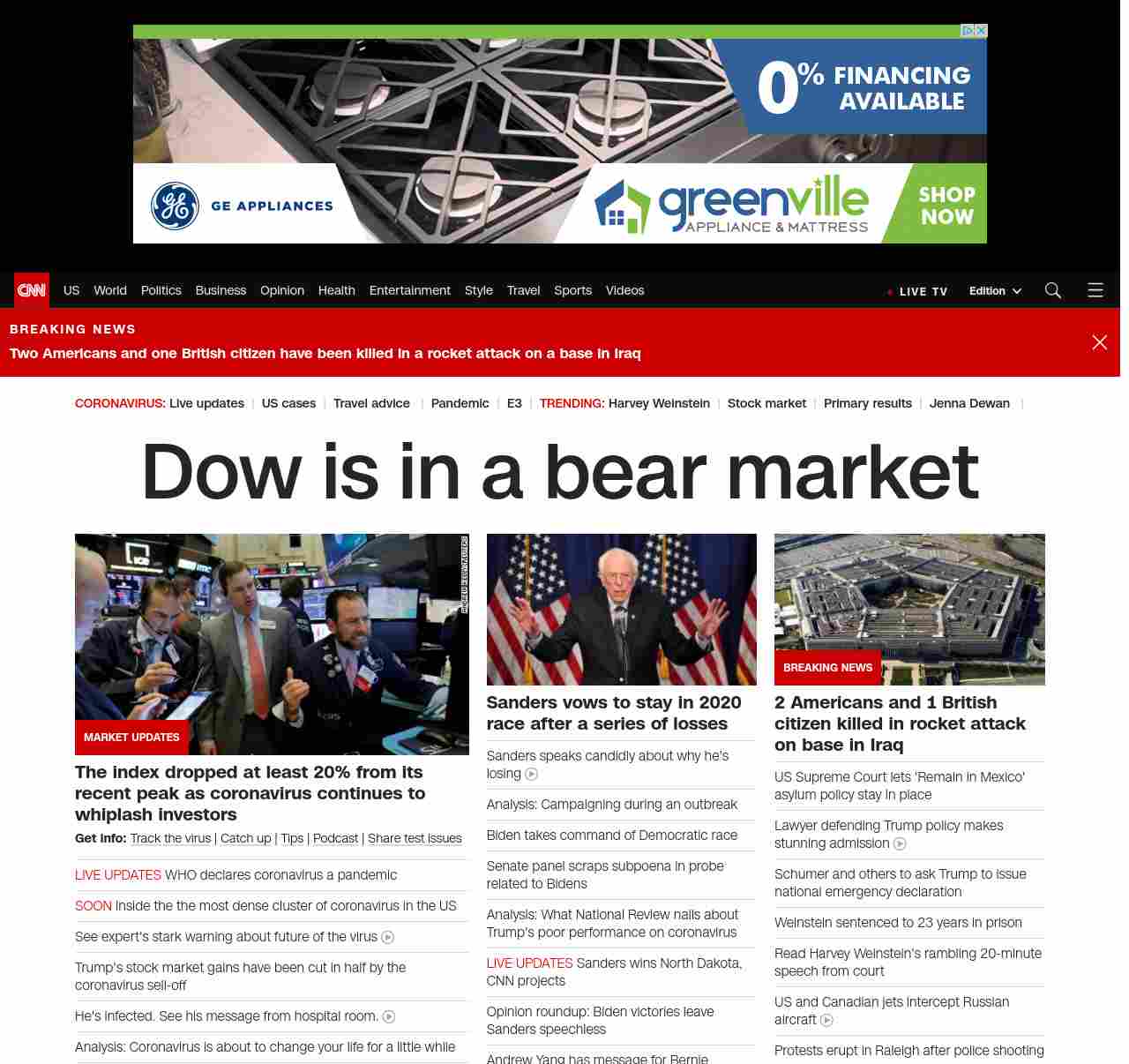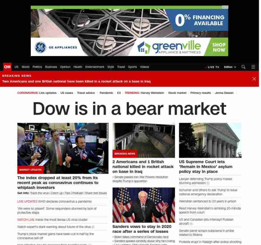 || banner-text–maximized banner-text-size–char-26″> Dow is in a bear market ||” , title: “CNN – Breaking News, Latest News and Videos” , siblings: {“articleList”:[{“uri”:”/2020/03/11/health/coronavirus-first-responders-invs/index.html”,”headline”:”‘We were so pissed’: Some responders stunned by lack of protective steps”,”thumbnail”:”//cdn.cnn.com/cnnnext/dam/assets/200311144035-01-coronavirus-workers-protective-gear-small-11.jpg”,”duration”:””,”description”:”When emergency response teams were deployed to an Air Force base in northern California last month to assist potential victims of coronavirus, some members were stunned by the protective gear they were given to aid in their u003ca href=”https://www.cnn.com/2020/02/04/us/us-wuhan-evacuation-flight-coronavirus/index.html” target=”_blank”>missionu003c/a>:”,”layout”:””
