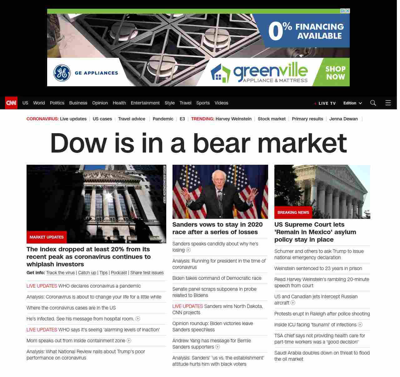 || banner-text–maximized banner-text-size–char-26″> Dow is in a bear market ||” , title: “CNN – Breaking News, Latest News and Videos” , siblings: {“articleList”:[{“uri”:”/2020/03/11/investing/us-stock-market-trump/index.html”,”headline”:”Trump’s stock market gains have been cut in half by the coronavirus sell-off”,”thumbnail”:”//cdn.cnn.com/cnnnext/dam/assets/200311151939-ny-stock-market-file-small-11.jpg”,”duration”:””,”description”:”Just three weeks ago, President Donald Trump was celebrating. “,”layout”:””