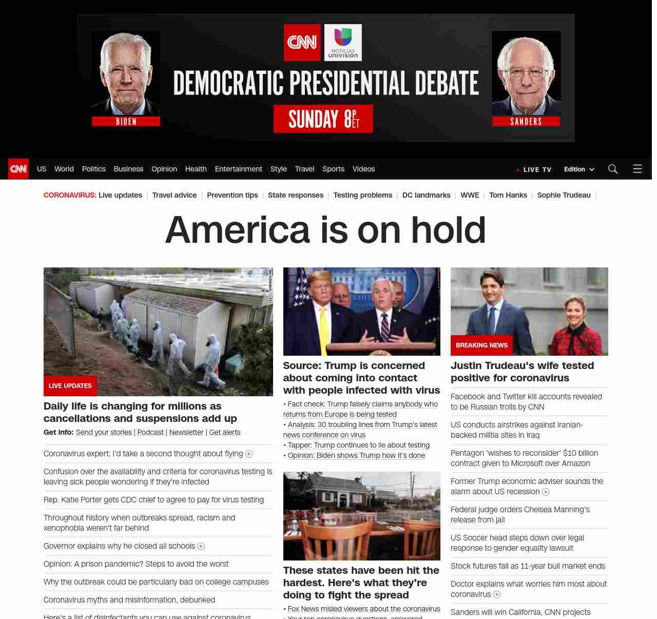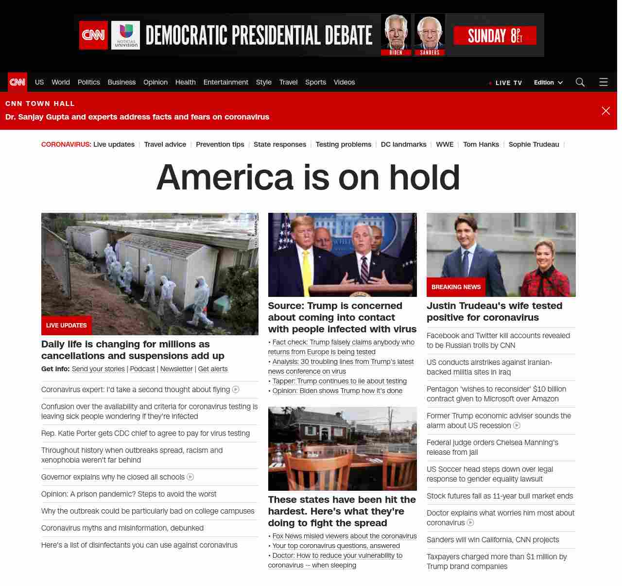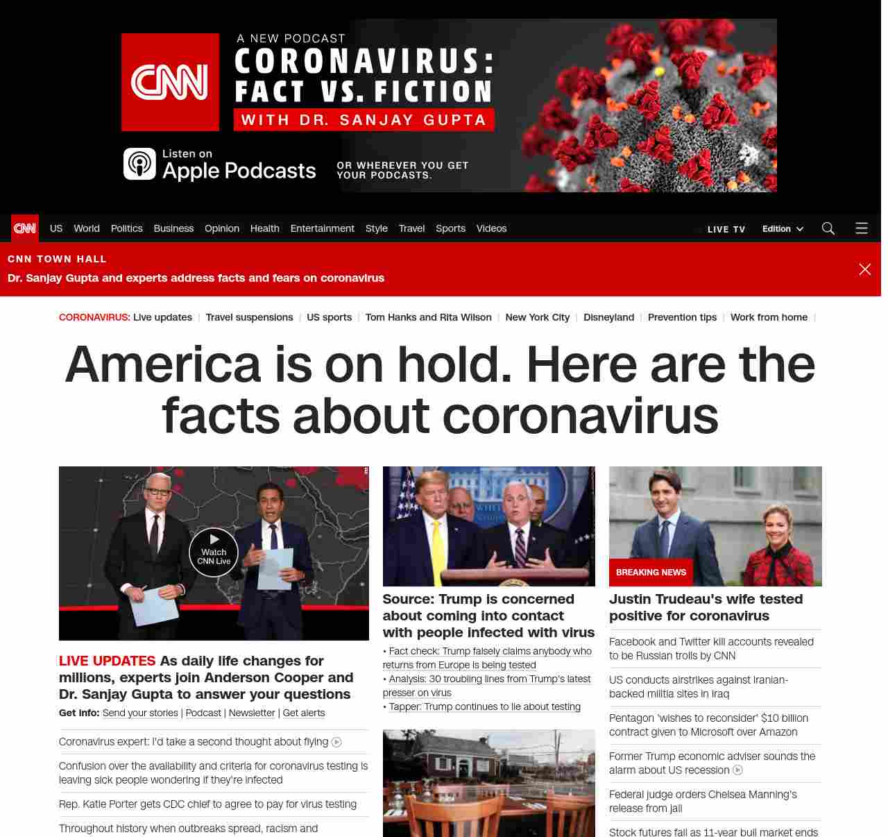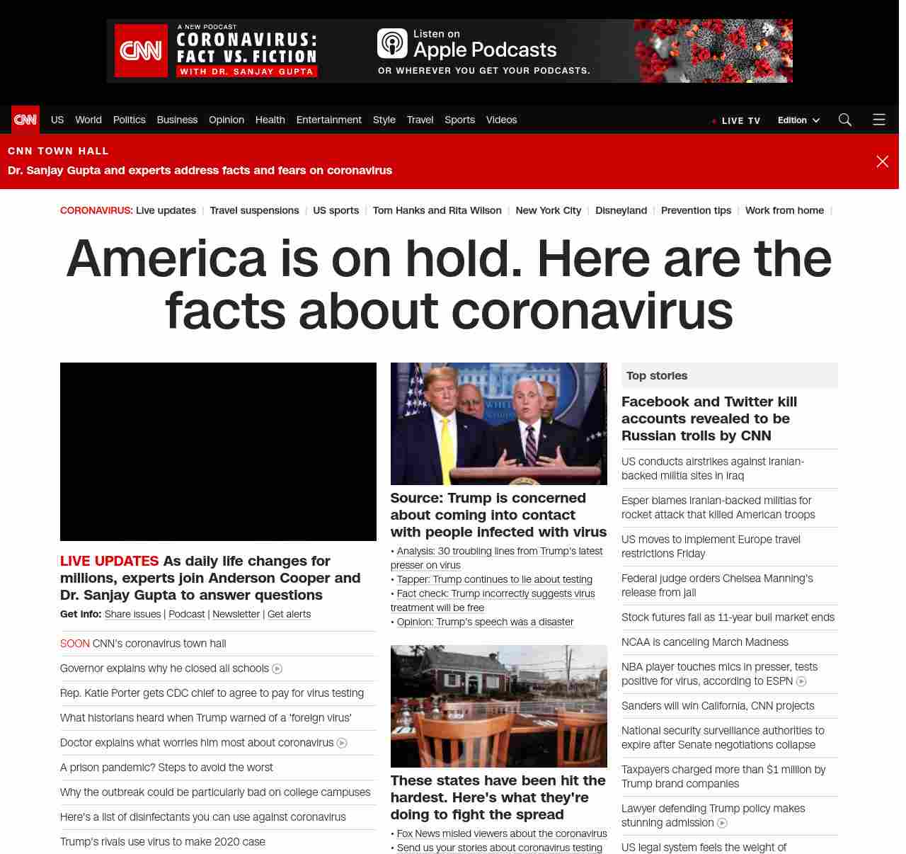 || banner-text–natural”> America is on hold. Here are the facts about coronavirus ||” , title: “CNN – Breaking News, Latest News and Videos” , siblings: {“articleList”:[{“uri”:”/videos/us/2020/03/13/coronavirus-expert-anthony-fauci-would-you-get-on-a-plane-cnn-town-hall-vpx.cnn”,”headline”:”Coronavirus expert: I’d take a second thought about flying”,”thumbnail”:”//cdn.cnn.com/cnnnext/dam/assets/200312224639-anthony-fauci-cnn-town-hall-coronavirus-small-11.jpg”,”duration”:”01:16″,”description”:”Dr. Anthony Fauci, director of the National Institute of Allergy and Infectious Diseases, discusses why he would think twice about getting on a plane in the midst of the coronavirus pandemic. “,”layout”:””,”iconType”:”video”