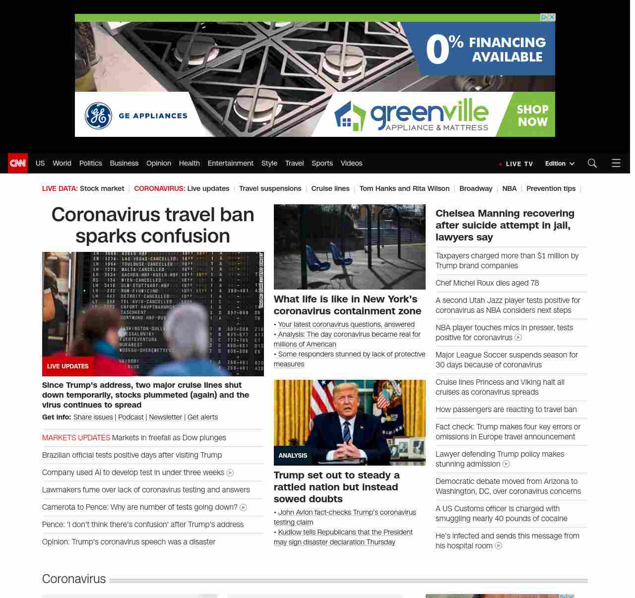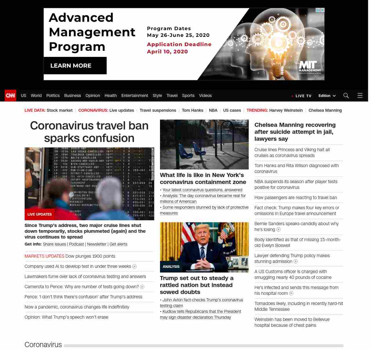 || screaming-banner-text banner-text-size–char-41″ data-analytics=”_list-hierarchical-xs_hyperlink_”> Coronavirus travel ban sparks confusion ||” , title: “CNN – Breaking News, Latest News and Videos” , siblings: {“articleList”:[{“uri”:”/business/live-news/stock-market-news-today-031220/index.html”,”headline”:”Markets in freefall as Dow plunges”,”thumbnail”:”//cdn.cnn.com/cnnnext/dam/assets/200311161934-nyse-floor-0311-small-11.jpg”,”duration”:””,”description”:”u003cstrong>Get info: u003c/strong>u003ca href=”https://www.cnn.com/2020/03/11/us/coronavirus-testing-stories-invs/index.html” target=”_blank”>Share issues hereu003c/a> | u003ca href=”https://www.cnn.com/audio/podcasts/corona-virus” target=”_blank”>Podcastu003c/a> | u003ca href=”https://www.cnn.com/specials/coronavirus-newsletter?utm_source=hp&source=hp” target=”_blank”>Newsletteru003c/a> | u003ca href=”https://smart.link/2ogidty6y6mlh” target=”_blank”>Get alertsu003c/a>”,”layout”:””