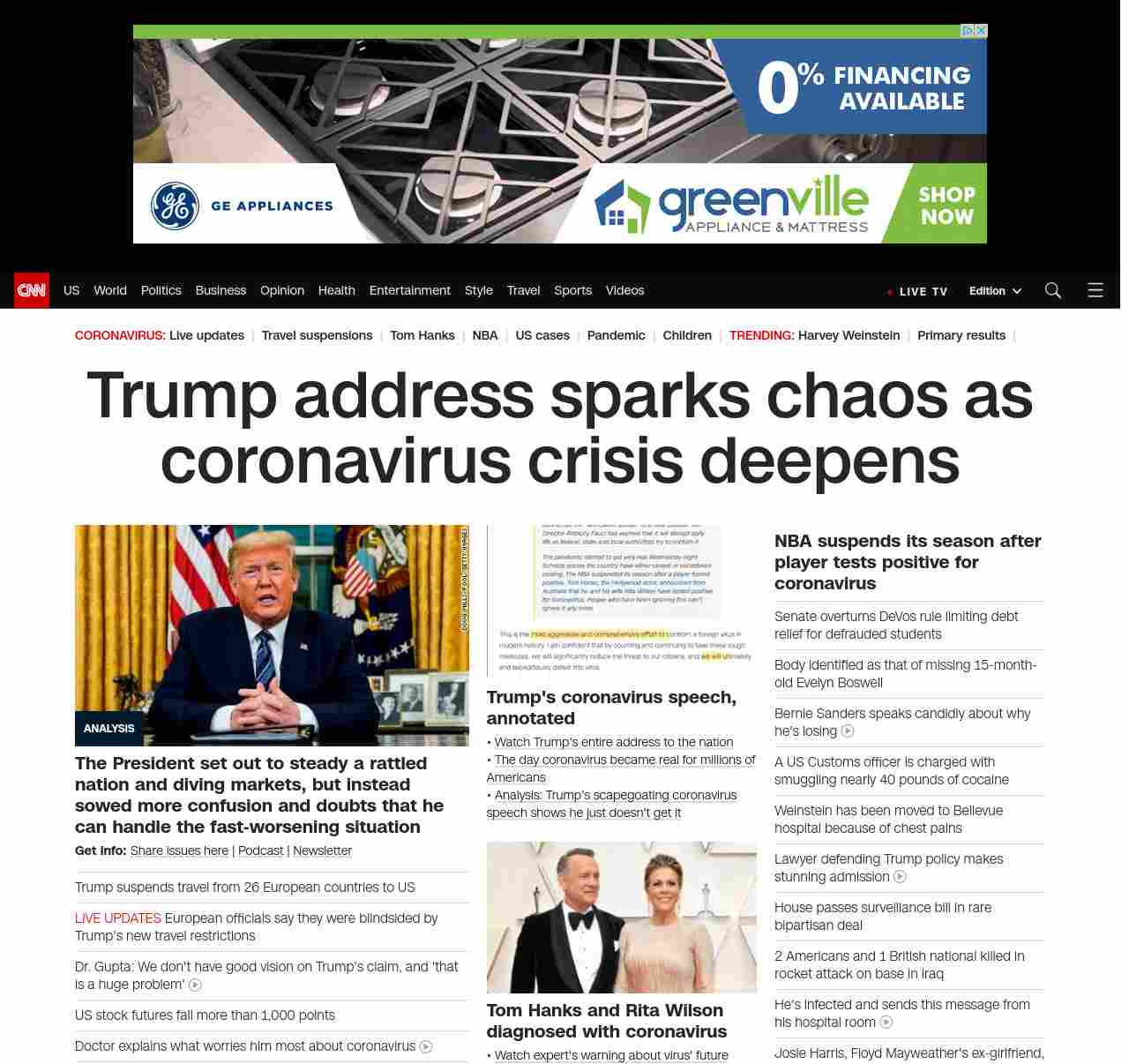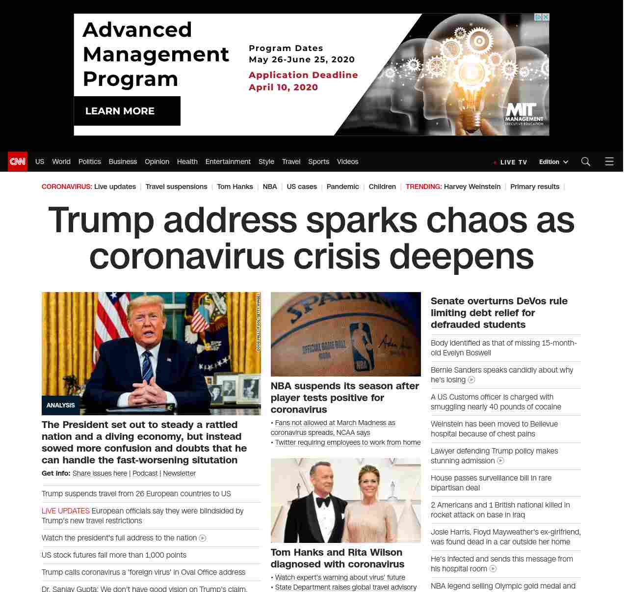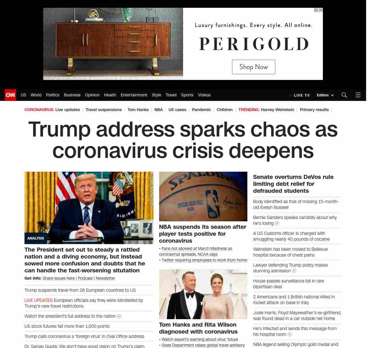 || banner-text–natural”> Trump address sparks chaos as coronavirus crisis deepens ||” , title: “CNN – Breaking News, Latest News and Videos” , siblings: {“articleList”:[{“uri”:”/2020/03/12/politics/donald-trump-coronavirus-europe-travel/index.html”,”headline”:”u003cstrong>The President set out to steady a rattled nation and diving markets, but instead sowed more confusion and doubts that he can handle the fast-worsening situtationu003c/strong>”,”thumbnail”:”//cdn.cnn.com/cnnnext/dam/assets/200311212014-04-trump-oval-office-address-0311-small-11.jpg”,”duration”:””,”description”:”u003cstrong>Get info: u003c/strong>u003ca href=”https://www.cnn.com/2020/03/11/us/coronavirus-testing-stories-invs/index.html” target=”_blank”>Share issues hereu003c/a> | u003ca href=”https://www.cnn.com/audio/podcasts/corona-virus” target=”_blank”>Podcastu003c/a> | u003ca href=”https://www.cnn.com/specials/coronavirus-newsletter?utm_source=hp&source=hp” target=”_blank”>Newsletteru003c/a>”,”layout”:””