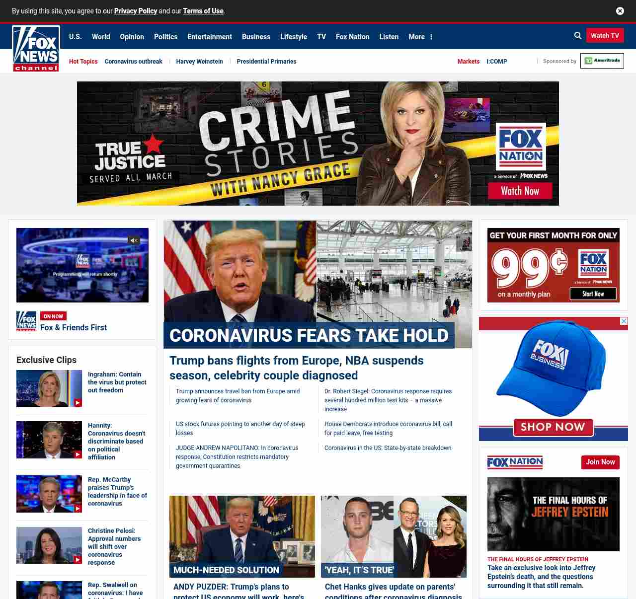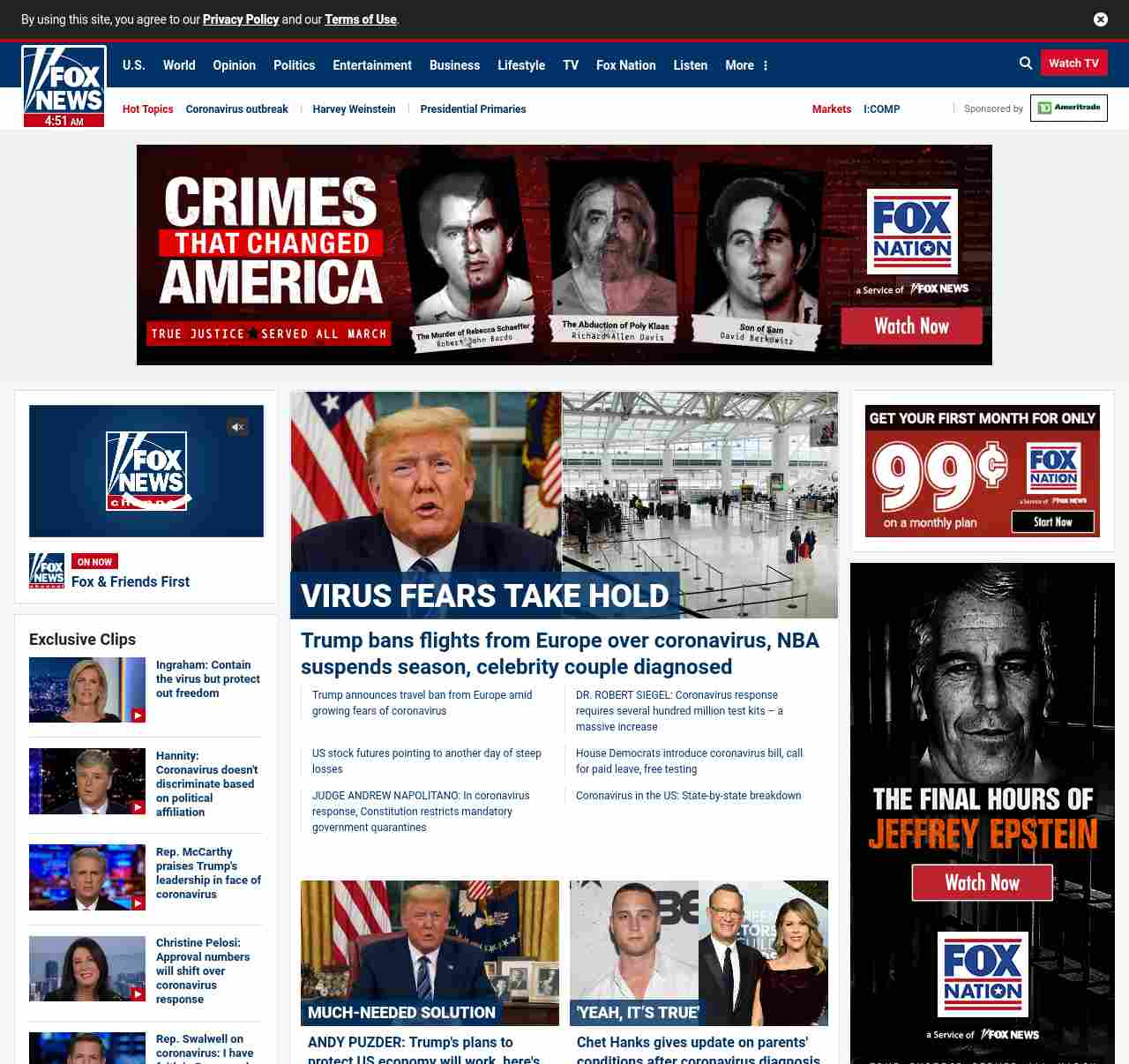 FN: [[VIRUS FEARS TAKE HOLD]] Trump bans flights from Europe over coronavirus, NBA suspends season, celebrity couple diagnosed ((lubuntu at wor2))