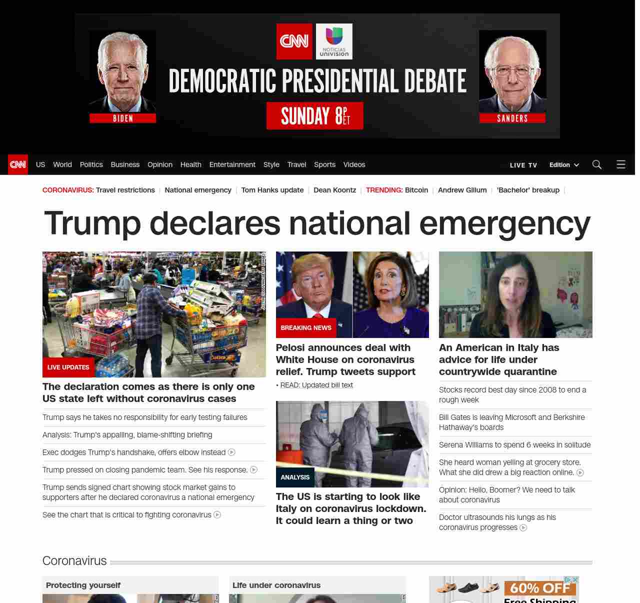 || banner-text–maximized banner-text-size–char-35″> Trump declares national emergency ||” , title: “CNN – Breaking News, Latest News and Videos” , siblings: {“articleList”:[{“uri”:”/2020/03/13/politics/donald-trump-emergency/index.html”,”headline”:”Trump says he takes no responsibility for early testing failures”,”thumbnail”:”//cdn.cnn.com/cnnnext/dam/assets/200313153802-03-trump-coronavirus-presser-0313-small-11.jpg”,”duration”:””,”description”:”u003cstrong>Get info: u003c/strong>u003ca href=”https://www.cnn.com/2020/03/11/us/coronavirus-testing-stories-invs/index.html” target=”_blank”>Send your storiesu003c/a> | u003ca href=”https://www.cnn.com/audio/podcasts/corona-virus” target=”_blank”>Podcastu003c/a> | u003ca href=”https://www.cnn.com/specials/coronavirus-newsletter?utm_source=hp&source=hp” target=”_blank”>Newsletteru003c/a> | u003ca href=”https://www.cnn.com/specials/mobile-apps” target=”_blank”>Alertsu003c/a>”,”layout”:””