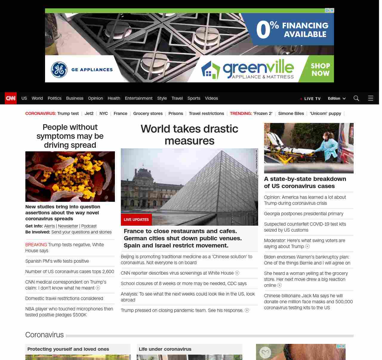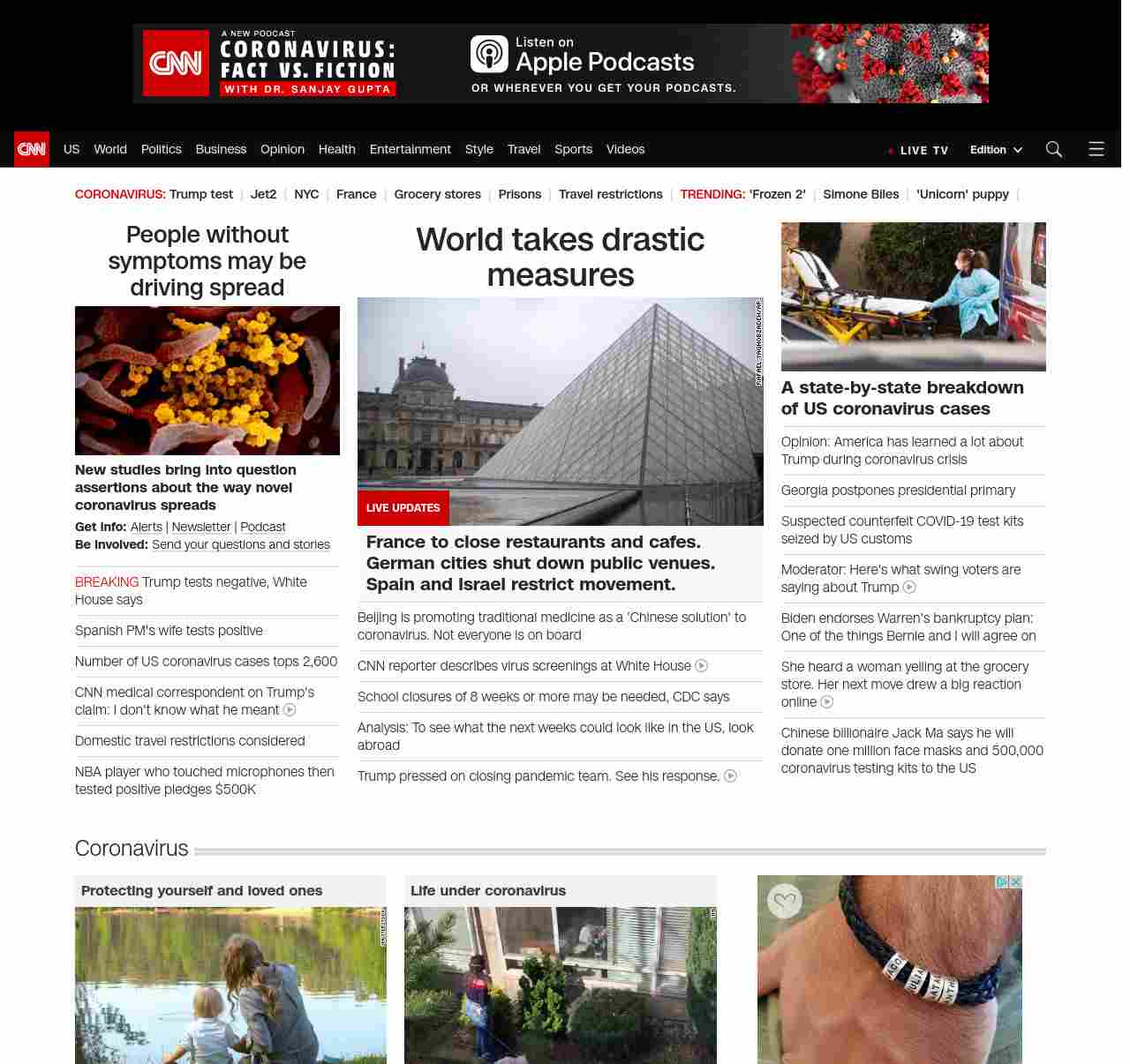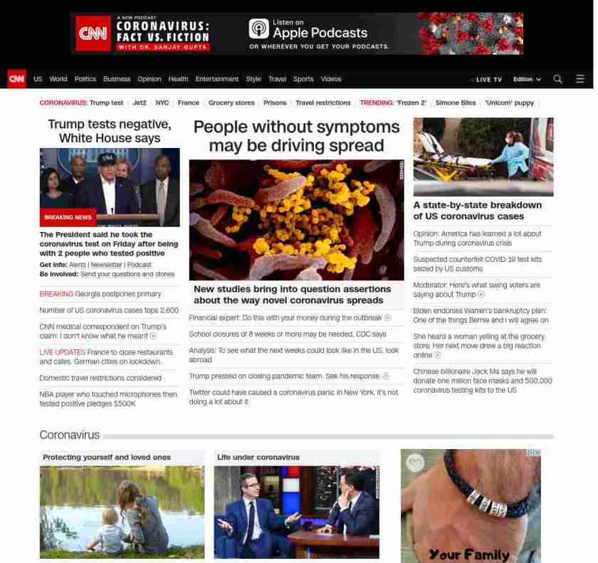 || banner-text–natural” data-analytics=”_list-hierarchical-xs_hyperlink_”> World takes drastic measures ||” , title: “CNN – Breaking News, Latest News and Videos” , siblings: {“articleList”:[{“uri”:”/2020/03/14/politics/trump-press-conference-coronavirus/index.html”,”headline”:”Trump tests negative, White House says”,”thumbnail”:”//cdn.cnn.com/cnnnext/dam/assets/200314122119-01-trump-pence-presser-0314-small-11.jpg”,”duration”:””,”description”:”u003cstrong>Get info: u003c/strong>u003ca href=”https://www.cnn.com/specials/mobile-apps” target=”_blank”>Alertsu003c/a> | u003ca href=”https://www.cnn.com/specials/coronavirus-newsletter?utm_source=hp&source=hp” target=”_blank”>Newsletteru003c/a> | u003ca href=”https://www.cnn.com/audio/podcasts/corona-virus” target=”_blank”>Podcastu003c/a> u003cbr />u003cstrong>Be involved: u003c/strong>u003ca href=”https://www.cnn.com/2020/03/04/us/coronavirus-town-hall-questions/index.html” target=”_blank”>Send your questions and storiesu003c/a>”,”layout”:””