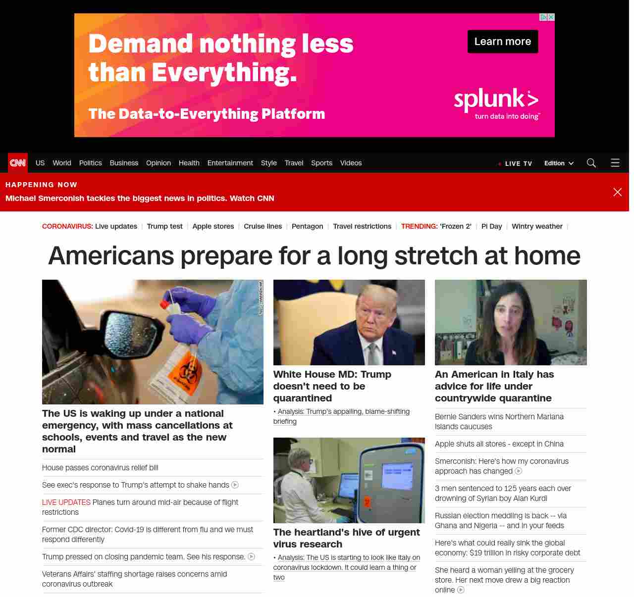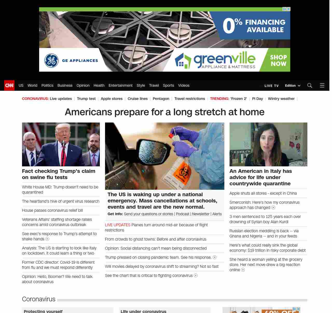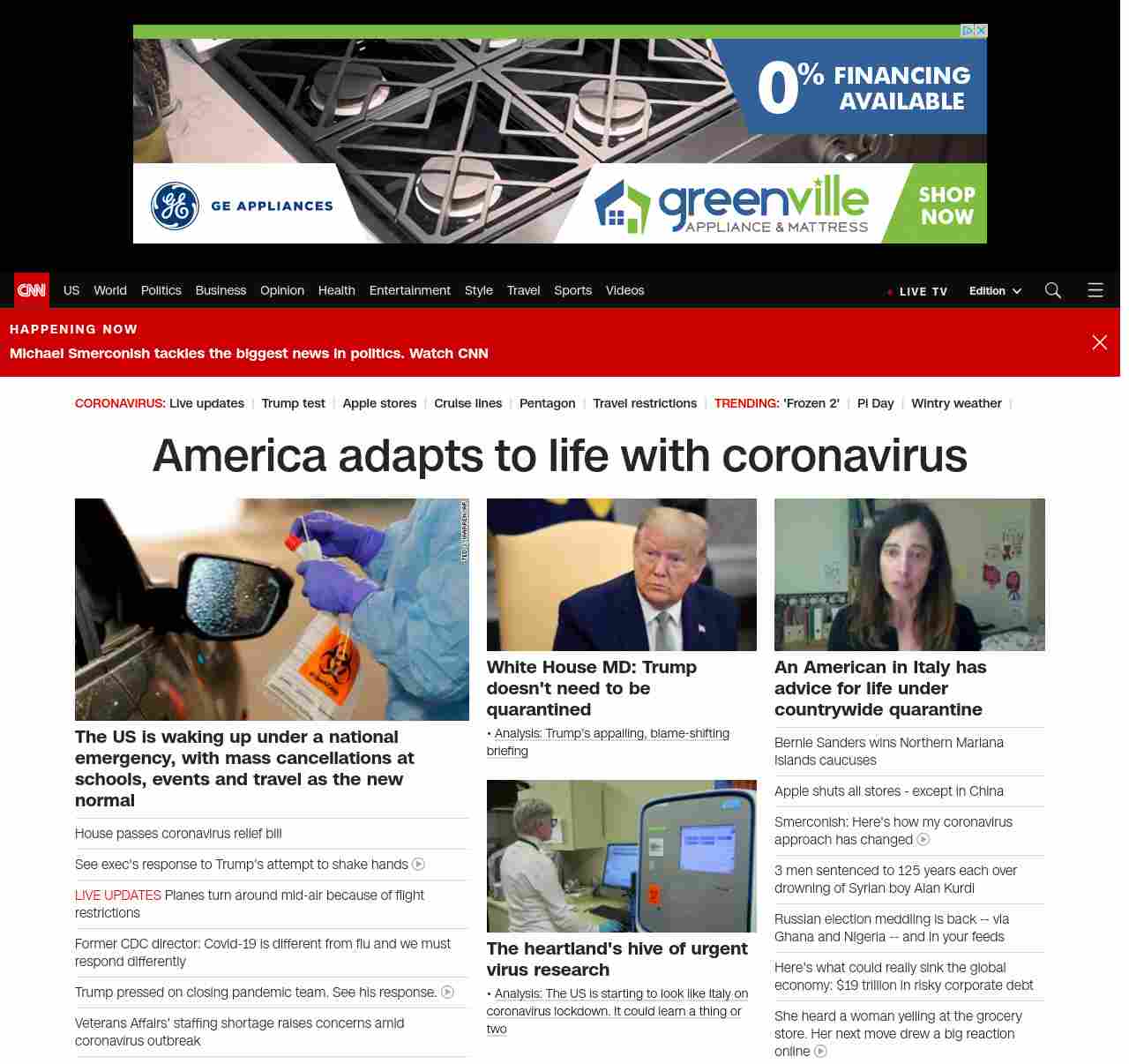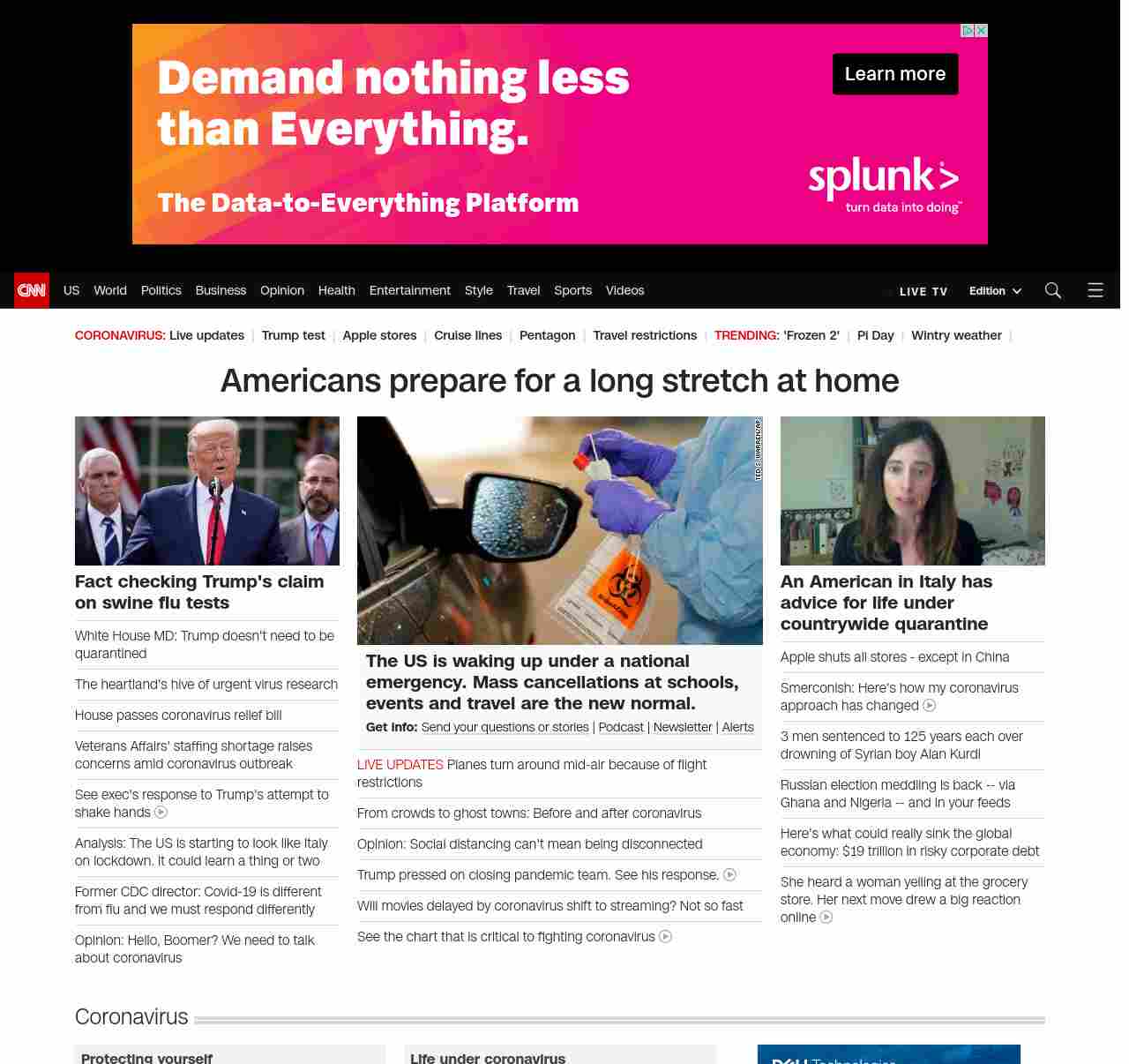 || banner-text–maximized banner-text-size–char-41″> America adapts to life with coronavirus ||” , title: “CNN – Breaking News, Latest News and Videos” , siblings: {“articleList”:[{“uri”:”/2020/03/13/politics/fact-checking-trumps-claim-on-swine-flu-tests/index.html”,”headline”:”Fact checking Trump’s claim on swine flu tests”,”thumbnail”:”//cdn.cnn.com/cnnnext/dam/assets/200313153802-03-trump-coronavirus-presser-0313-small-11.jpg”,”duration”:””,”description”:”During his press conference Friday u003ca href=”https://www.cnn.com/2020/03/13/politics/donald-trump-emergency/index.html” target=”_blank”>declaring a national emergencyu003c/a> to address the coronavirus and release $50 billion in federal funding, President Donald Trumpu003ca href=”https://www.cnn.com/world/live-news/coronavirus-outbreak-03-13-20-intl-hnk/h_ef47b931c089dee1ab18f33885e717e4″ target=”_blank”> criticized President Barack Obama’s u003c/a>administration for its handling of the swine flu (H1N1 virus) in 2009.”,”layout”:””