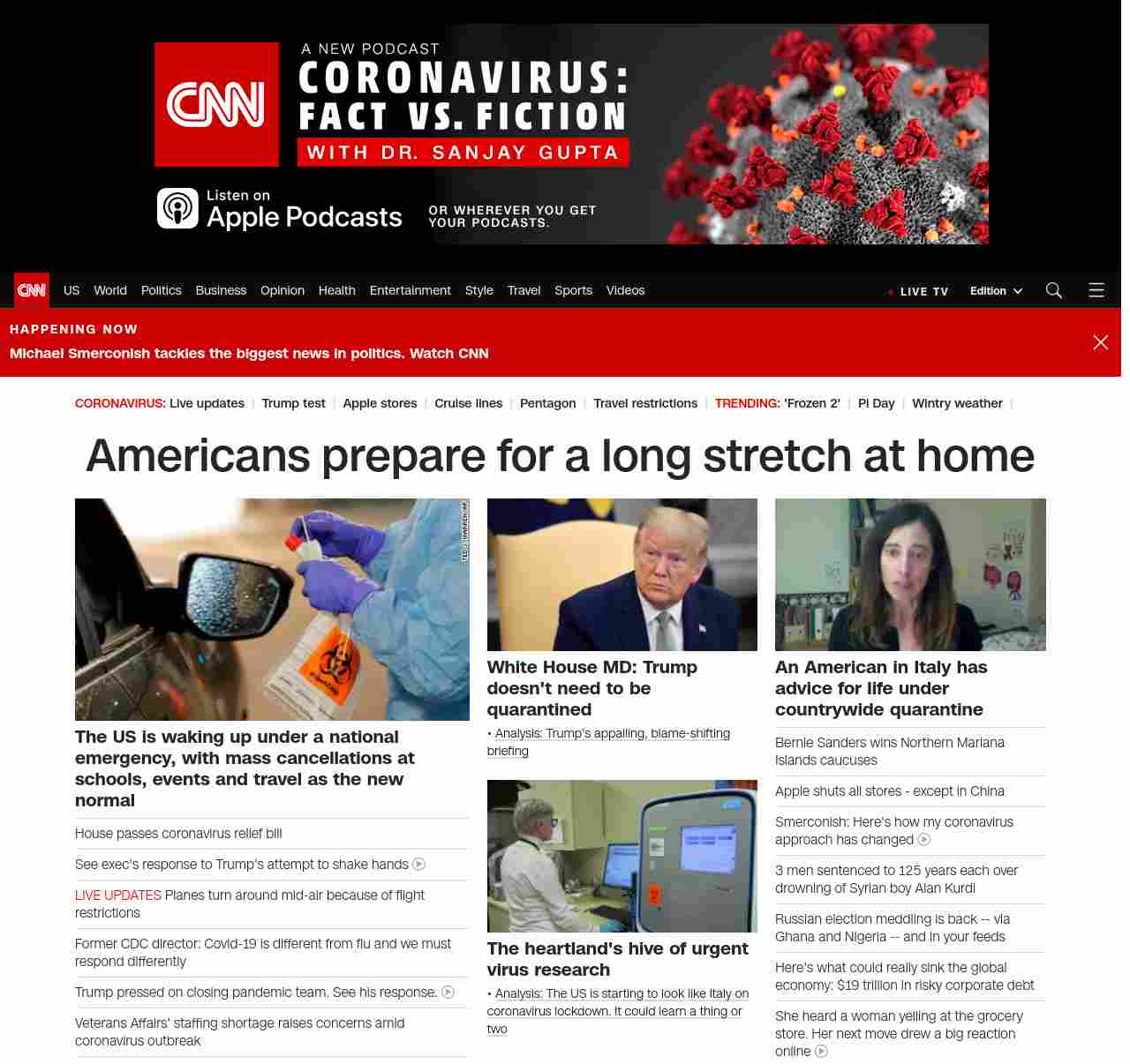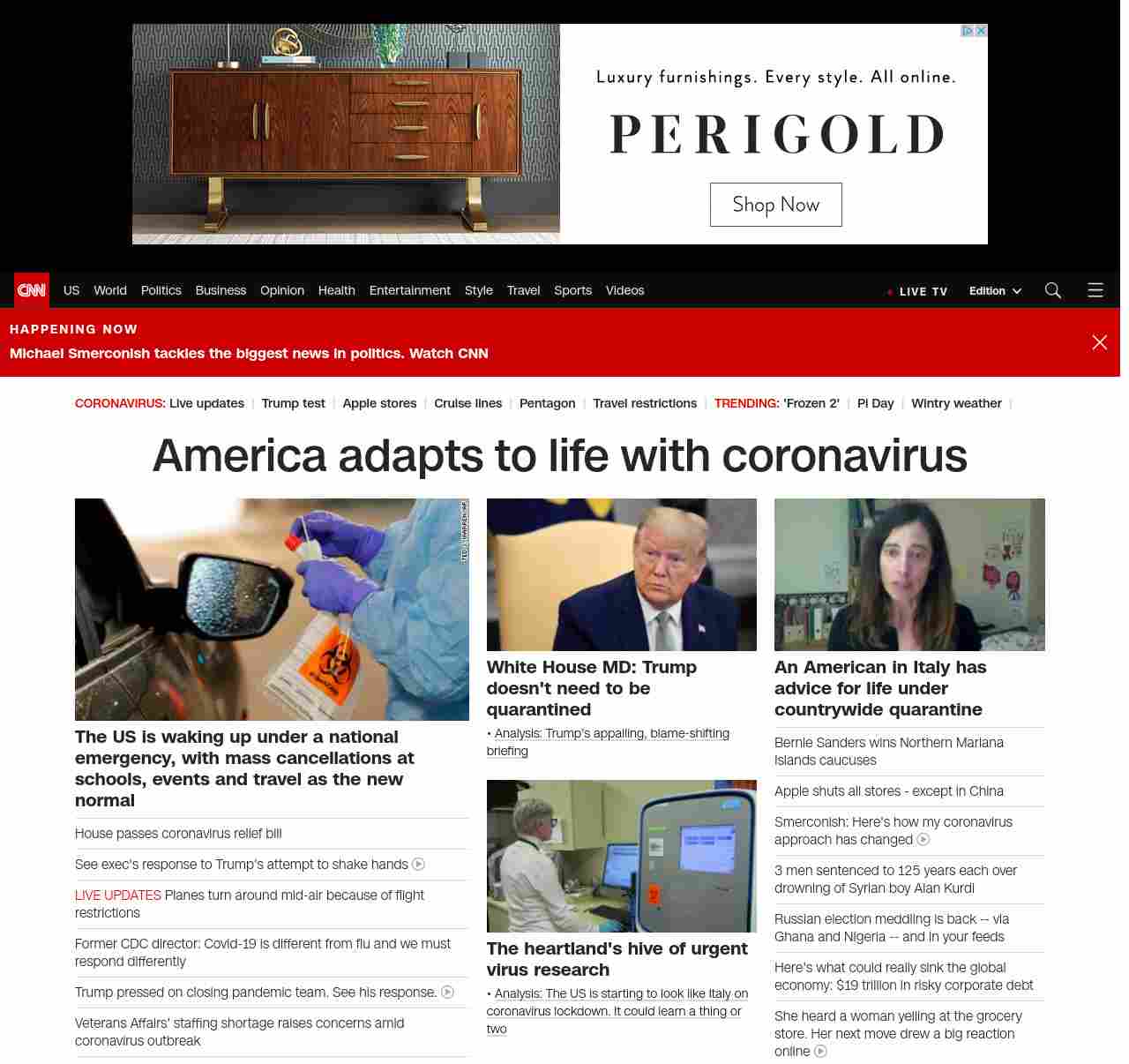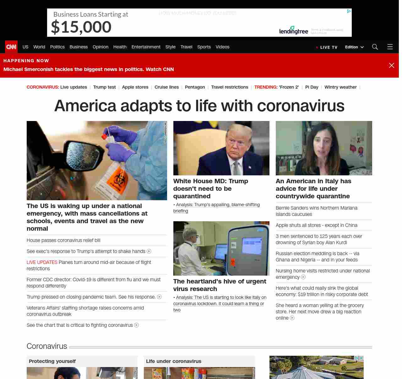 || banner-text–maximized banner-text-size–char-41″> America adapts to life with coronavirus ||” , title: “CNN – Breaking News, Latest News and Videos” , siblings: {“articleList”:[{“uri”:”/2020/03/14/health/us-coronavirus-weekend-updates/index.html”,”headline”:”u003cstrong>The US is waking up under a national emergency, with mass cancellations at schools, events and travel as the new normalu003c/strong>”,”thumbnail”:”//cdn.cnn.com/cnnnext/dam/assets/200314044740-01-coronavirus-0313-small-11.jpg”,”duration”:””,”description”:””,”layout”:””