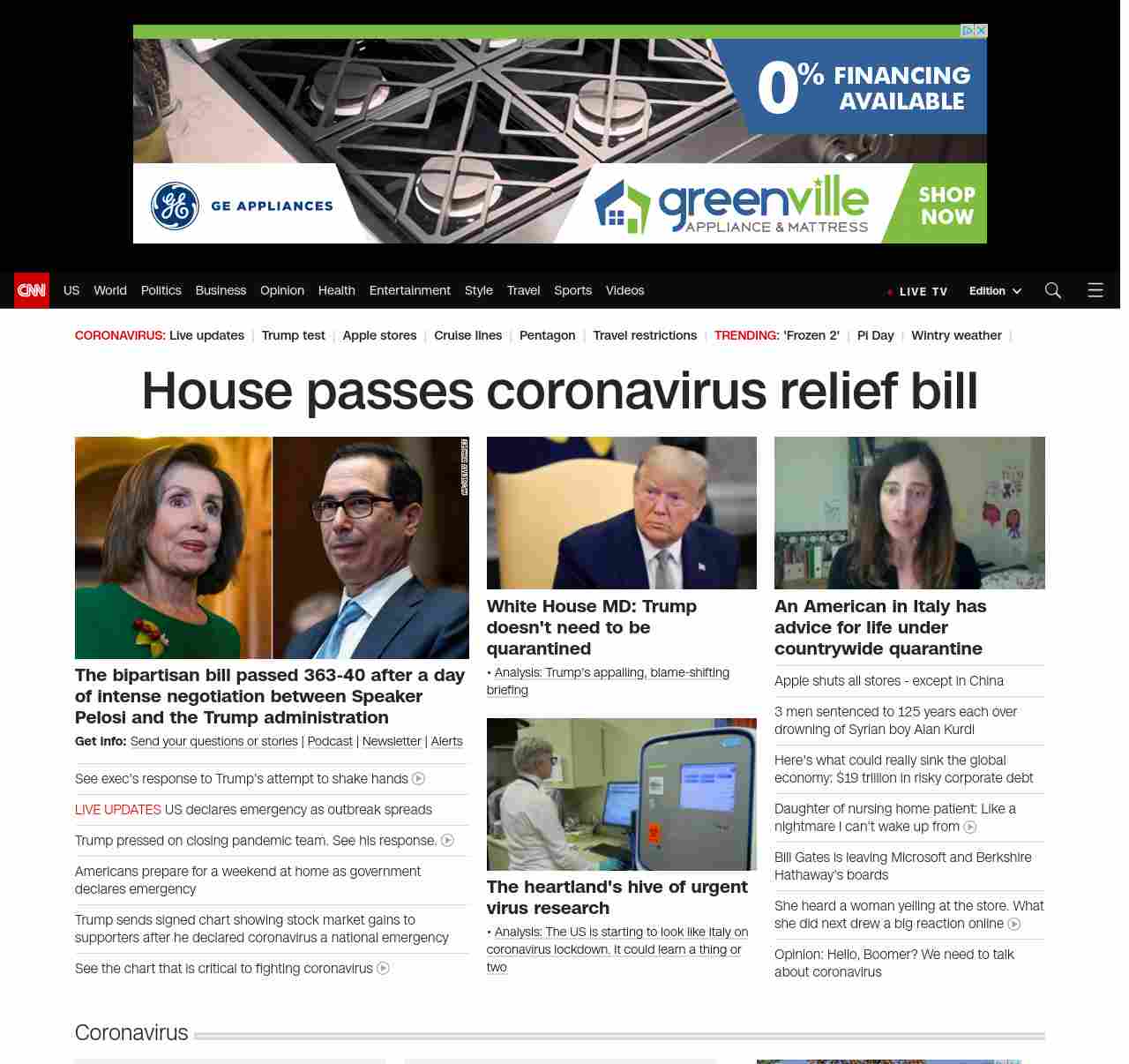 || banner-text–maximized banner-text-size–char-38″> House passes coronavirus relief bill ||” , title: “CNN – Breaking News, Latest News and Videos” , siblings: {“articleList”:[{“uri”:”/2020/03/13/politics/coronavirus-relief-congress/index.html”,”headline”:”u003cstrong>The bipartisan bill passed 363-40 after a day of intense negotiation between Speaker Pelosi and the Trump administrationu003c/strong>”,”thumbnail”:”//cdn.cnn.com/cnnnext/dam/assets/190715084321-nancy-pelosi-steven-mnuchin-split-small-11.jpg”,”duration”:””,”description”:”u003cstrong>Get info: u003c/strong>u003ca href=”https://www.cnn.com/2020/03/04/us/coronavirus-town-hall-questions/index.html” target=”_blank”>Send your questions or storiesu003c/a> | u003ca href=”https://www.cnn.com/audio/podcasts/corona-virus” target=”_blank”>Podcastu003c/a> | u003ca href=”https://www.cnn.com/specials/coronavirus-newsletter?utm_source=hp&source=hp” target=”_blank”>Newsletteru003c/a> | u003ca href=”https://www.cnn.com/specials/mobile-apps” target=”_blank”>Alertsu003c/a>”,”layout”:””
