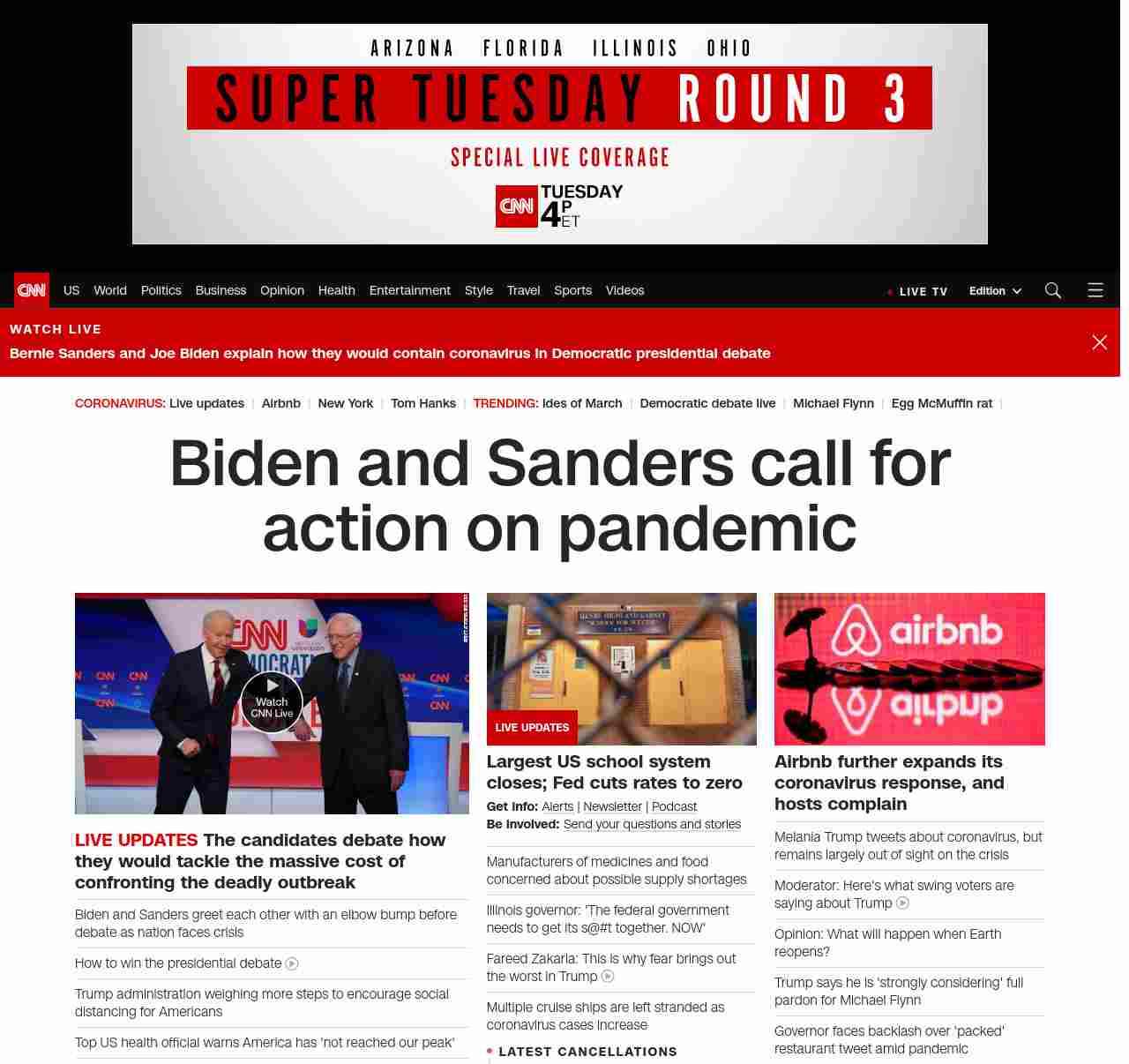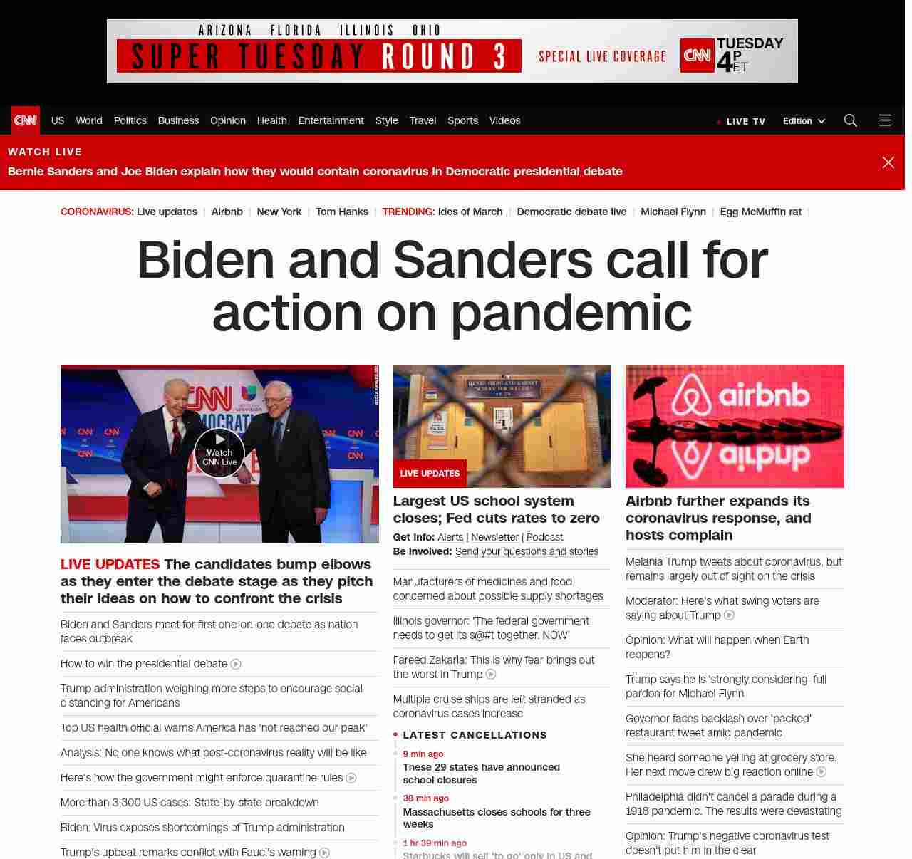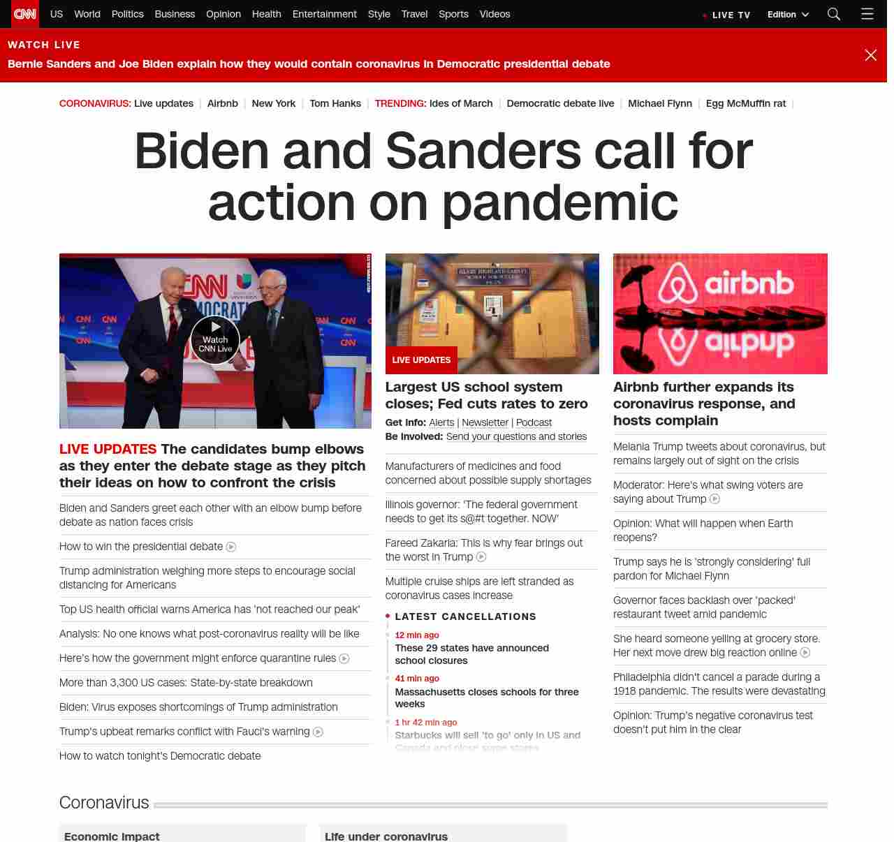 || banner-text–natural”> Biden and Sanders call for action on pandemic ||” , title: “CNN – Breaking News, Latest News and Videos” , siblings: {“articleList”:[{“uri”:”/politics/live-news/2020-democratic-debate-live-updates/index.html”,”headline”:”u003cstrong>The candidates debate how they would tackle the massive cost of confronting the deadly outbreaku003c/strong>”,”thumbnail”:”//cdn.cnn.com/cnnnext/dam/assets/200315200039-10-cnn-debate-0315-small-11.jpg”,”duration”:””,”description”:””,”layout”:””
