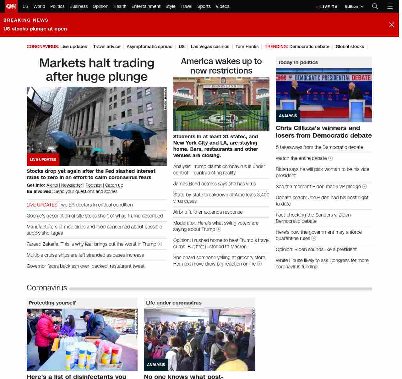 || screaming-banner-text banner-text-size–char-41″ data-analytics=”_list-hierarchical-xs_article_”> Markets halt trading after huge plunge ||” , title: “CNN – Breaking News, Latest News and Videos” , siblings: {“articleList”:[{“uri”:”/business/live-news/stock-market-news-today-031620/index.html”,”headline”:”u003cstrong>Stocks drop yet again after the Fed slashed interest rates to zero in an effort to calm coronavirus fearsu003c/strong>”,”thumbnail”:”//cdn.cnn.com/cnnnext/dam/assets/200313135303-02-nyse-0313-small-11.jpg”,”duration”:””,”description”:”u003cstrong>Get info: u003c/strong>u003ca href=”https://www.cnn.com/specials/mobile-apps” target=”_blank”>Alertsu003c/a> | u003ca href=”https://www.cnn.com/specials/coronavirus-newsletter?utm_source=hp&source=hp” target=”_blank”>Newsletteru003c/a> | u003ca href=”https://www.cnn.com/audio/podcasts/corona-virus” target=”_blank”>Podcastu003c/a> | u003ca href=”https://www.cnn.com/2020/03/16/world/newsletter-coronavirus-03-16-20-intl/index.html” target=”_blank”>Catch upu003c/a> | u003ca href=”https://www.cnn.com/specials/live-video-4″ target=”_blank”>NYSE Big Boardu003c/a>u003cbr />u003cstrong>Be involved: u003c/strong>u003ca href=”https://www.cnn.com/2020/03/04/us/coronavirus-town-hall-questions/index.html” target=”_blank”>Send your questions and storiesu003c/a>”,”layout”:””