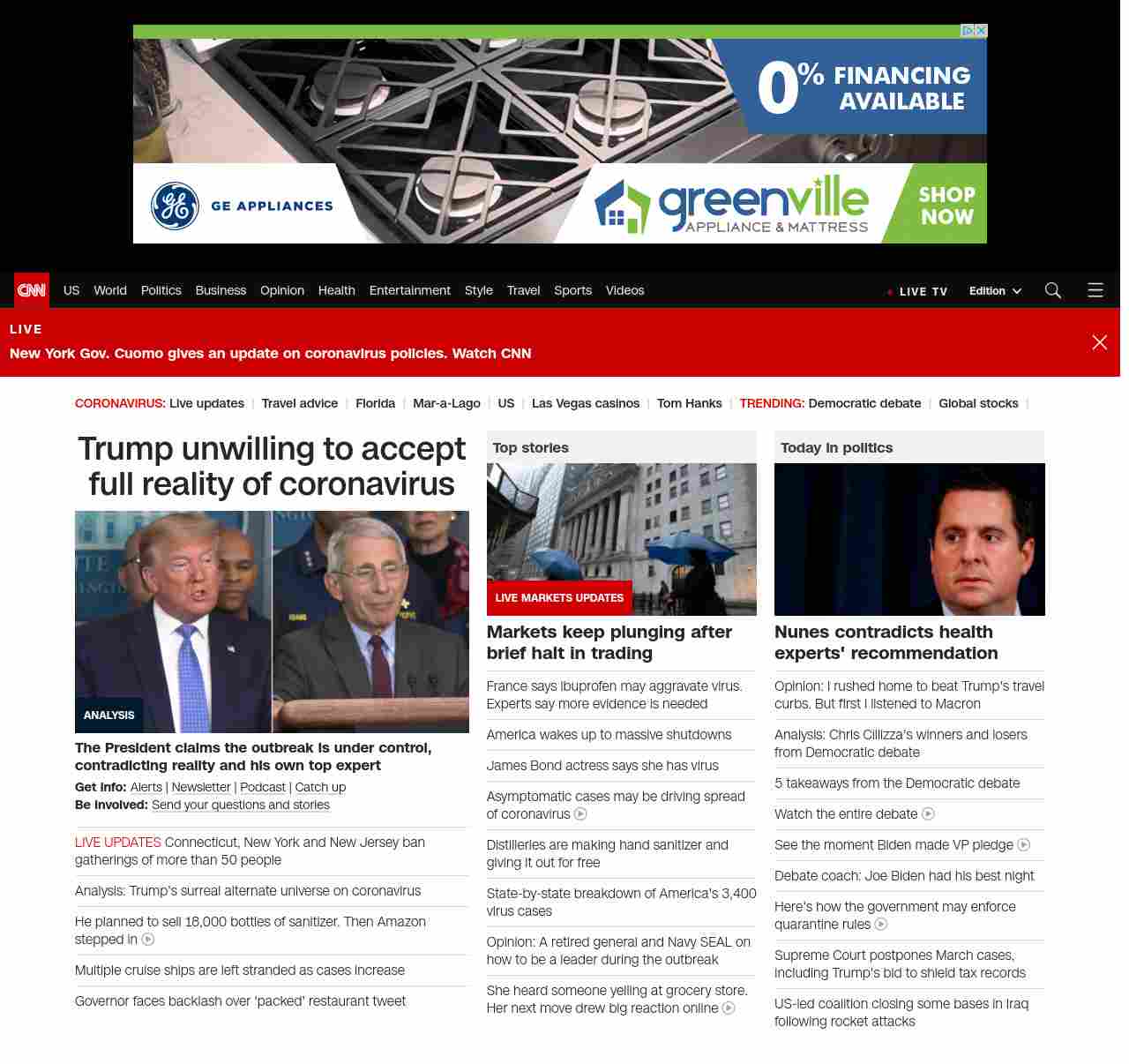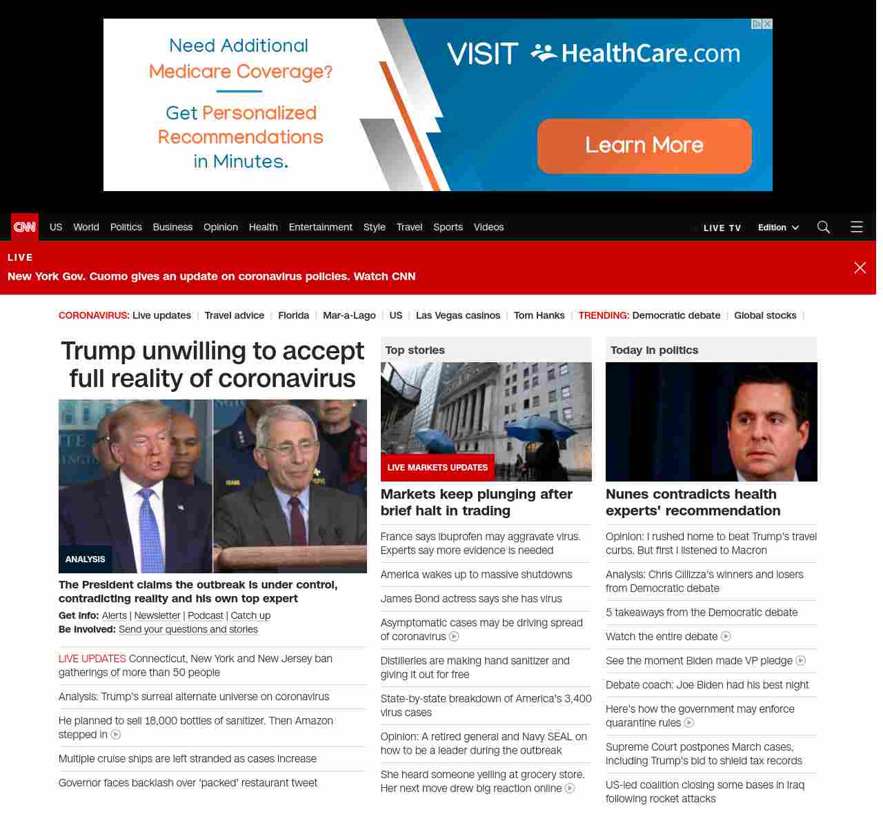 || screaming-banner-text banner-text-size–char-47″ data-analytics=”_list-hierarchical-xs_article_”> Trump unwilling to accept full reality of coronavirus ||” , title: “CNN – Breaking News, Latest News and Videos” , siblings: {“articleList”:[{“uri”:”/2020/03/16/politics/coronavirus-us-president-donald-trump-fauci-politics/index.html”,”headline”:”u003cstrong>The President claims the outbreak is under control, contradicting reality and his own top expertu003c/strong>”,”thumbnail”:”//cdn.cnn.com/cnnnext/dam/assets/200315195433-trump-fauci-small-11.jpg”,”duration”:””,”description”:”u003cstrong>Get info: u003c/strong>u003ca href=”https://www.cnn.com/specials/mobile-apps” target=”_blank”>Alertsu003c/a> | u003ca href=”https://www.cnn.com/specials/coronavirus-newsletter?utm_source=hp&source=hp” target=”_blank”>Newsletteru003c/a> | u003ca href=”https://www.cnn.com/audio/podcasts/corona-virus” target=”_blank”>Podcastu003c/a> | u003ca href=”https://www.cnn.com/2020/03/16/world/newsletter-coronavirus-03-16-20-intl/index.html” target=”_blank”>Catch upu003c/a>u003cbr />u003cstrong>Be involved: u003c/strong>u003ca href=”https://www.cnn.com/2020/03/11/us/coronavirus-testing-stories-invs/index.html” target=”_blank”>Send your questions and storiesu003c/a>”,”layout”:””