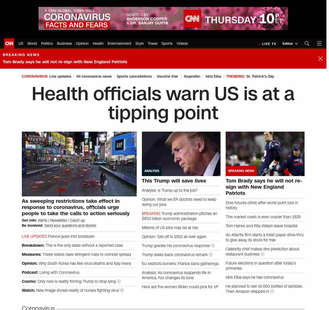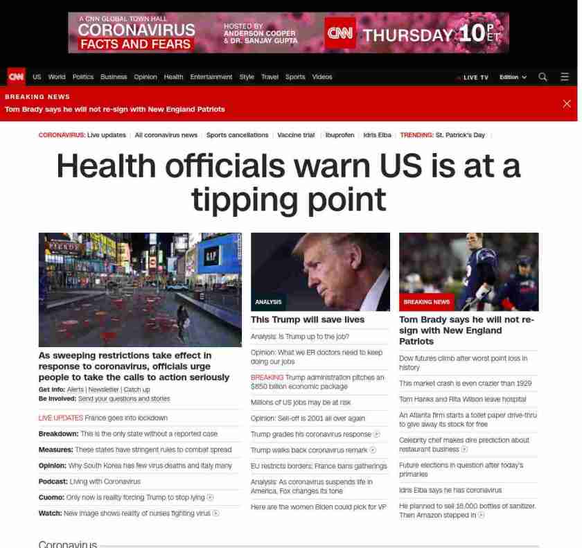 || banner-text–natural”> Health officials warn US is at a tipping point ||” , title: “CNN – Breaking News, Latest News and Videos” , siblings: {“articleList”:[{“uri”:”/2020/03/17/health/us-coronavirus-updates-tuesday/index.html”,”headline”:”u003cstrong>As sweeping restrictions take effect in response to coronavirus, officials urge people to take the calls to action seriouslyu003c/strong>”,”thumbnail”:”//cdn.cnn.com/cnnnext/dam/assets/200317023352-02-social-distancing-nyc-0316-small-11.jpg”,”duration”:””,”description”:”u003cstrong>Get info: u003c/strong>u003ca href=”https://www.cnn.com/specials/mobile-apps” target=”_blank”>Alertsu003c/a> | u003ca href=”https://www.cnn.com/specials/coronavirus-newsletter?utm_source=hp&source=hp” target=”_blank”>Newsletteru003c/a> | u003ca href=”https://www.cnn.com/2020/03/17/world/newsletter-coronavirus-03-17-20-intl/index.html” target=”_blank”>Catch upu003c/a>u003cbr />u003cstrong>Be involved: u003c/strong>u003ca href=”https://www.cnn.com/2020/03/11/us/coronavirus-testing-stories-invs/index.html” target=”_blank”>Send your questions and storiesu003c/a>”,”layout”:””