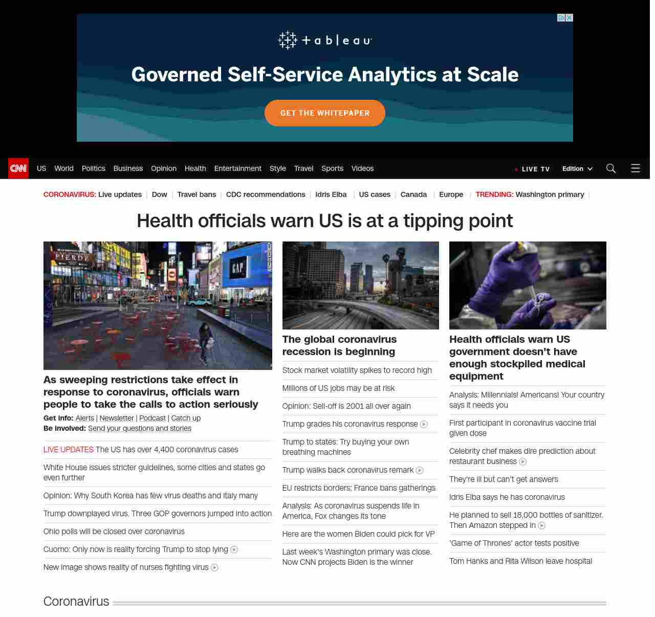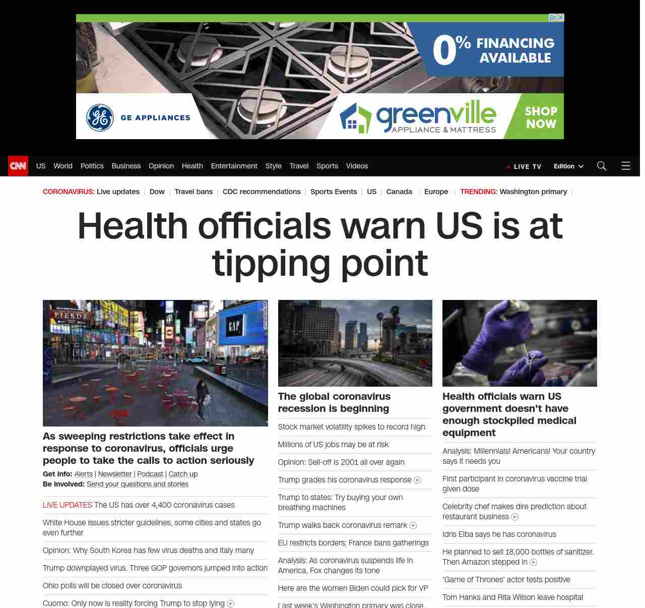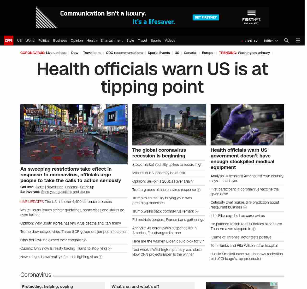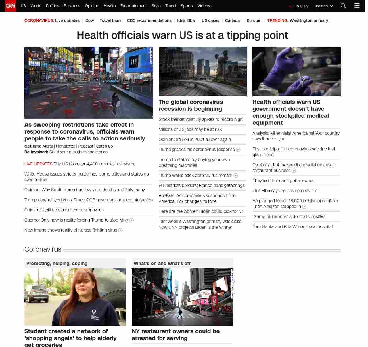 || banner-text–maximized banner-text-size–char-47″> Health officials warn US is at a tipping point ||” , title: “CNN – Breaking News, Latest News and Videos” , siblings: {“articleList”:[{“uri”:”/2020/03/17/health/us-coronavirus-updates-tuesday/index.html”,”headline”:”u003cstrong>As sweeping restrictions take effect in response to coronavirus, officials warn people to take the calls to action seriouslyu003c/strong>”,”thumbnail”:”//cdn.cnn.com/cnnnext/dam/assets/200317023352-02-social-distancing-nyc-0316-small-11.jpg”,”duration”:””,”description”:”u003cstrong>Get info: u003c/strong>u003ca href=”https://www.cnn.com/specials/mobile-apps” target=”_blank”>Alertsu003c/a> | u003ca href=”https://www.cnn.com/specials/coronavirus-newsletter?utm_source=hp&source=hp” target=”_blank”>Newsletteru003c/a> | u003ca href=”https://www.cnn.com/audio/podcasts/corona-virus” target=”_blank”>Podcastu003c/a> | u003ca href=”https://www.cnn.com/2020/03/16/world/newsletter-coronavirus-03-16-20-intl/index.html” target=”_blank”>Catch upu003c/a>u003cbr />u003cstrong>Be involved: u003c/strong>u003ca href=”https://www.cnn.com/2020/03/11/us/coronavirus-testing-stories-invs/index.html” target=”_blank”>Send your questions and storiesu003c/a>”,”layout”:””