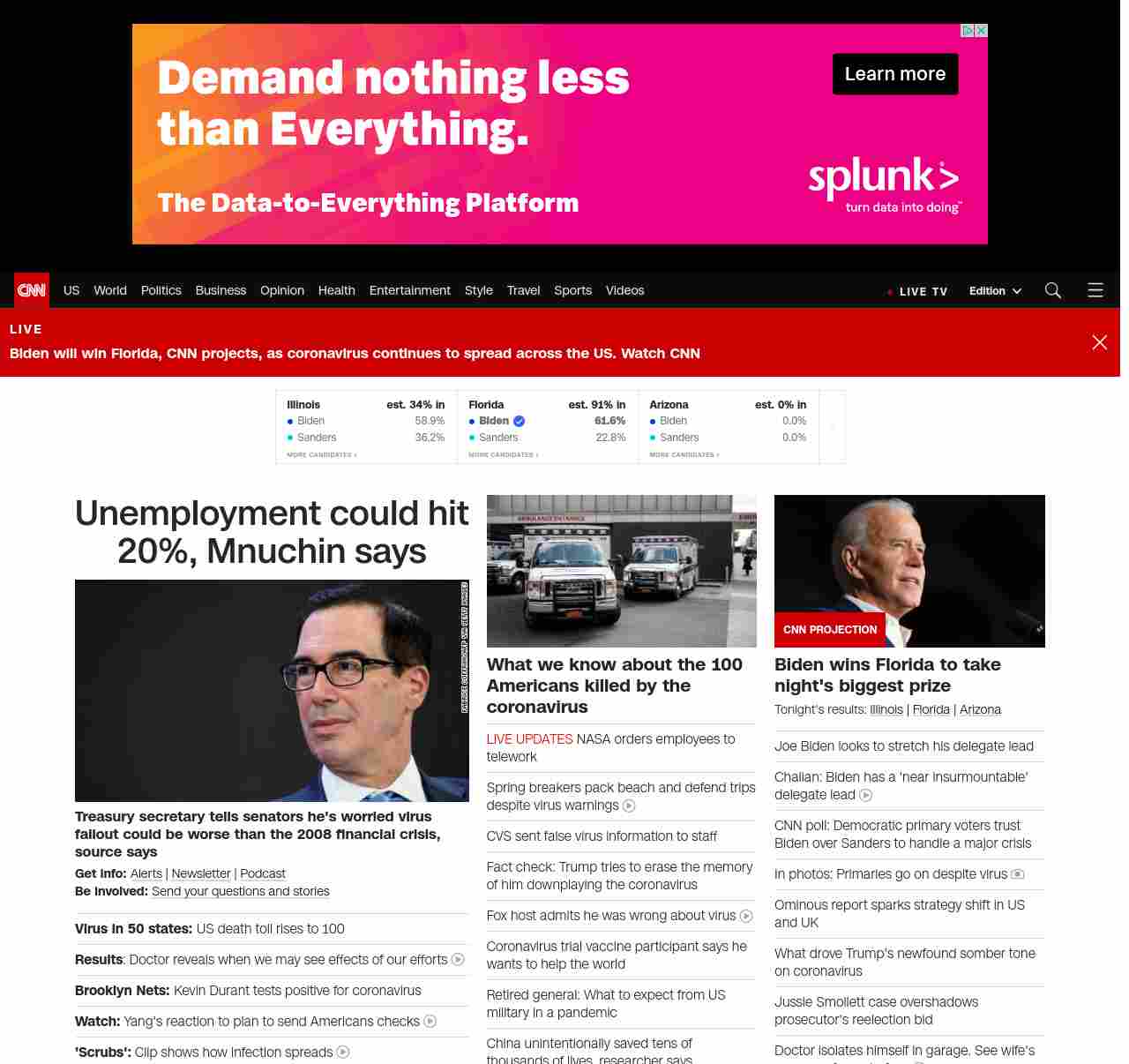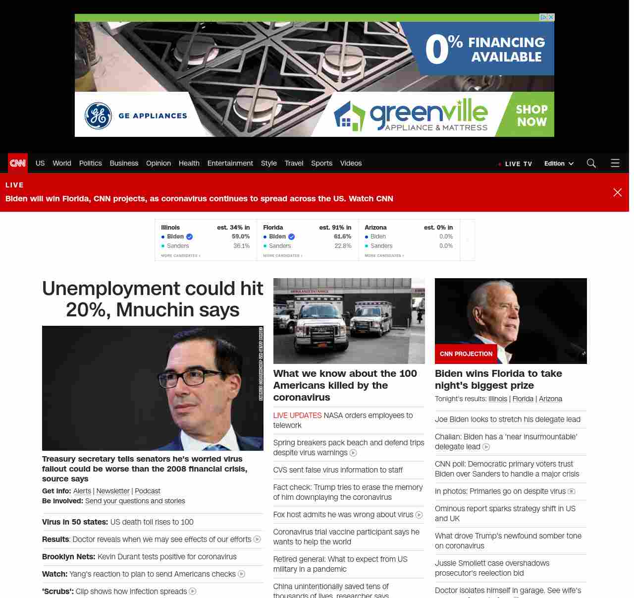 || screaming-banner-text banner-text-size–char-41″ data-analytics=”_list-hierarchical-xs_article_”> Unemployment could hit 20%, Mnuchin says ||” , title: “CNN – Breaking News, Latest News and Videos” , siblings: {“articleList”:[{“uri”:”/2020/03/17/politics/steven-mnuchin-unemployment-warning-coronavirus/index.html”,”headline”:”u003cstrong>Treasury secretary tells senators he’s worried virus fallout could be worse than the 2008 financial crisis, source saysu003c/strong>”,”thumbnail”:”//cdn.cnn.com/cnnnext/dam/assets/200122051245-steven-mnuchin-world-economic-forum-small-11.jpg”,”duration”:””,”description”:”u003cstrong>Get info: u003c/strong>u003ca href=”https://www.cnn.com/specials/mobile-apps” target=”_blank”>Alertsu003c/a> | u003ca href=”https://www.cnn.com/specials/coronavirus-newsletter?utm_source=hp&source=hp” target=”_blank”>Newsletteru003c/a> | u003ca href=”https://www.cnn.com/audio/podcasts/corona-virus”>Podcastu003c/a> u003cbr />u003cstrong>Be involved: u003c/strong>u003ca href=”https://www.cnn.com/2020/03/11/us/coronavirus-testing-stories-invs/index.html” target=”_blank”>Send your questions and storiesu003c/a>”,”layout”:””