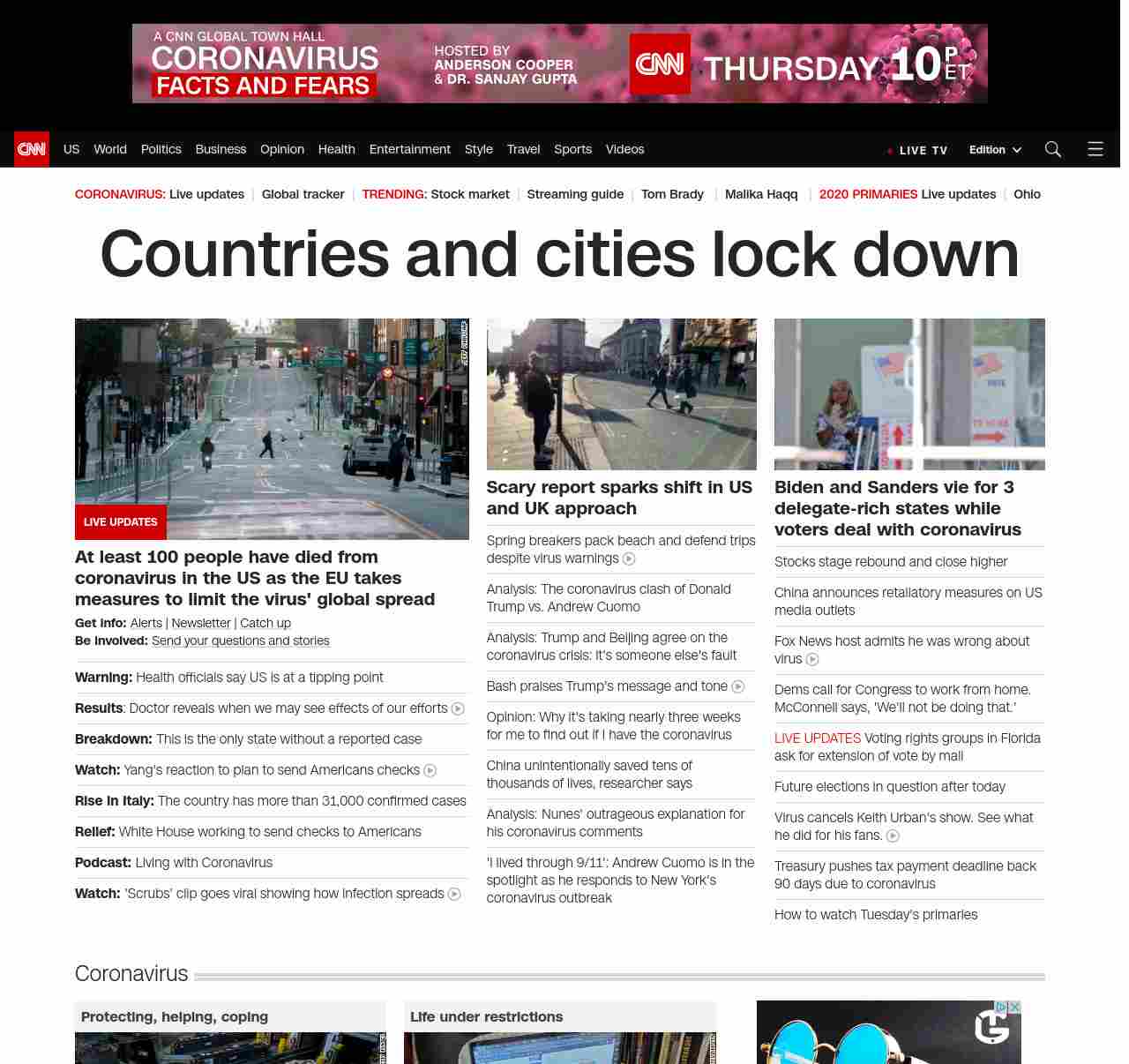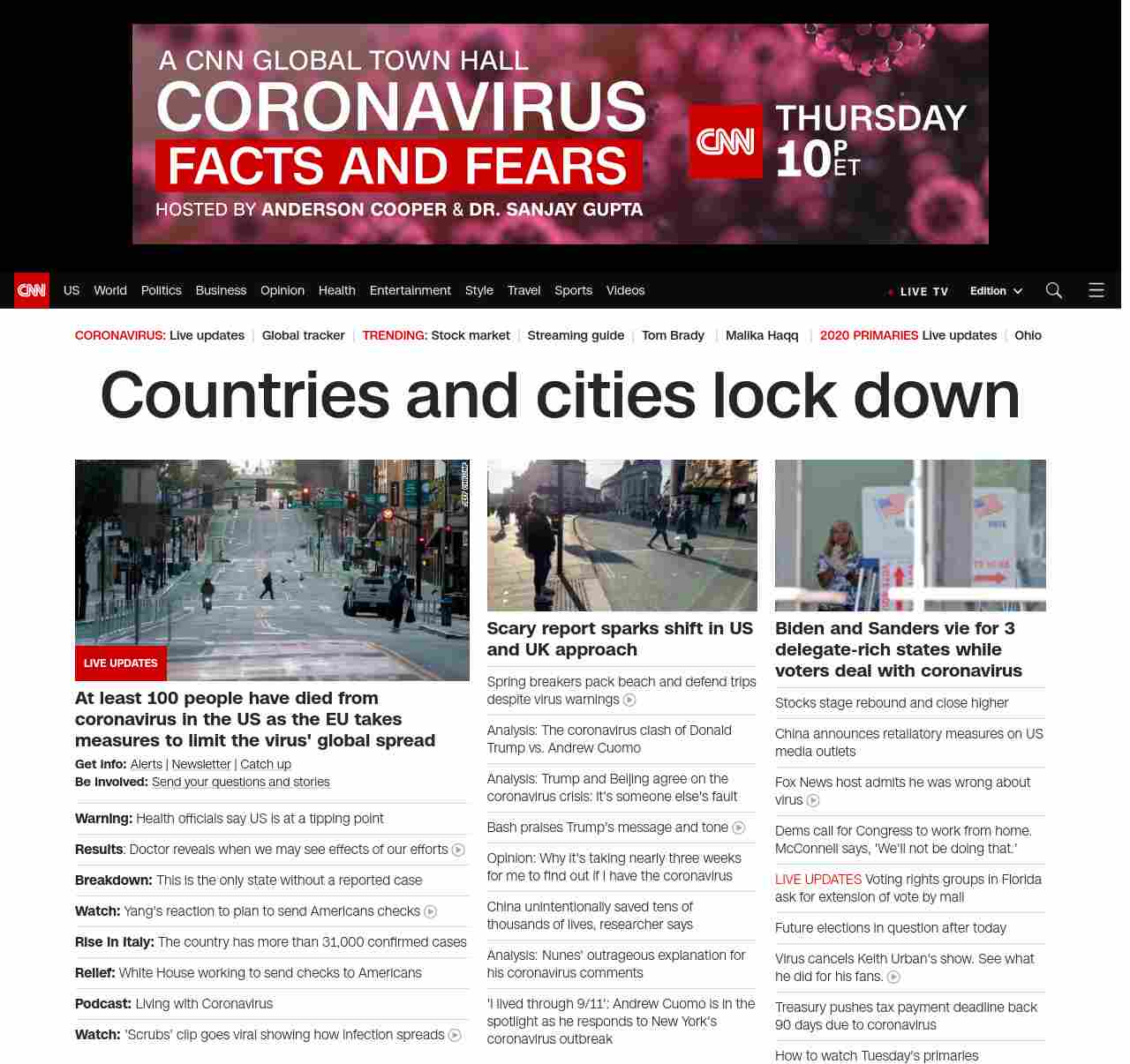 || banner-text–natural”> Countries and cities lock down ||” , title: “CNN – Breaking News, Latest News and Videos” , siblings: {“articleList”:[{“uri”:”/world/live-news/coronavirus-outbreak-03-17-20-intl-hnk/index.html”,”headline”:”u003cstrong>At least 100 people have died from coronavirus in the US as the EU takes measures to limit the virus’ global spreadu003c/strong>”,”thumbnail”:”//cdn.cnn.com/cnnnext/dam/assets/200317172647-02-san-francisco-lockdown-0317-small-11.jpg”,”duration”:””,”description”:”u003cstrong>Get info: u003c/strong>u003ca href=”https://www.cnn.com/specials/mobile-apps” target=”_blank”>Alertsu003c/a> | u003ca href=”https://www.cnn.com/specials/coronavirus-newsletter?utm_source=hp&source=hp” target=”_blank”>Newsletteru003c/a> | u003ca href=”https://www.cnn.com/2020/03/17/world/newsletter-coronavirus-03-17-20-intl/index.html” target=”_blank”>Catch upu003c/a>u003cbr />u003cstrong>Be involved: u003c/strong>u003ca href=”https://www.cnn.com/2020/03/11/us/coronavirus-testing-stories-invs/index.html” target=”_blank”>Send your questions and storiesu003c/a>”,”layout”:””