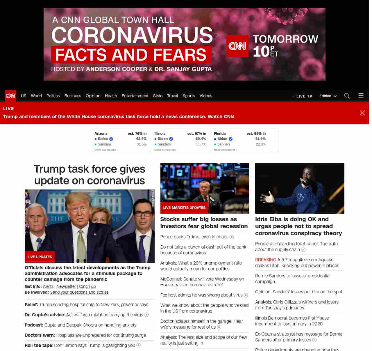 || screaming-banner-text banner-text-size–char-47″ data-analytics=”_list-hierarchical-xs_hyperlink_”> Trump task force gives update on coronavirus ||” , title: “CNN – Breaking News, Latest News and Videos” , siblings: {“articleList”:[{“uri”:”/videos/health/2020/03/18/gupta-act-like-you-have-the-coronavirus-sot-vpx.cnn”,”headline”:”u003cstrong>Dr. Gupta’s adviceu003c/strong>: Act as if you might be carrying the virus”,”thumbnail”:”//cdn.cnn.com/cnnnext/dam/assets/200317220502-sanjay-gupta-march-17-2020-02-small-11.jpg”,”duration”:”03:38″,”description”:”CNN’s u003ca href=”https://www.cnn.com/profiles/sanjay-gupta-profile” target=”_blank”>Dr. Sanjay Guptau003c/a> and u003ca href=”https://www.cnn.com/profiles/jake-tapper-profile” target=”_blank”>Jake Tapperu003c/a> discuss what you should be doing to make sure you don’t contract or spread novel coronavirus. Dr. Gupta recommends that you act like you have the virus to help you take proper measures.”,”layout”:””,”iconType”:”video”