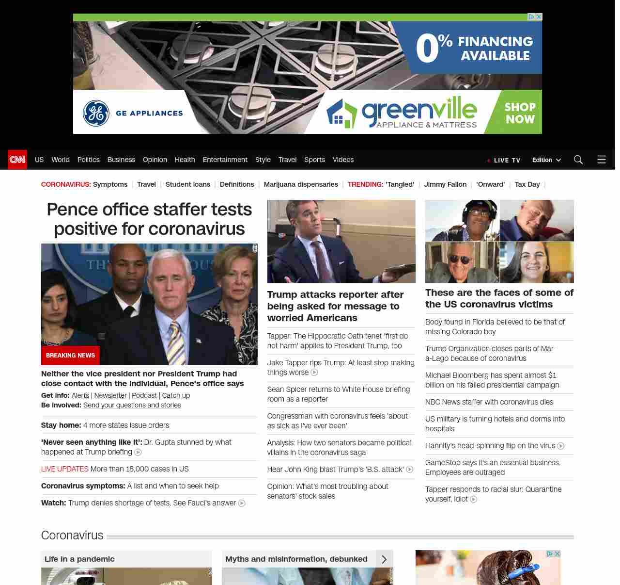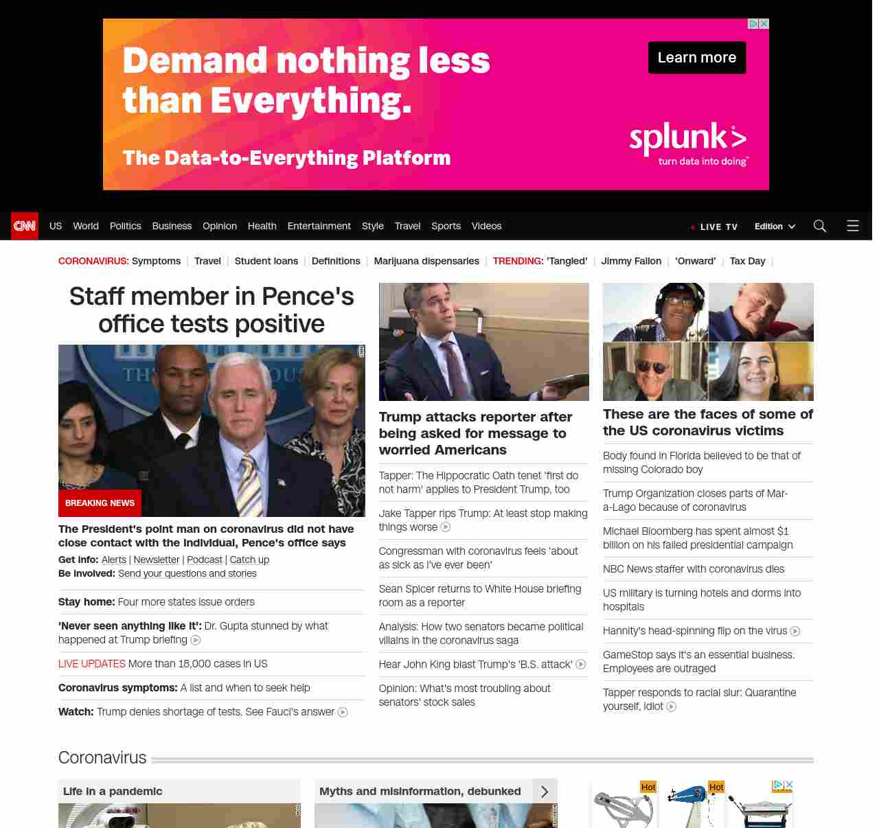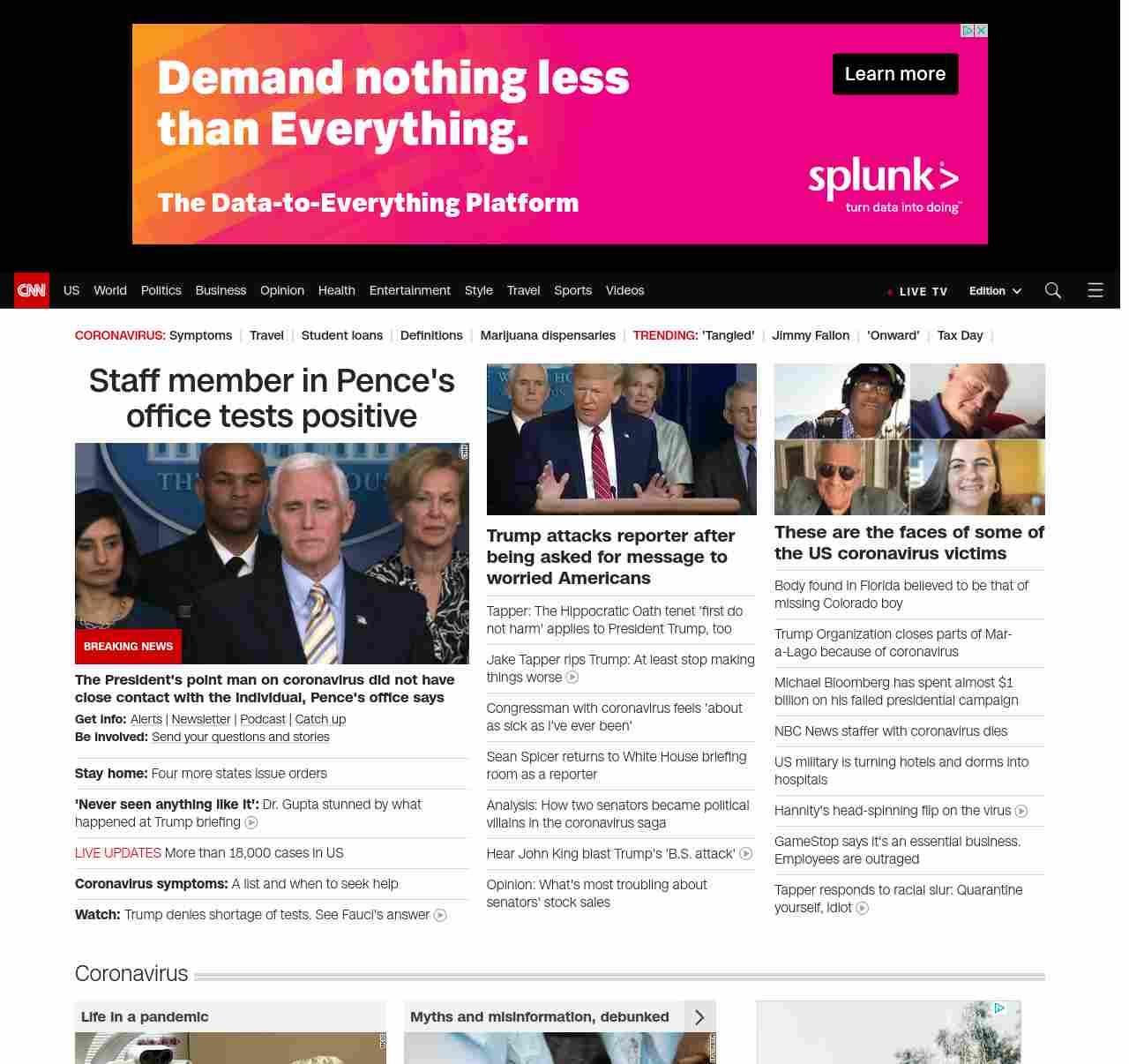 || screaming-banner-text banner-text-size–char-47″ data-analytics=”_list-hierarchical-xs_article_”> Staff member in Pence’s office tests positive ||” , title: “CNN – Breaking News, Latest News and Videos” , siblings: {“articleList”:[{“uri”:”/2020/03/20/politics/staffer-vice-president-office-coronavirus/index.html”,”headline”:”u003cstrong>The President’s point man on coronavirus did not have close contact with the individual, Pence’s office saysu003c/strong>”,”thumbnail”:”//cdn.cnn.com/cnnnext/dam/assets/200314131737-mike-pence-coronavirus-presser-small-11.jpg”,”duration”:””,”description”:”u003cstrong>Get info: u003c/strong>u003ca href=”https://www.cnn.com/specials/mobile-apps” target=”_blank”>Alertsu003c/a> | u003ca href=”https://www.cnn.com/specials/coronavirus-newsletter?utm_source=hp&source=hp” target=”_blank”>Newsletteru003c/a> | u003ca href=”https://www.cnn.com/audio/podcasts/corona-virus”>Podcastu003c/a> | u003ca href=”https://www.cnn.com/2020/03/20/world/coronavirus-newsletter-03-20-20/index.html” target=”_blank”>Catch upu003c/a>u003cbr />u003cstrong>Be involved: u003c/strong>u003ca href=”http://www.cnn.com/2020/03/20/us/coronavirus-healthcare-worker-callout/index.html” target=”_blank”>Send your questions and storiesu003c/a>”,”layout”:””
