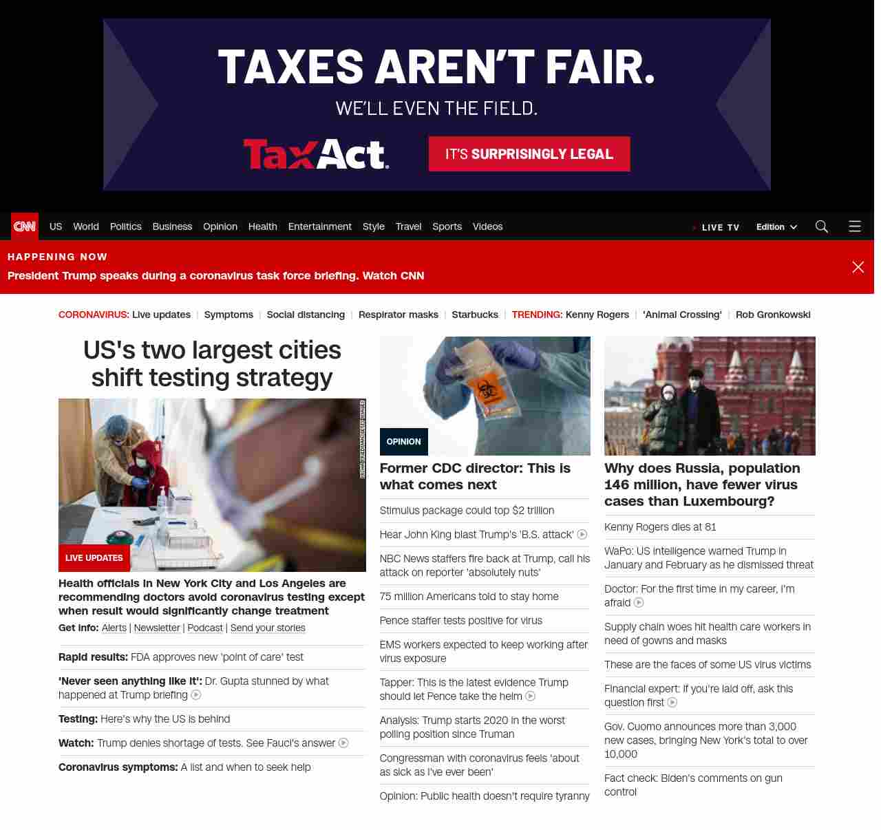 || screaming-banner-text banner-text-size–char-47″ data-analytics=”_list-hierarchical-xs_hyperlink_”> US’s two largest cities shift testing strategy ||” , title: “CNN – Breaking News, Latest News and Videos” , siblings: {“articleList”:[{“uri”:”/videos/politics/2020/03/20/trump-anthony-fauci-coronavirus-drugs-gupta-ip-vpx.cnn”,”headline”:”u003cstrong>’Never seen anything like it’:u003c/strong> Dr. Gupta stunned by what happened at Trump briefing”,”thumbnail”:”//cdn.cnn.com/cnnnext/dam/assets/200320140708-gupta-fauci-trump-split-small-11.jpg”,”duration”:”02:09″,”description”:”President Trump made false claims about possible treatments for the coronavirus, and expert Dr. Anthony Fauci had to tamp down optimism about the treatments at a press conference.”,”layout”:””,”iconType”:”video”