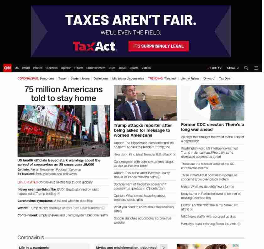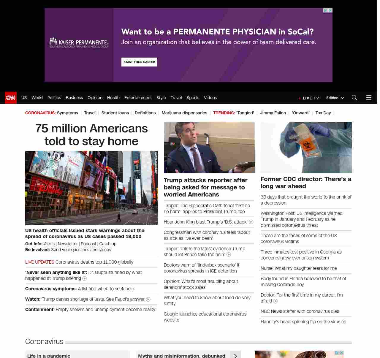 || screaming-banner-text banner-text-size–char-41″ data-analytics=”_list-hierarchical-xs_article_”> 75 million Americans told to stay home ||” , title: “CNN – Breaking News, Latest News and Videos” , siblings: {“articleList”:[{“uri”:”/2020/03/21/health/us-coronavirus-wrap-saturday/index.html”,”headline”:”u003cstrong>US health officials issued stark warnings about the spread of coronavirus as US cases passed 18,000u003c/strong>”,”thumbnail”:”//cdn.cnn.com/cnnnext/dam/assets/200321030657-01-new-york-coronavirus-0320-small-11.jpg”,”duration”:””,”description”:”u003cstrong>Get info: u003c/strong>u003ca href=”https://www.cnn.com/specials/mobile-apps” target=”_blank”>Alertsu003c/a> | u003ca href=”https://www.cnn.com/specials/coronavirus-newsletter?utm_source=hp&source=hp” target=”_blank”>Newsletteru003c/a> | u003ca href=”https://www.cnn.com/audio/podcasts/corona-virus”>Podcastu003c/a> u003cbr />u003cstrong>Be involved: u003c/strong>u003ca href=”http://www.cnn.com/2020/03/20/us/coronavirus-healthcare-worker-callout/index.html” target=”_blank”>Send your questions and storiesu003c/a>”,”layout”:””