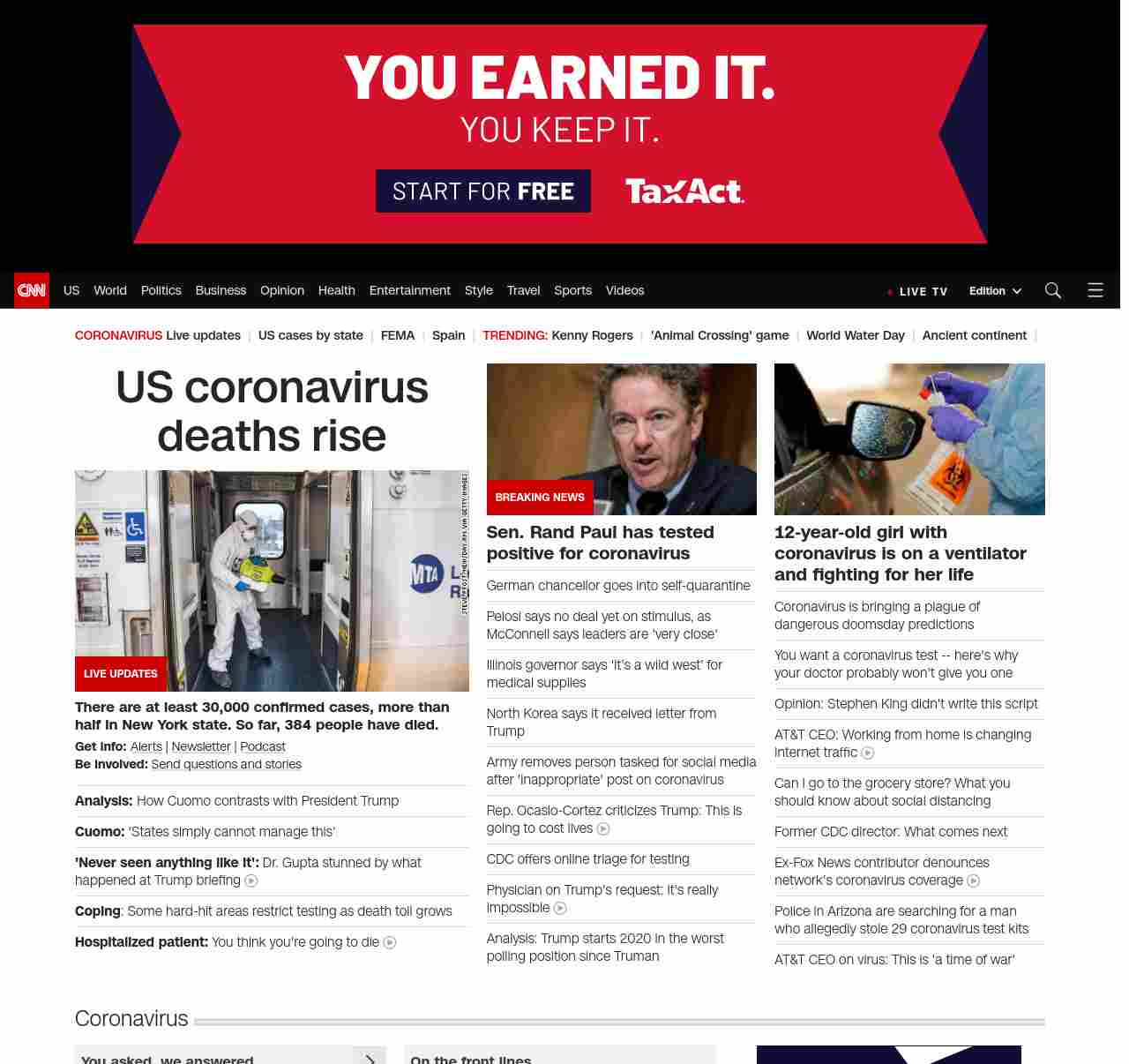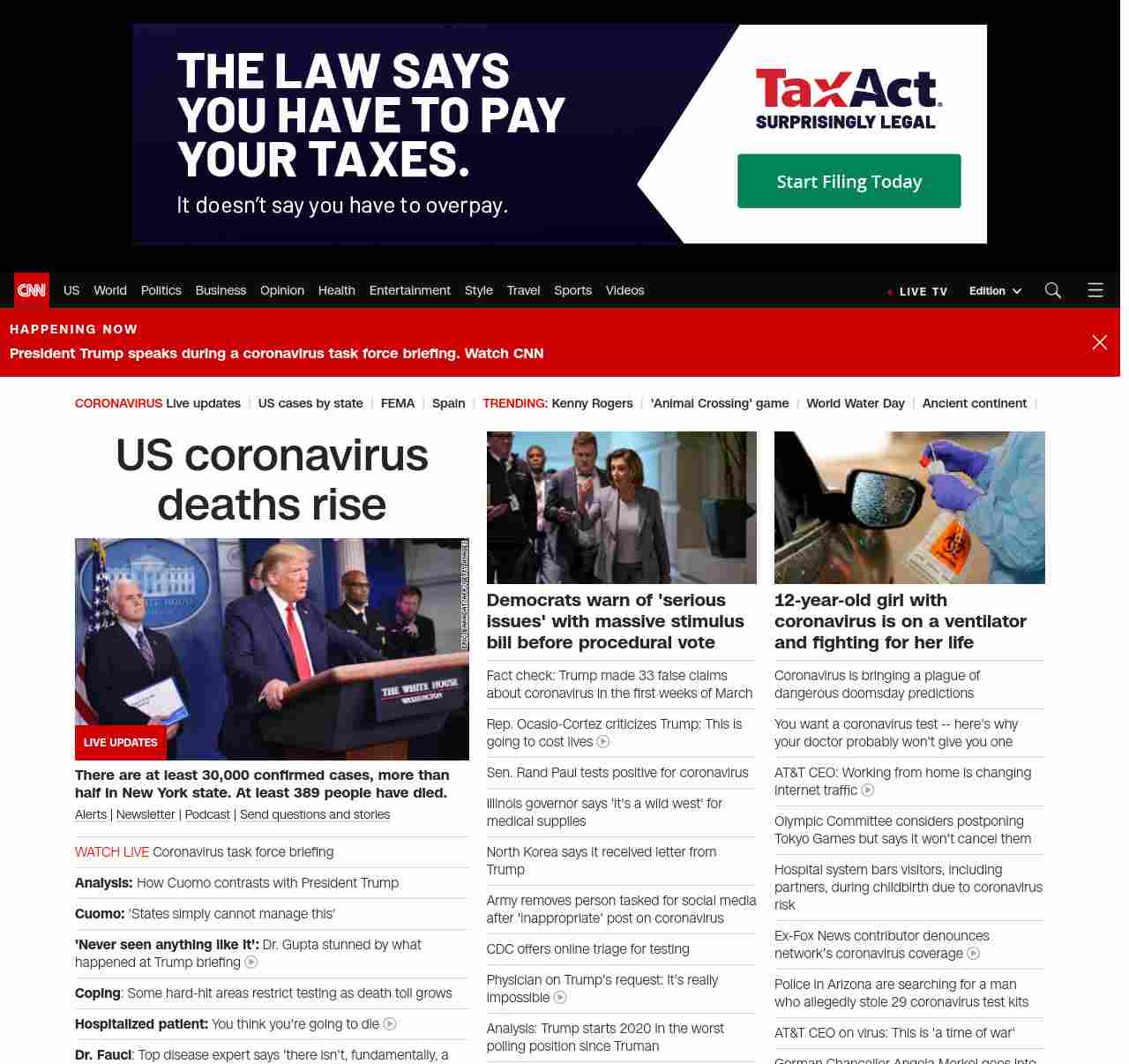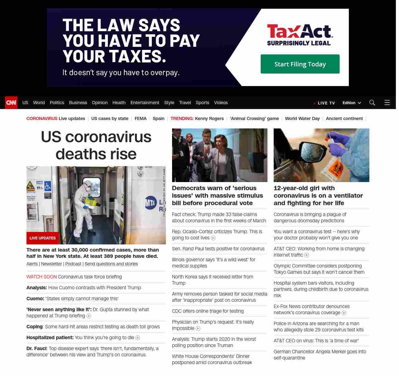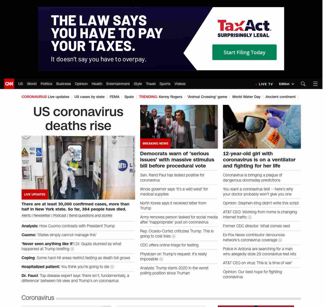 || screaming-banner-text banner-text-size–char-29″ data-analytics=”_list-hierarchical-xs_article_”> US coronavirus deaths rise ||” , title: “CNN – Breaking News, Latest News and Videos” , siblings: {“articleList”:[{“uri”:”/world/live-news/coronavirus-outbreak-03-22-20/index.html”,”headline”:”u003cstrong>There are at least 30,000 confirmed cases, more than half in New York state. So far, at least 389 people have died.u003c/strong>”,”thumbnail”:”//cdn.cnn.com/cnnnext/dam/assets/200322144307-01-coronavirus-long-island-rail-0319-small-11.jpg”,”duration”:””,”description”:”u003ca href=”https://www.cnn.com/specials/mobile-apps” target=”_blank”>Alertsu003c/a> | u003ca href=”https://www.cnn.com/specials/coronavirus-newsletter?utm_source=hp&source=hp” target=”_blank”>Newsletteru003c/a> | u003ca href=”https://www.cnn.com/audio/podcasts/corona-virus”>Podcastu003c/a> | u003ca href=”http://www.cnn.com/2020/03/20/us/coronavirus-healthcare-worker-callout/index.html” target=”_blank”>Send questions and storiesu003c/a>”,”layout”:””