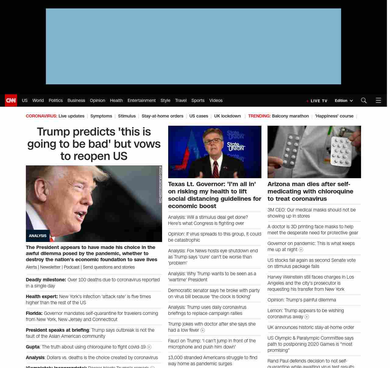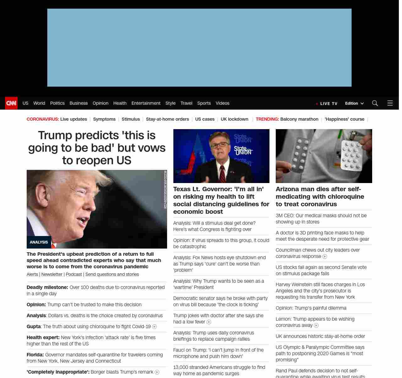 || screaming-banner-text banner-text-size–char-47″ data-analytics=”_list-hierarchical-xs_article_”> Trump predicts ‘this is going to be bad’ but vows to reopen US ||” , title: “CNN – Breaking News, Latest News and Videos” , siblings: {“articleList”:[{“uri”:”/2020/03/24/politics/donald-trump-coronavirus-strategy/index.html”,”headline”:”u003cstrong>The President appears to have made his choice in the awful dilemma posed by the pandemic, whether to destroy the nation’s economic foundation to save livesu003c/strong>”,”thumbnail”:”//cdn.cnn.com/cnnnext/dam/assets/200319121026-03-trump-coronoavirus-briefing-0319-small-11.jpg”,”duration”:””,”description”:”u003ca href=”https://www.cnn.com/specials/mobile-apps” target=”_blank”>Alertsu003c/a> | u003ca href=”https://www.cnn.com/specials/coronavirus-newsletter?utm_source=hp&source=hp” target=”_blank”>Newsletteru003c/a> | u003ca href=”https://www.cnn.com/audio/podcasts/corona-virus”>Podcastu003c/a> | u003ca href=”http://www.cnn.com/2020/03/20/us/coronavirus-healthcare-worker-callout/index.html” target=”_blank”>Send questions and storiesu003c/a>”,”layout”:””