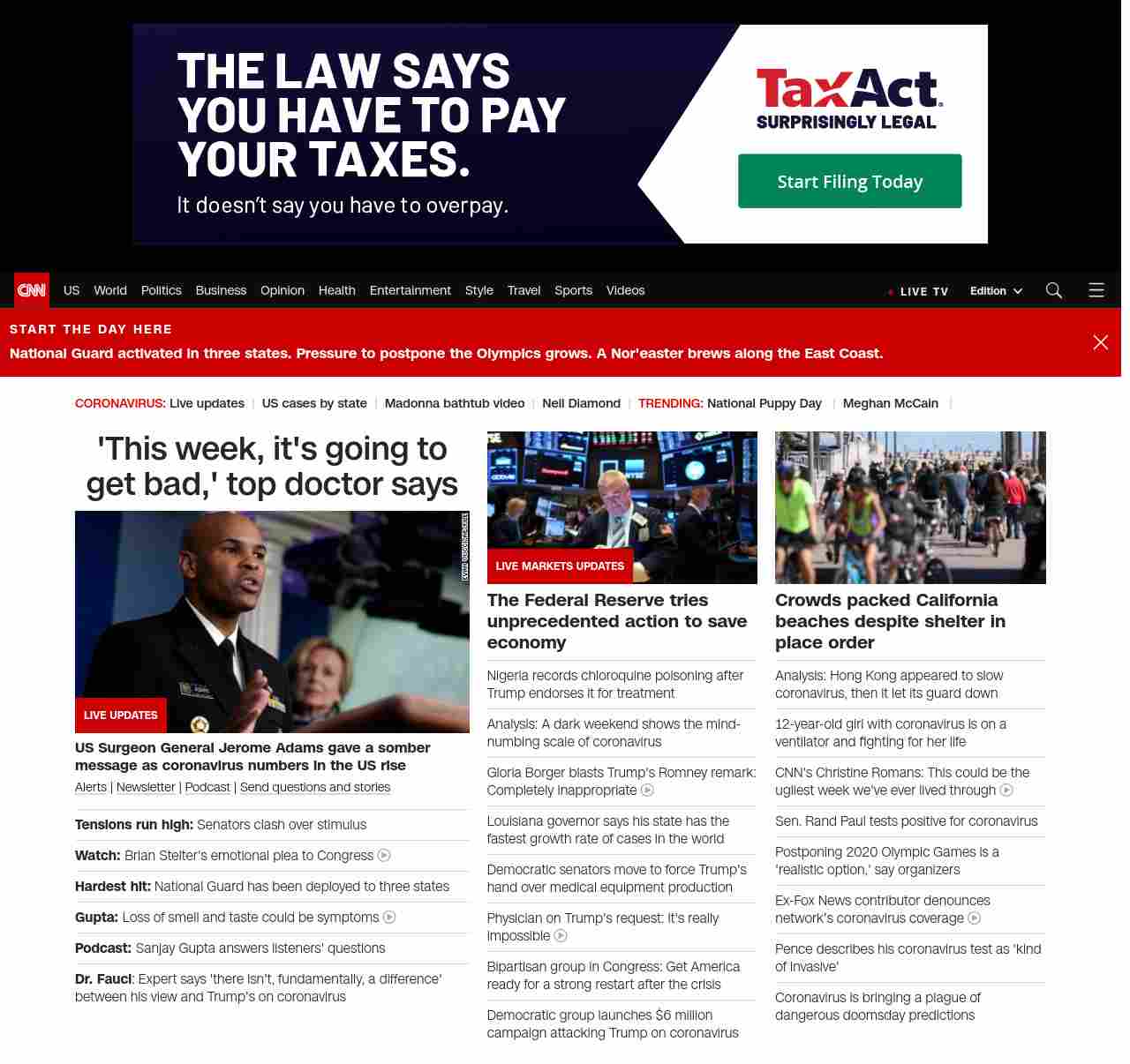 || screaming-banner-text banner-text-size–char-47″ data-analytics=”_list-hierarchical-xs_hyperlink_”> ‘This week, it’s going to get bad,’ top doctor says ||” , title: “CNN – Breaking News, Latest News and Videos” , siblings: {“articleList”:[{“uri”:”/2020/03/23/politics/fauci-trump-science-interview/index.html”,”headline”:”u003cstrong>Fauci on Trump:u003c/strong> ‘I can’t jump in front of the microphone and push him down'”,”thumbnail”:”//cdn.cnn.com/cnnnext/dam/assets/200320141601-trump-fauci-split-3-20-small-11.jpg”,”duration”:””,”description”:”The nation’s top infectious disease expert, Dr. Anthony Fauci, described the challenges of working with the Trump administration during the u003ca href=”https://www.cnn.com/world/live-news/coronavirus-outbreak-03-23-20-intl-hnk/index.html” target=”_blank”>coronavirus pandemicu003c/a> in an interview with journal u003ca href=”https://www.sciencemag.org/news/2020/03/i-m-going-keep-pushing-anthony-fauci-tries-make-white-house-listen-facts-pandemic” target=”_blank”>Scienceu003c/a> published Sunday.”,”layout”:””