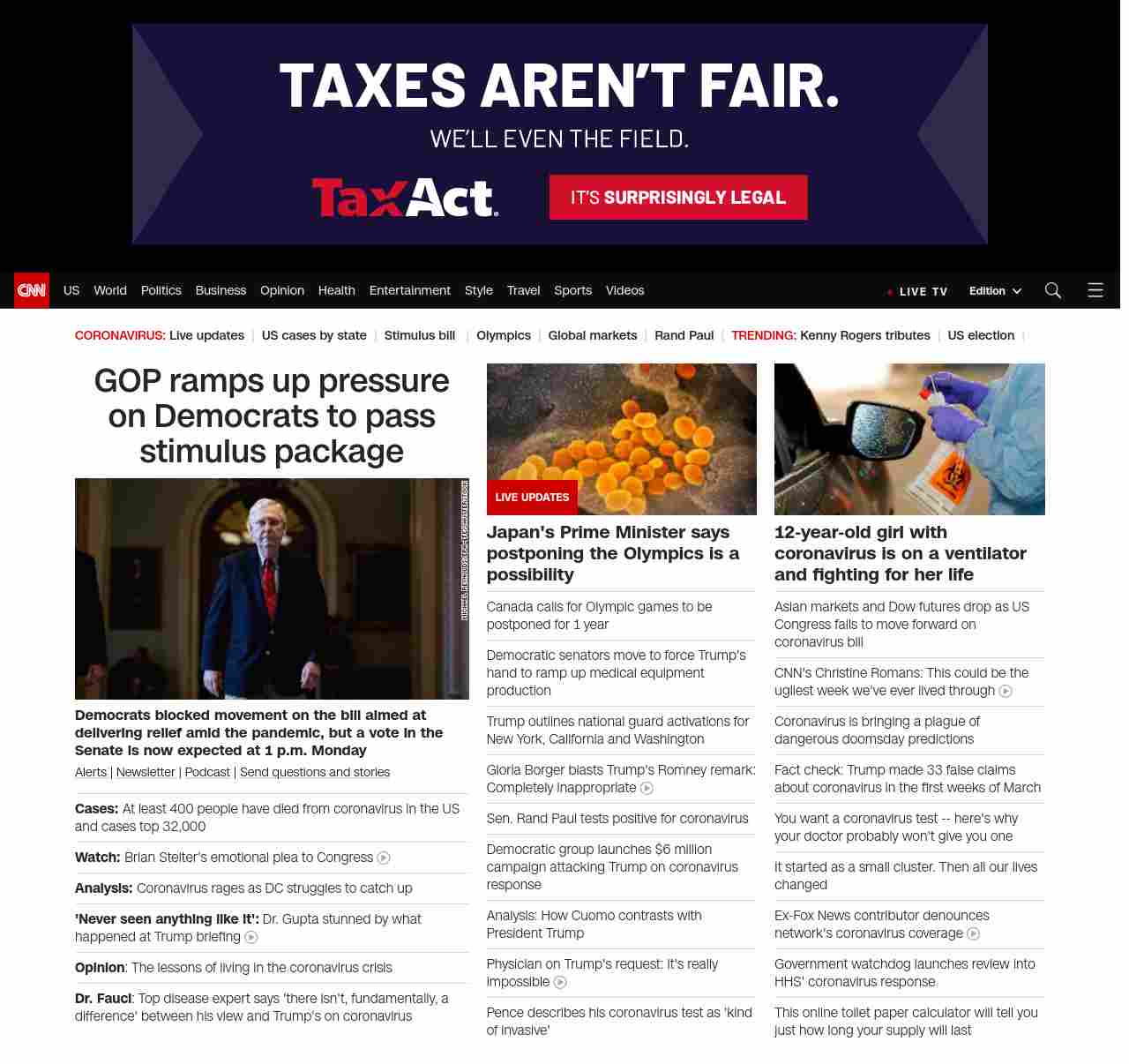 || screaming-banner-text banner-text-size–char-47″ data-analytics=”_list-hierarchical-xs_article_”> GOP ramps up pressure on Democrats to pass stimulus package ||” , title: “CNN – Breaking News, Latest News and Videos” , siblings: {“articleList”:[{“uri”:”/2020/03/22/politics/stimulus-package-coronavirus-negotiations-congress/index.html”,”headline”:”u003cstrong>Democrats blocked movement on the bill aimed at delivering relief amid the pandemic, but a vote in the Senate is now expected at 1 p.m. Mondayu003c/strong>”,”thumbnail”:”//cdn.cnn.com/cnnnext/dam/assets/200322233657-mitch-mcconnell-0321-small-11.jpg”,”duration”:””,”description”:”u003ca href=”https://www.cnn.com/specials/mobile-apps” target=”_blank”>Alertsu003c/a> | u003ca href=”https://www.cnn.com/specials/coronavirus-newsletter?utm_source=hp&source=hp” target=”_blank”>Newsletteru003c/a> | u003ca href=”https://www.cnn.com/audio/podcasts/corona-virus”>Podcastu003c/a> | u003ca href=”http://www.cnn.com/2020/03/20/us/coronavirus-healthcare-worker-callout/index.html” target=”_blank”>Send questions and storiesu003c/a>”,”layout”:””