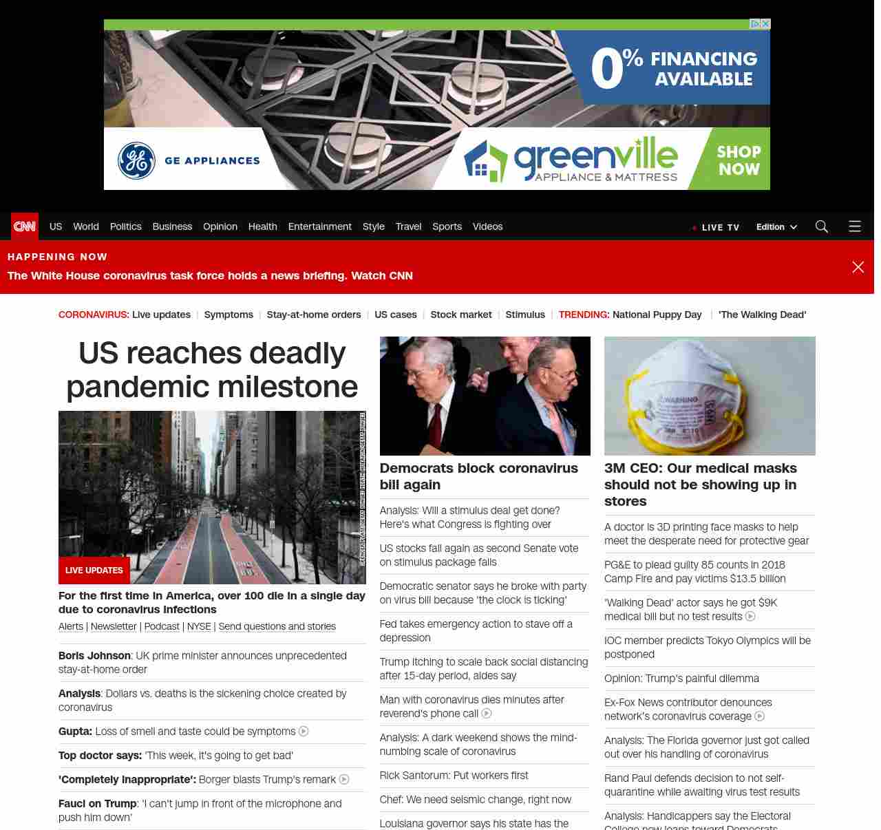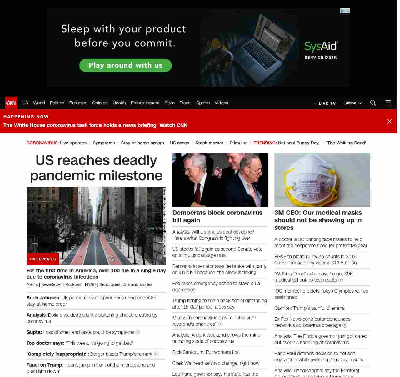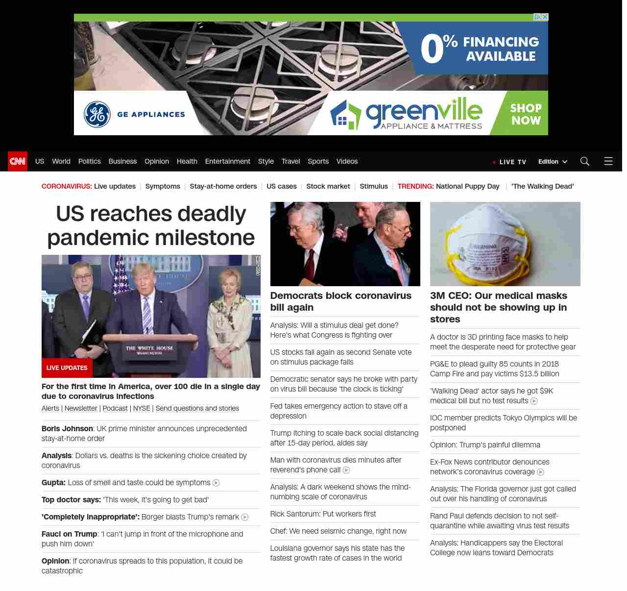 || screaming-banner-text banner-text-size–char-38″ data-analytics=”_list-hierarchical-xs_article_”> US reaches deadly pandemic milestone ||” , title: “CNN – Breaking News, Latest News and Videos” , siblings: {“articleList”:[{“uri”:”/world/live-news/coronavirus-outbreak-03-23-20-intl-hnk/index.html”,”headline”:”u003cstrong>For the first time in America, over 100 die in a single day due to coronavirus infectionsu003c/strong>”,”thumbnail”:”//cdn.cnn.com/cnnnext/dam/assets/200323181251-01-coronavirus-presser-0323-trump-small-11.jpg”,”duration”:””,”description”:”u003ca href=”https://www.cnn.com/specials/mobile-apps” target=”_blank”>Alertsu003c/a> | u003ca href=”https://www.cnn.com/specials/coronavirus-newsletter?utm_source=hp&source=hp” target=”_blank”>Newsletteru003c/a> | u003ca href=”https://www.cnn.com/audio/podcasts/corona-virus”>Podcastu003c/a> | u003ca href=”https://www.cnn.com/specials/live-video-4″ target=”_blank”>NYSEu003c/a> | u003ca href=”http://www.cnn.com/2020/03/20/us/coronavirus-healthcare-worker-callout/index.html” target=”_blank”>Send questions and storiesu003c/a>”,”layout”:””