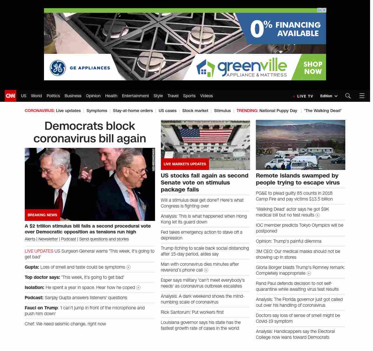 || screaming-banner-text banner-text-size–char-41″ data-analytics=”_list-hierarchical-xs_article_”> Democrats block coronavirus bill again ||” , title: “CNN – Breaking News, Latest News and Videos” , siblings: {“articleList”:[{“uri”:”/2020/03/23/politics/coronavirus-economic-stimulus-senate/index.html”,”headline”:”u003cstrong>A $2 trillion stimulus bill fails a second procedural vote over Democratic opposition as tensions run highu003c/strong>”,”thumbnail”:”//cdn.cnn.com/cnnnext/dam/assets/200309180917-mcconnell-schumer-file-small-11.jpg”,”duration”:””,”description”:”u003ca href=”https://www.cnn.com/specials/mobile-apps” target=”_blank”>Alertsu003c/a> | u003ca href=”https://www.cnn.com/specials/coronavirus-newsletter?utm_source=hp&source=hp” target=”_blank”>Newsletteru003c/a> | u003ca href=”https://www.cnn.com/audio/podcasts/corona-virus”>Podcastu003c/a> | u003ca href=”http://www.cnn.com/2020/03/20/us/coronavirus-healthcare-worker-callout/index.html” target=”_blank”>Send questions and storiesu003c/a>”,”layout”:””