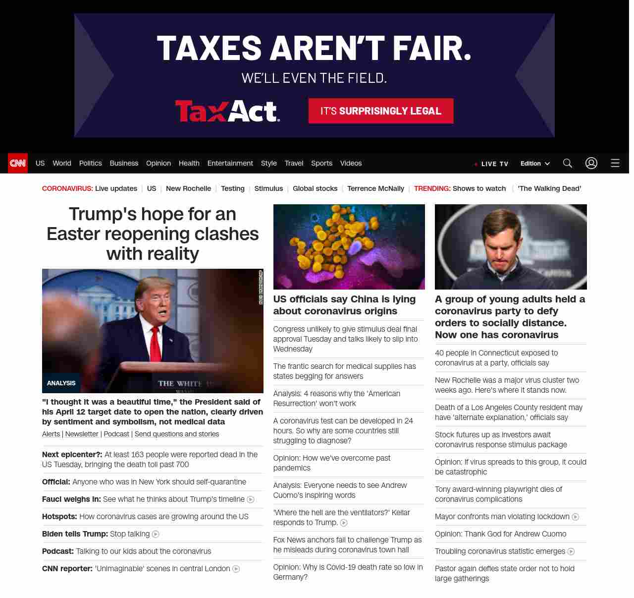 || screaming-banner-text banner-text-size–char-47″ data-analytics=”_list-hierarchical-xs_article_”> US sees deadliest day as coronavirus spreads ||” , title: “CNN – Breaking News, Latest News and Videos” , siblings: {“articleList”:[{“uri”:”/2020/03/25/politics/donald-trump-coronavirus/index.html”,”headline”:”u003cstrong>”I thought it was a beautiful time,” the President said of his April 12 target date to open the nation, clearly driven by sentiment and symbolism, not medical data u003c/strong>”,”thumbnail”:”//cdn.cnn.com/cnnnext/dam/assets/200324175730-03-coronavirus-task-force-briefing-0324-small-11.jpg”,”duration”:””,”description”:”u003ca href=”https://www.cnn.com/specials/mobile-apps” target=”_blank”>Alertsu003c/a> | u003ca href=”https://www.cnn.com/specials/coronavirus-newsletter?utm_source=hp&source=hp” target=”_blank”>Newsletteru003c/a> | u003ca href=”https://www.cnn.com/audio/podcasts/corona-virus”>Podcastu003c/a> | u003ca href=”http://www.cnn.com/2020/03/20/us/coronavirus-healthcare-worker-callout/index.html” target=”_blank”>Send questions and storiesu003c/a>”,”layout”:””