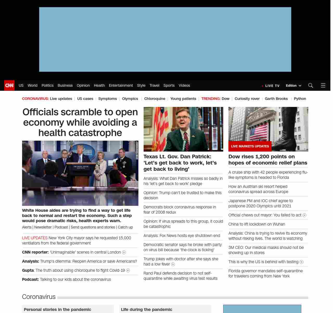 || screaming-banner-text banner-text-size–char-47″ data-analytics=”_list-hierarchical-xs_article_”> Officials scramble to open economy while avoiding a health catastrophe ||” , title: “CNN – Breaking News, Latest News and Videos” , siblings: {“articleList”:[{“uri”:”/2020/03/24/politics/trump-coronavirus-economy-open-health/index.html”,”headline”:”u003cstrong>White House aides are trying to find a way to get life back to normal and restart the economy. Such a step would pose dramatic risks, health experts warn.u003c/strong>”,”thumbnail”:”//cdn.cnn.com/cnnnext/dam/assets/200323232357-08-coronavirus-presser-0323-trump-small-11.jpg”,”duration”:””,”description”:”u003ca href=”https://www.cnn.com/specials/mobile-apps” target=”_blank”>Alertsu003c/a> | u003ca href=”https://www.cnn.com/specials/coronavirus-newsletter?utm_source=hp&source=hp” target=”_blank”>Newsletteru003c/a> | u003ca href=”https://www.cnn.com/audio/podcasts/corona-virus”>Podcastu003c/a> | u003ca href=”http://www.cnn.com/2020/03/20/us/coronavirus-healthcare-worker-callout/index.html” target=”_blank”>Send questions and storiesu003c/a> | u003ca href=”https://www.cnn.com/2020/03/24/world/coronavirus-newsletter-03-24-20/index.html” target=”_blank”>Catch upu003c/a>”,”layout”:””