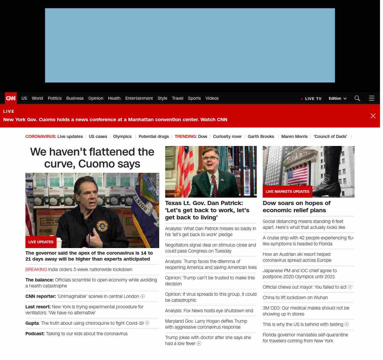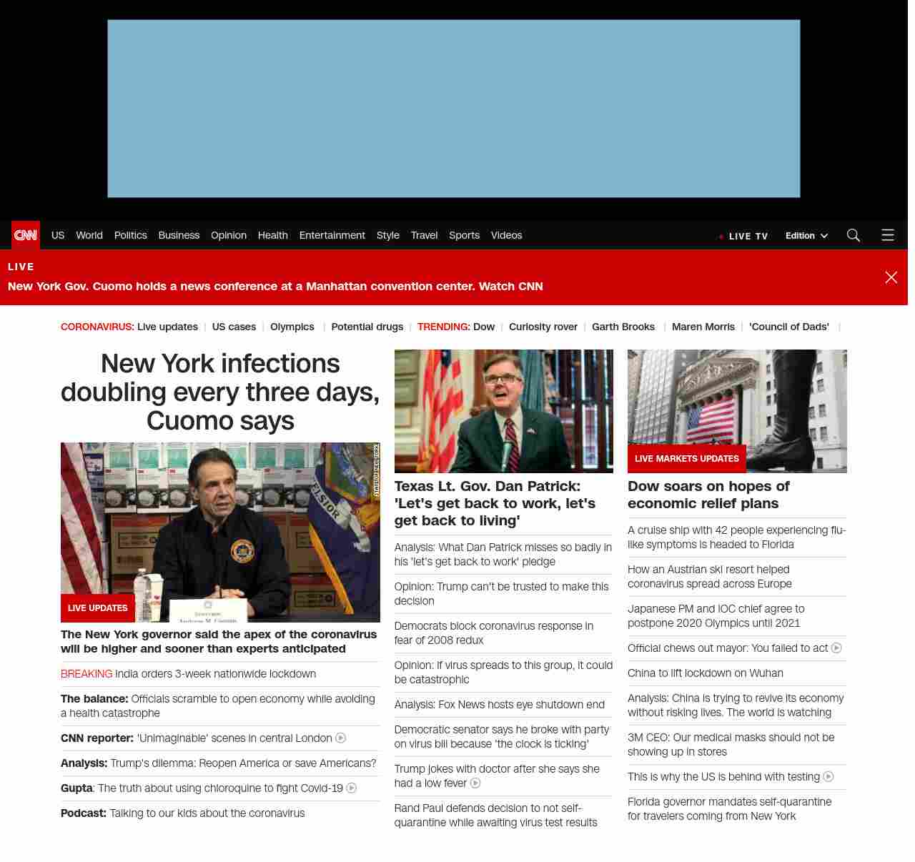 || screaming-banner-text banner-text-size–char-47″ data-analytics=”_list-hierarchical-xs_hyperlink_”> New York infections doubling every three days, Cuomo says ||” , title: “CNN – Breaking News, Latest News and Videos” , siblings: {“articleList”:[{“uri”:”/2020/03/24/politics/trump-coronavirus-economy-open-health/index.html”,”headline”:”u003cstrong>The balance:u003c/strong> Officials scramble to open economy while avoiding a health catastrophe”,”thumbnail”:”//cdn.cnn.com/cnnnext/dam/assets/200323232357-08-coronavirus-presser-0323-trump-small-11.jpg”,”duration”:””,”description”:”u003ca href=”https://www.cnn.com/specials/mobile-apps” target=”_blank”>Alertsu003c/a> | u003ca href=”https://www.cnn.com/specials/coronavirus-newsletter?utm_source=hp&source=hp” target=”_blank”>Newsletteru003c/a> | u003ca href=”https://www.cnn.com/audio/podcasts/corona-virus”>Podcastu003c/a> | u003ca href=”http://www.cnn.com/2020/03/20/us/coronavirus-healthcare-worker-callout/index.html” target=”_blank”>Send questions and storiesu003c/a> | u003ca href=”https://www.cnn.com/2020/03/24/world/coronavirus-newsletter-03-24-20/index.html” target=”_blank”>Catch upu003c/a>”,”layout”:””