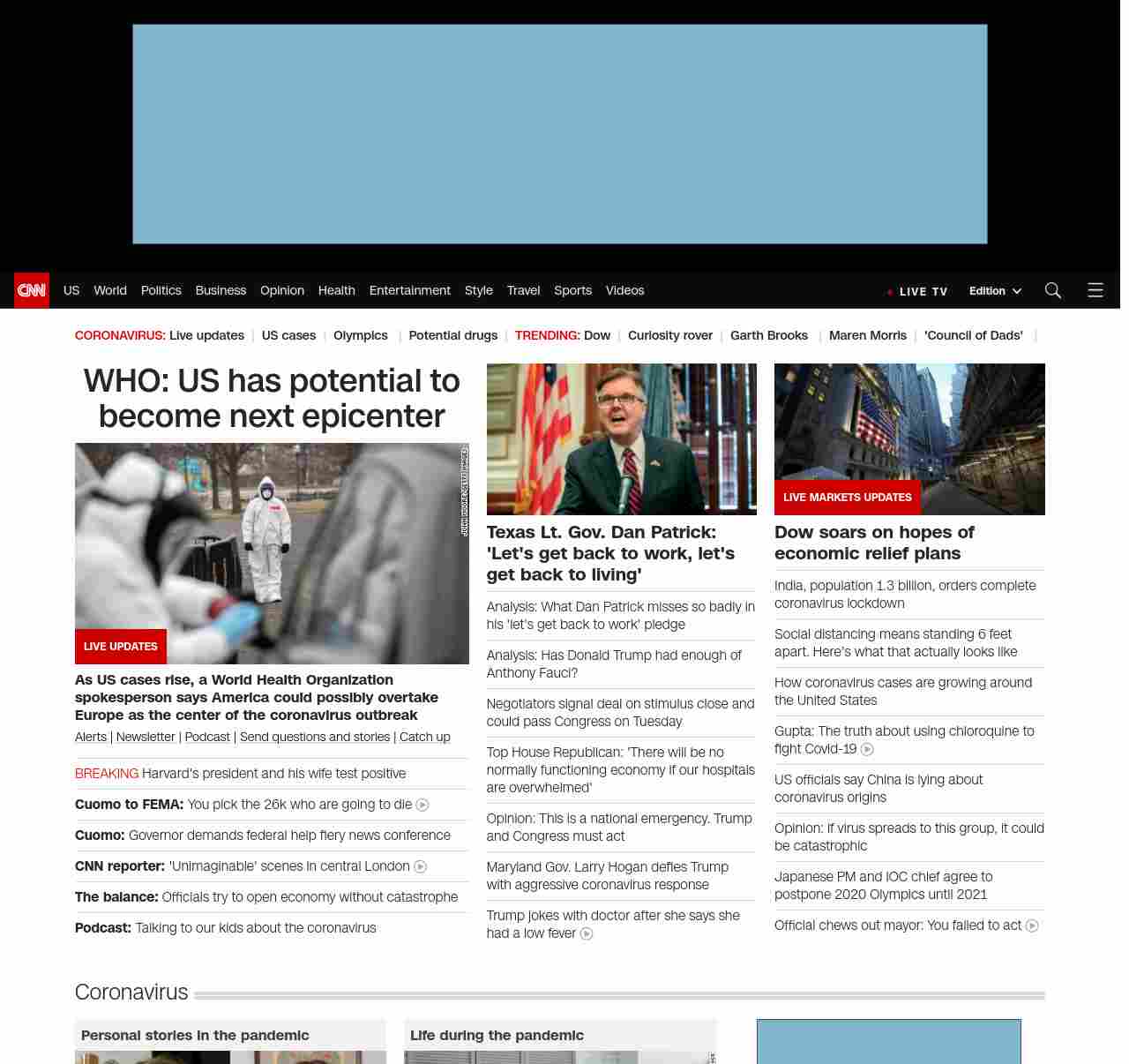 || screaming-banner-text banner-text-size–char-47″ data-analytics=”_list-hierarchical-xs_hyperlink_”> WHO: US has potential to become next epicenter ||” , title: “CNN – Breaking News, Latest News and Videos” , siblings: {“articleList”:[{“uri”:”/2020/03/24/us/harvard-president-wife-coronavirus-positive-test-trnd/index.html”,”headline”:”Harvard’s president and his wife test positive”,”thumbnail”:”//cdn.cnn.com/cnnnext/dam/assets/200324121048-lawrence-bacow-wife-file-small-11.jpg”,”duration”:””,”description”:”Harvard President Lawrence S. Bacow said he and his wife have tested positive for coronavirus.”,”layout”:””