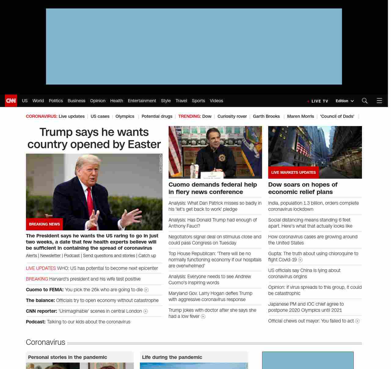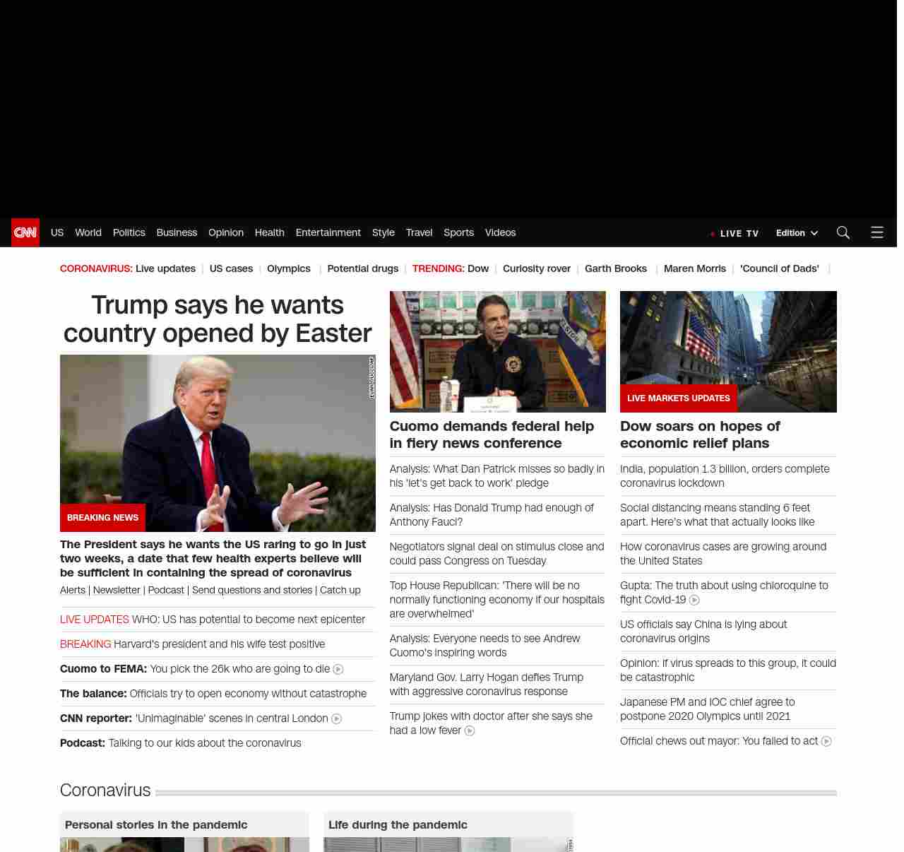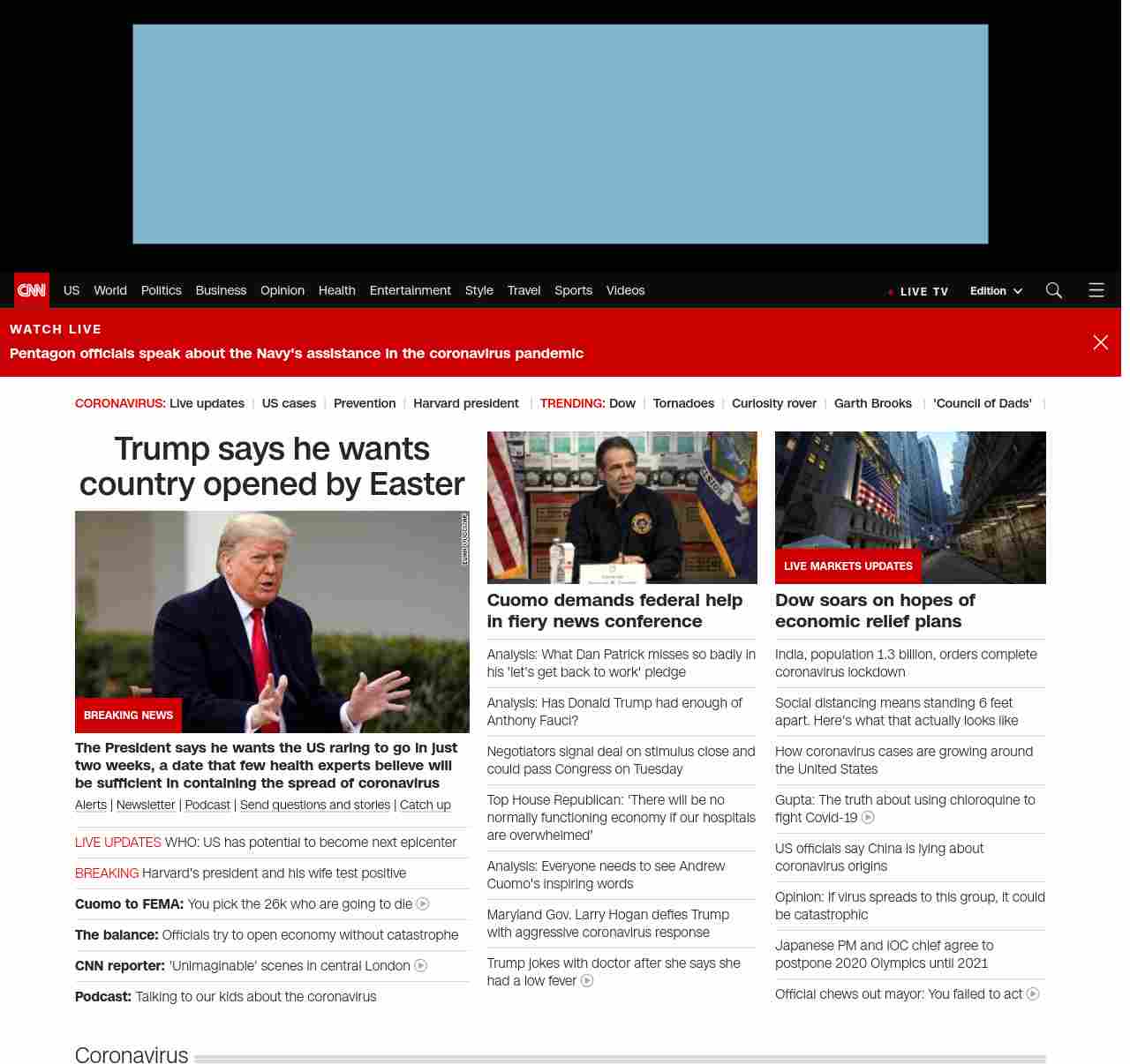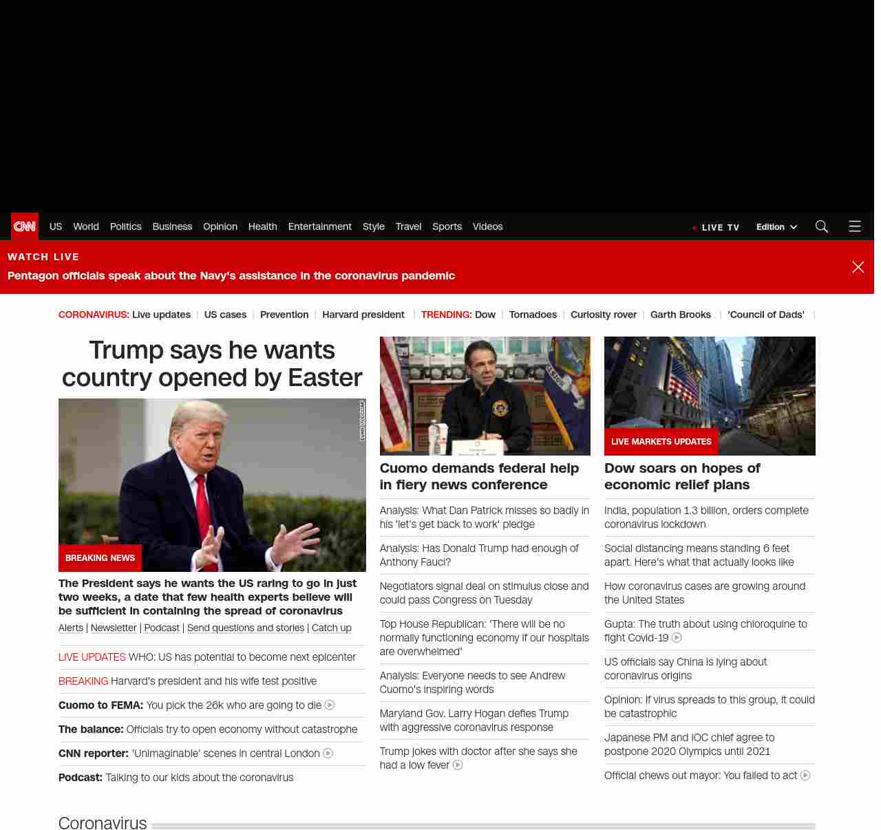 || screaming-banner-text banner-text-size–char-47″ data-analytics=”_list-hierarchical-xs_article_”> Trump says he wants country opened by Easter ||” , title: “CNN – Breaking News, Latest News and Videos” , siblings: {“articleList”:[{“uri”:”/2020/03/24/politics/trump-easter-economy-coronavirus/index.html”,”headline”:”The President says he wants the US raring to go in just two weeks, a date that few health experts believe will be sufficient in containing the spread of coronavirus”,”thumbnail”:”//cdn.cnn.com/cnnnext/dam/assets/200324132046-01-trump-virtual-town-hall-0324-small-11.jpg”,”duration”:””,”description”:”u003ca href=”https://www.cnn.com/specials/mobile-apps” target=”_blank”>Alertsu003c/a> | u003ca href=”https://www.cnn.com/specials/coronavirus-newsletter?utm_source=hp&source=hp” target=”_blank”>Newsletteru003c/a> | u003ca href=”https://www.cnn.com/audio/podcasts/corona-virus”>Podcastu003c/a> | u003ca href=”http://www.cnn.com/2020/03/20/us/coronavirus-healthcare-worker-callout/index.html” target=”_blank”>Send questions and storiesu003c/a> | u003ca href=”https://www.cnn.com/2020/03/24/world/coronavirus-newsletter-03-24-20/index.html” target=”_blank”>Catch upu003c/a>”,”layout”:””